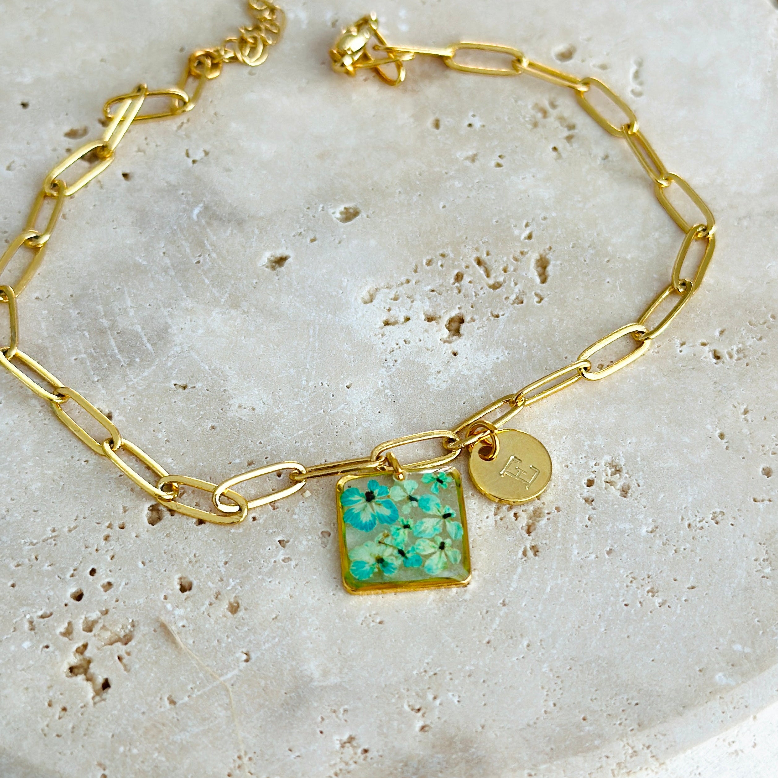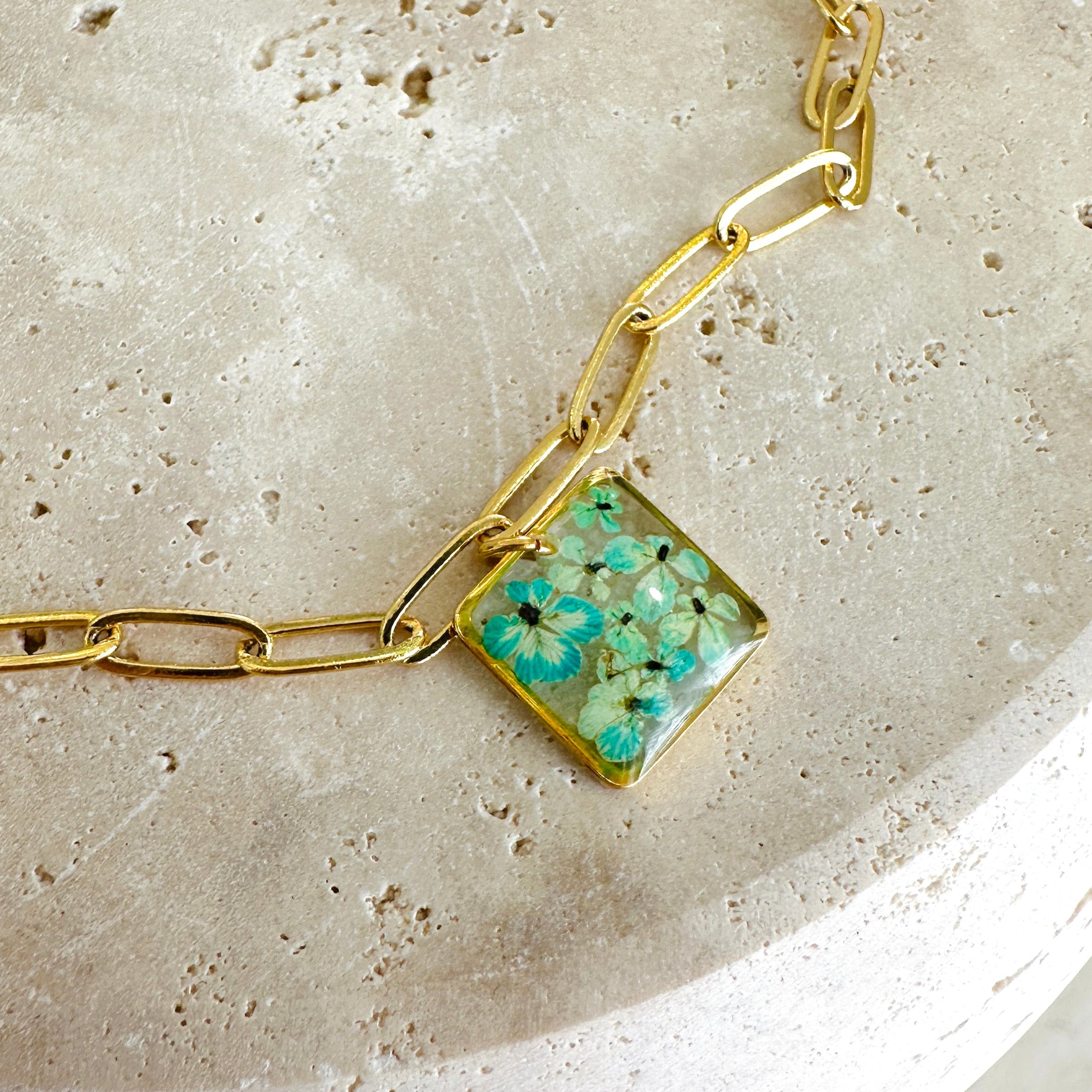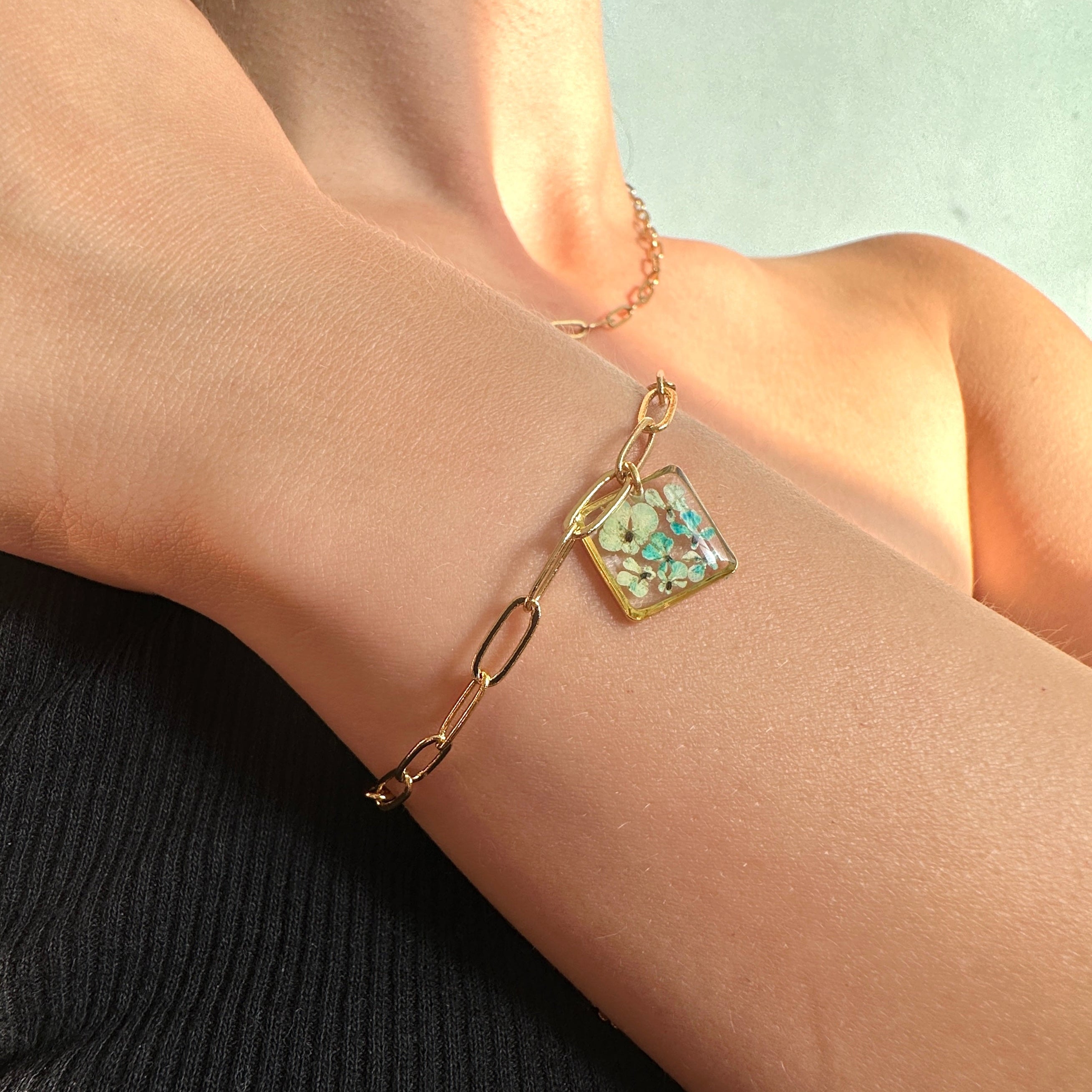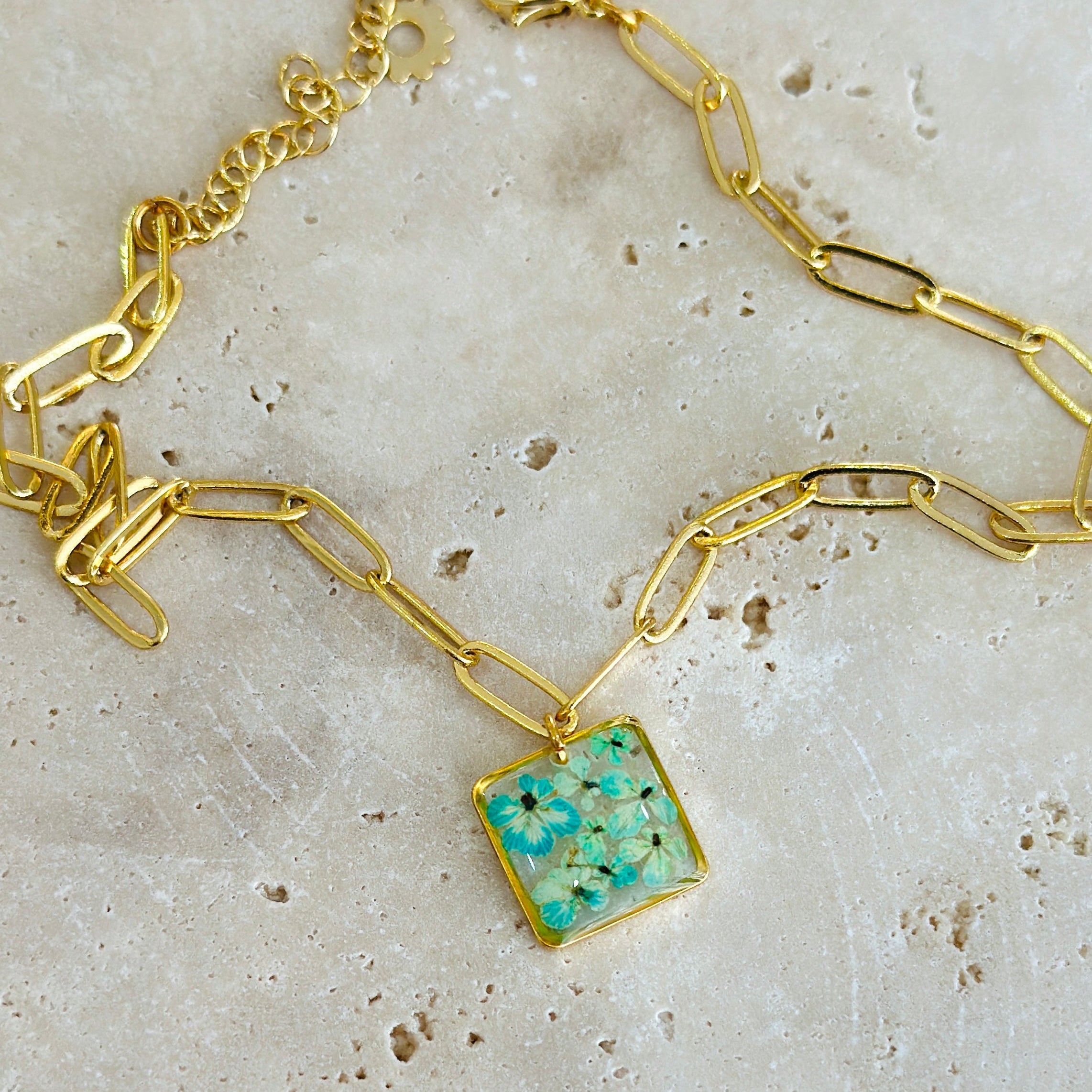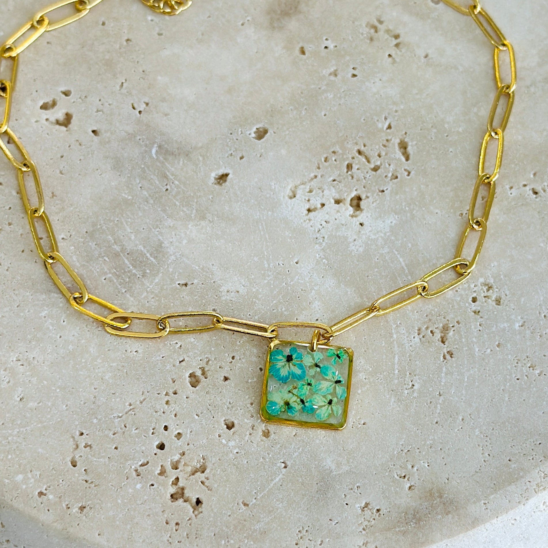 Çiçekler kuruma sürecini tamamladıktan sonra, her biri özenle minik parçalara ayrılır. Her bir çiçek parçası, reçine ile sabitlenerek koruma altına alınır. Bu sayede doğanın zarif dokusu uzun süre bozulmadan korunur ve takıların içinde ölümsüzleşir. Her detay, titizlikle işlenir ve takıya hayat verir.