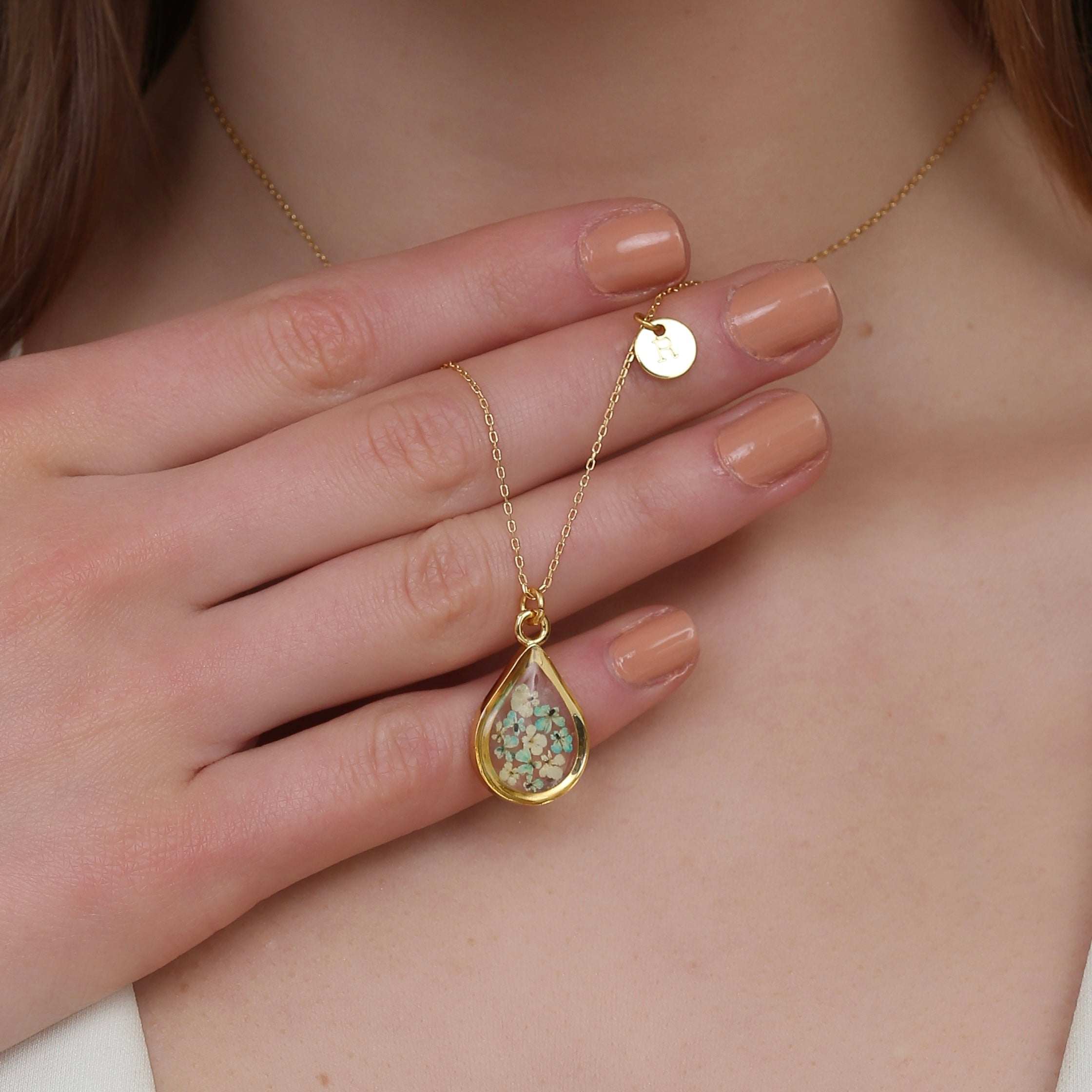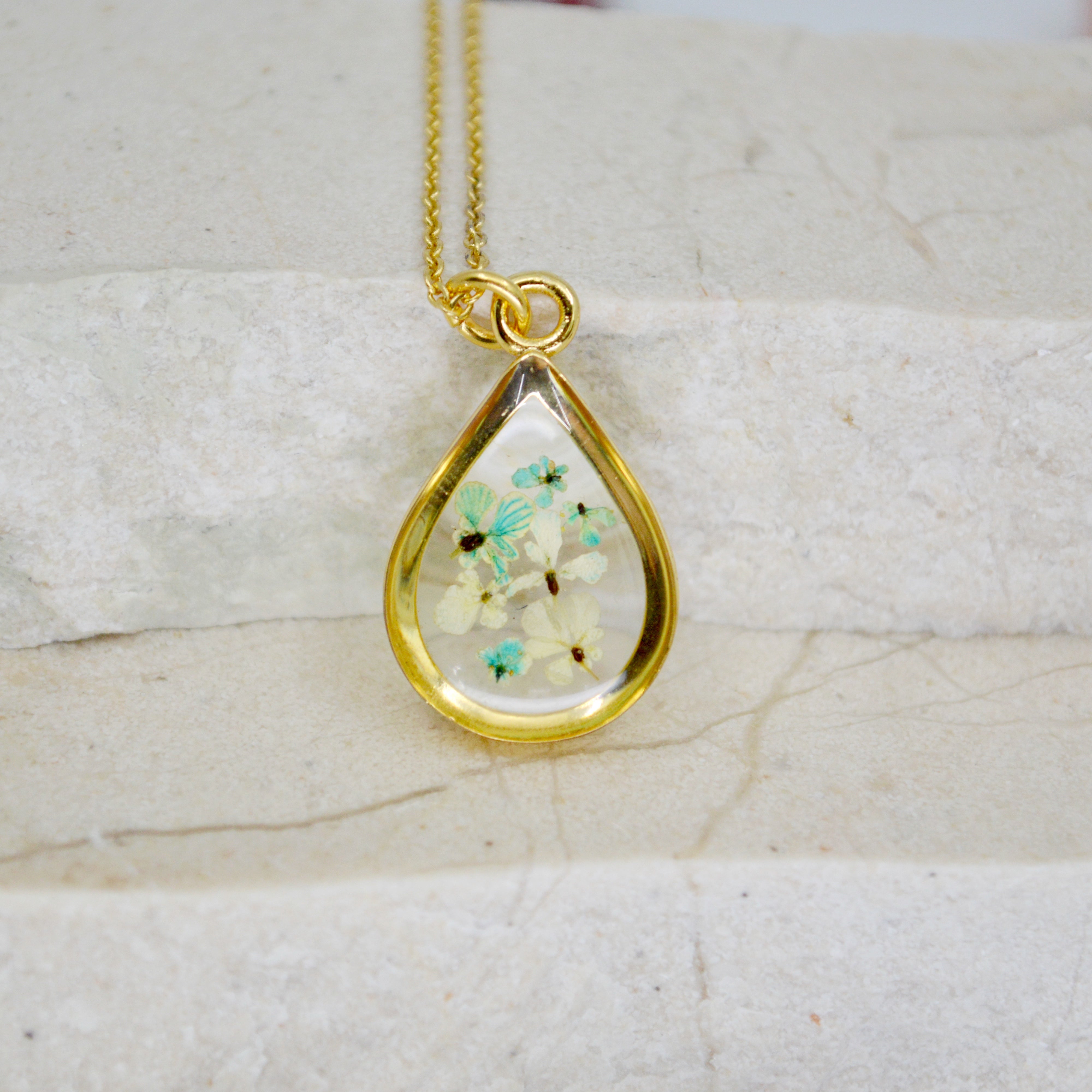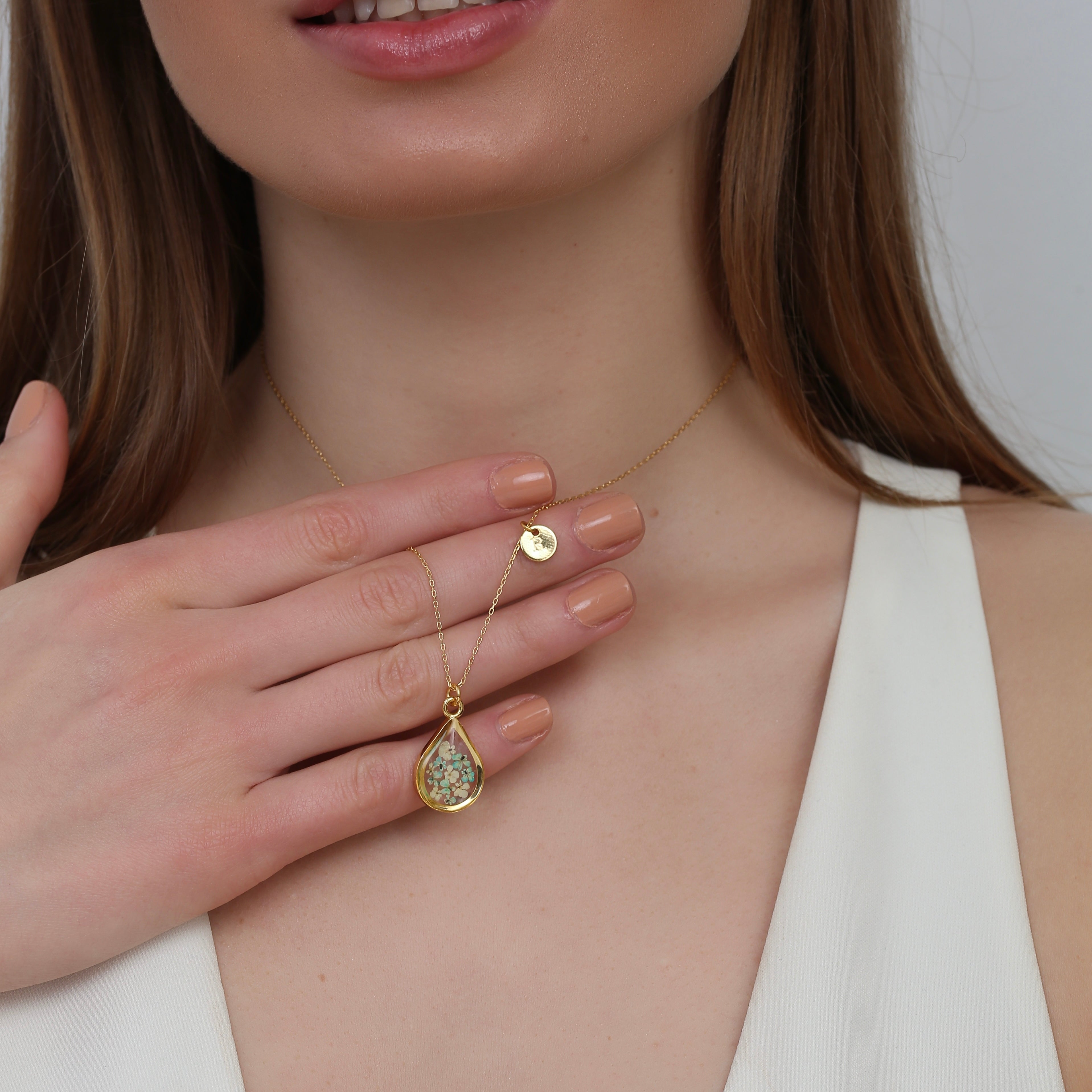 Çiçekler kuruma sürecini tamamladıktan sonra, her biri özenle minik parçalara ayrılır. Her bir çiçek parçası, reçine ile sabitlenerek koruma altına alınır. Bu sayede doğanın zarif dokusu uzun süre bozulmadan korunur ve takıların içinde ölümsüzleşir. Her detay, titizlikle işlenir ve takıya hayat verir.