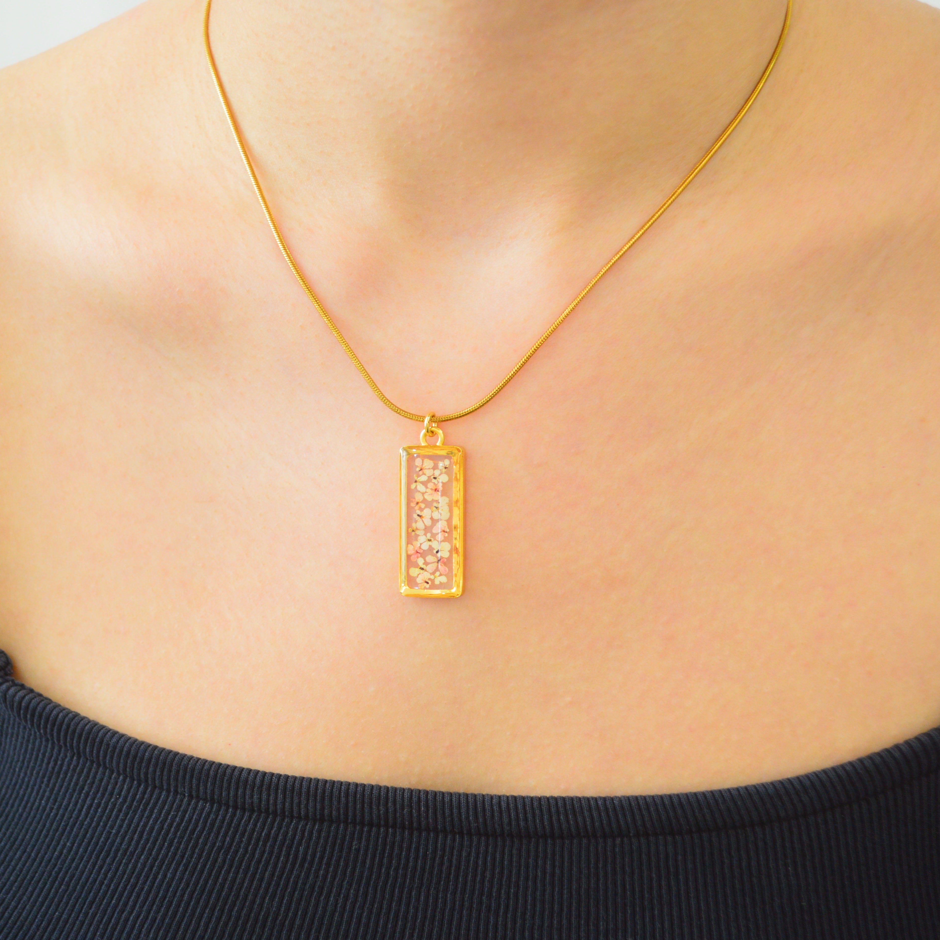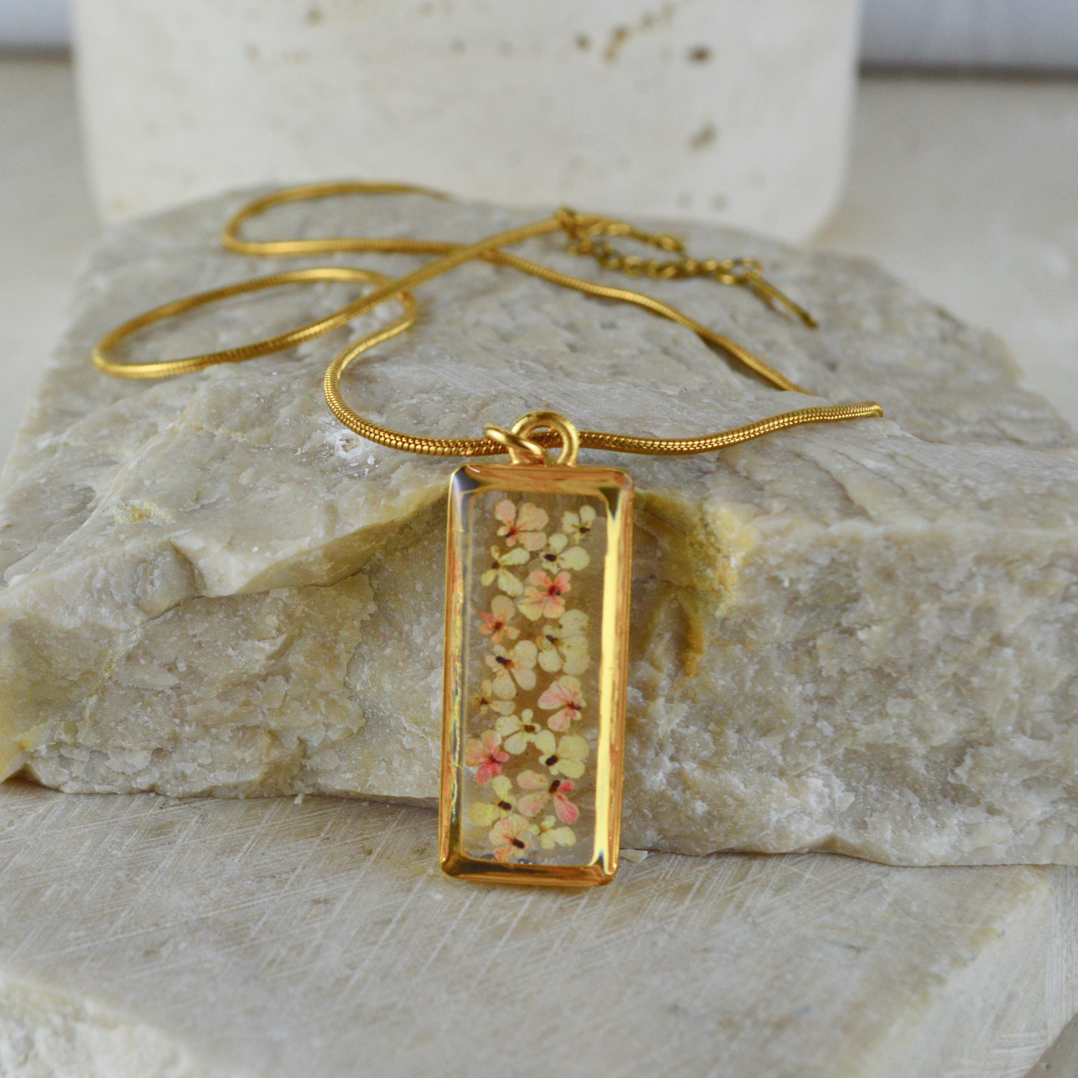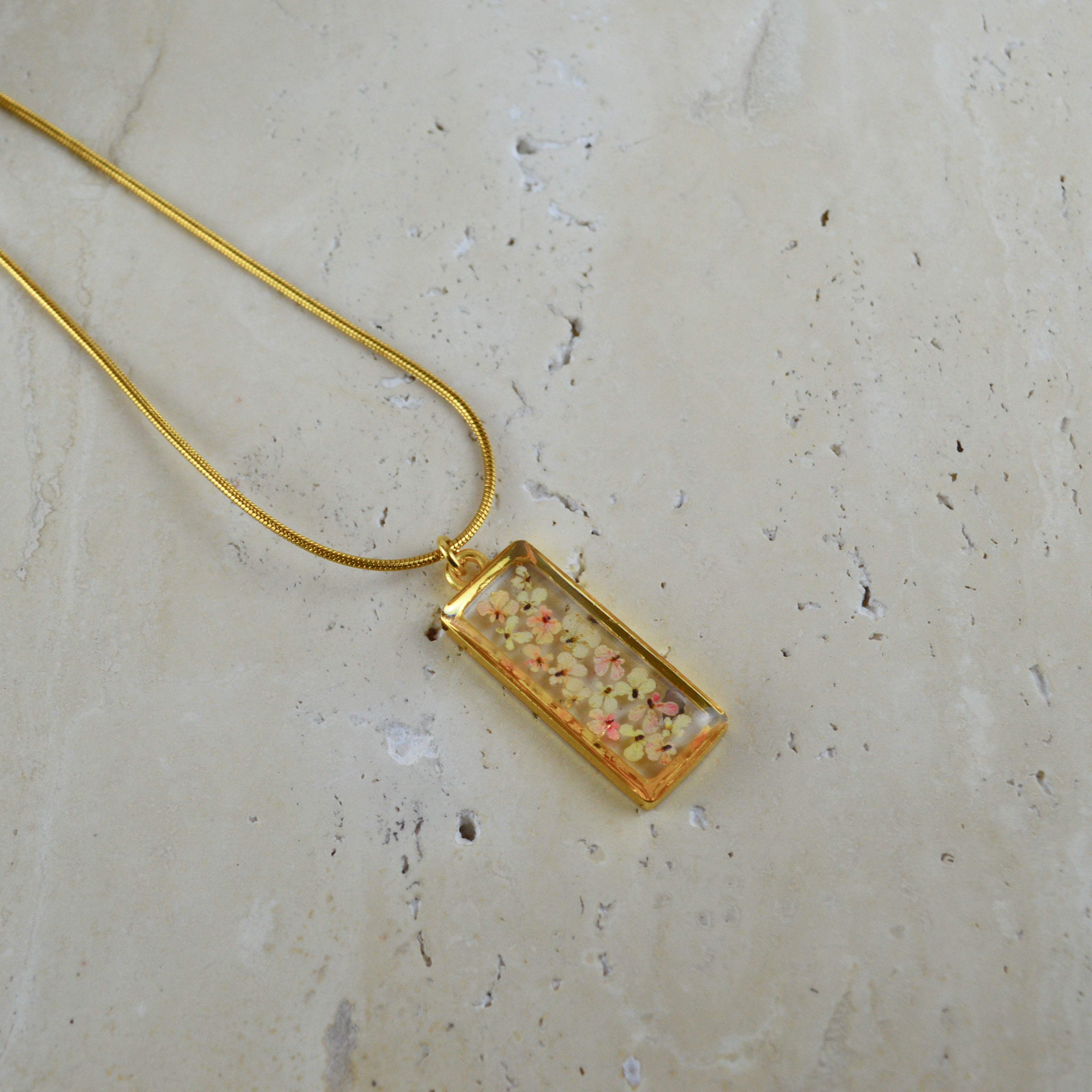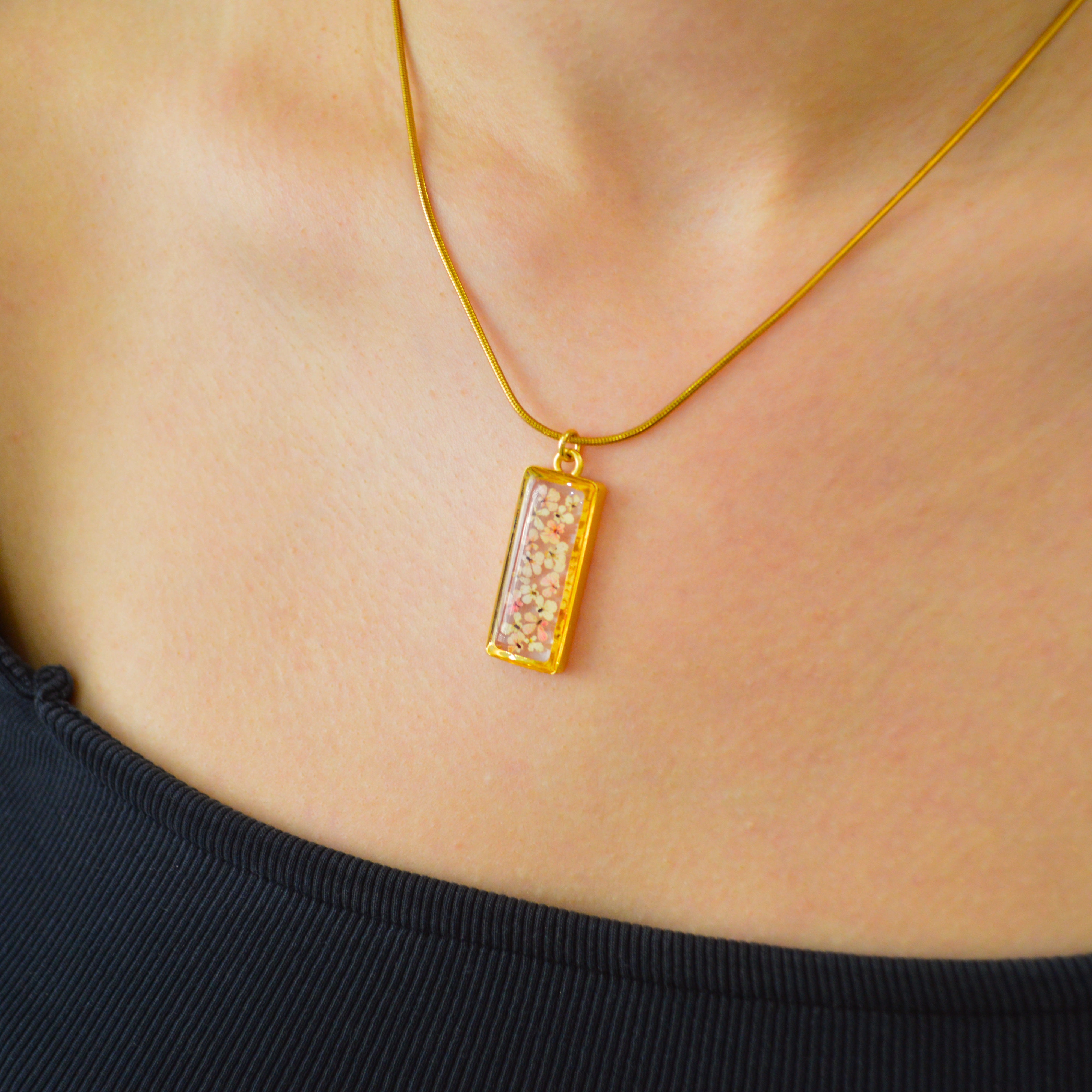 Çiçekler kuruma sürecini tamamladıktan sonra, her biri özenle minik parçalara ayrılır. Her bir çiçek parçası, reçine ile sabitlenerek koruma altına alınır. Bu sayede doğanın zarif dokusu uzun süre bozulmadan korunur ve takıların içinde ölümsüzleşir. Her detay, titizlikle işlenir ve takıya hayat verir.