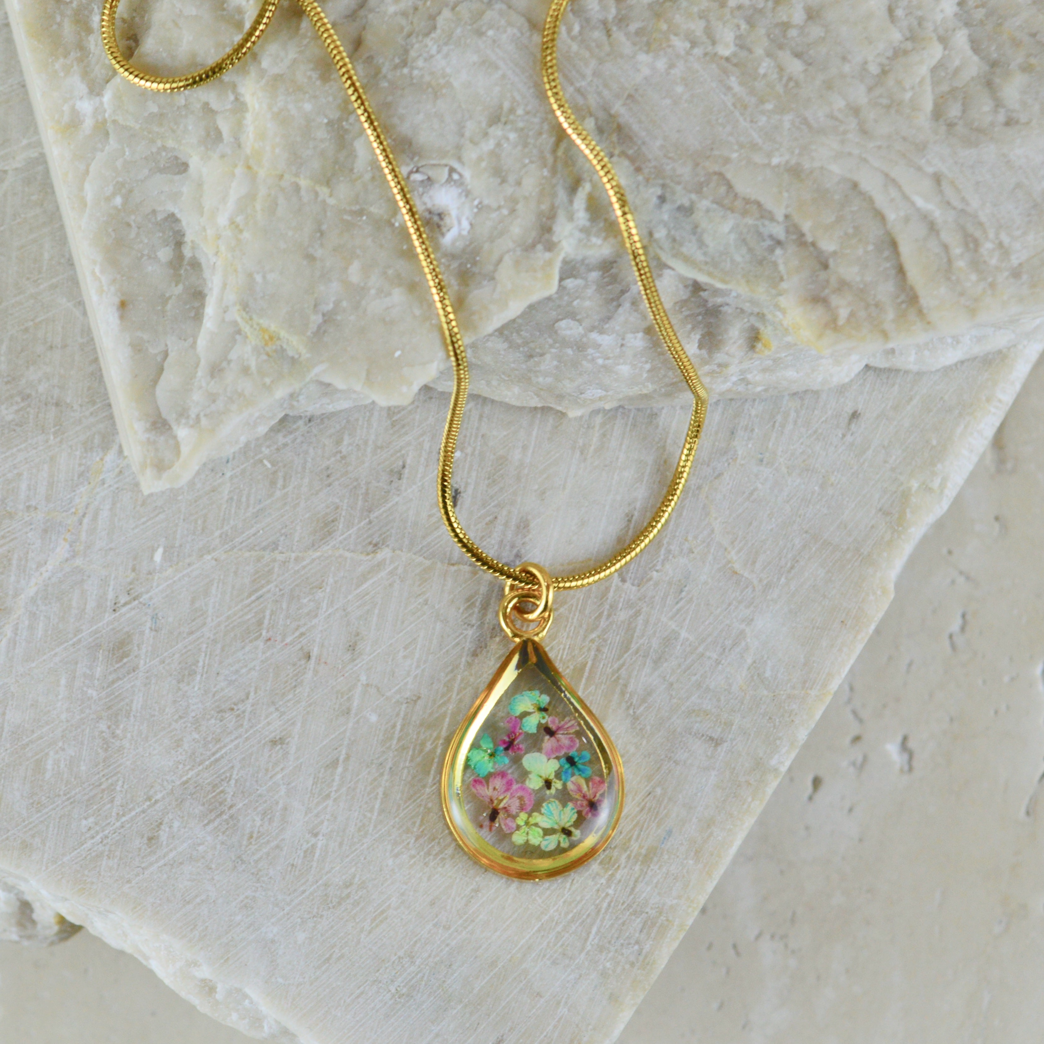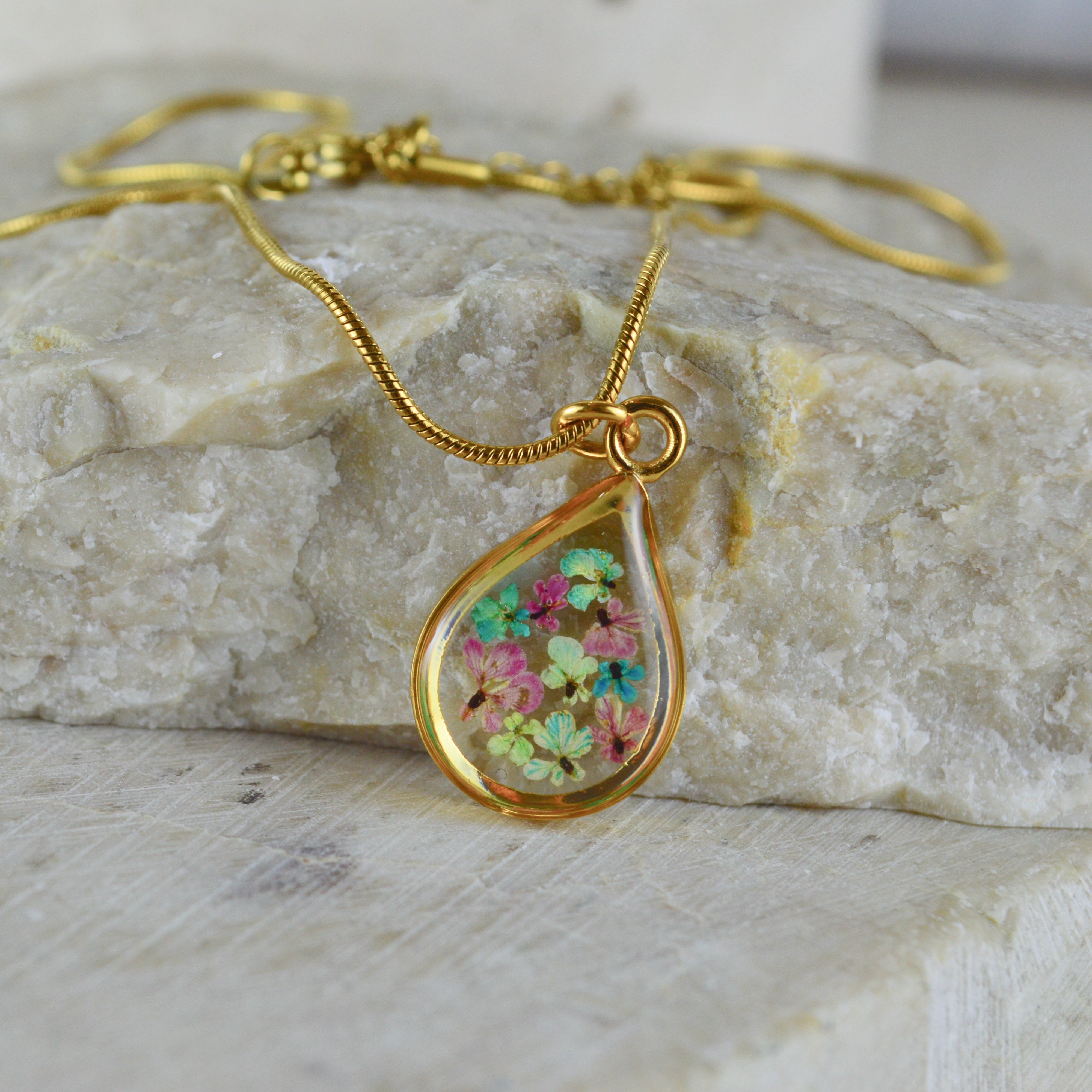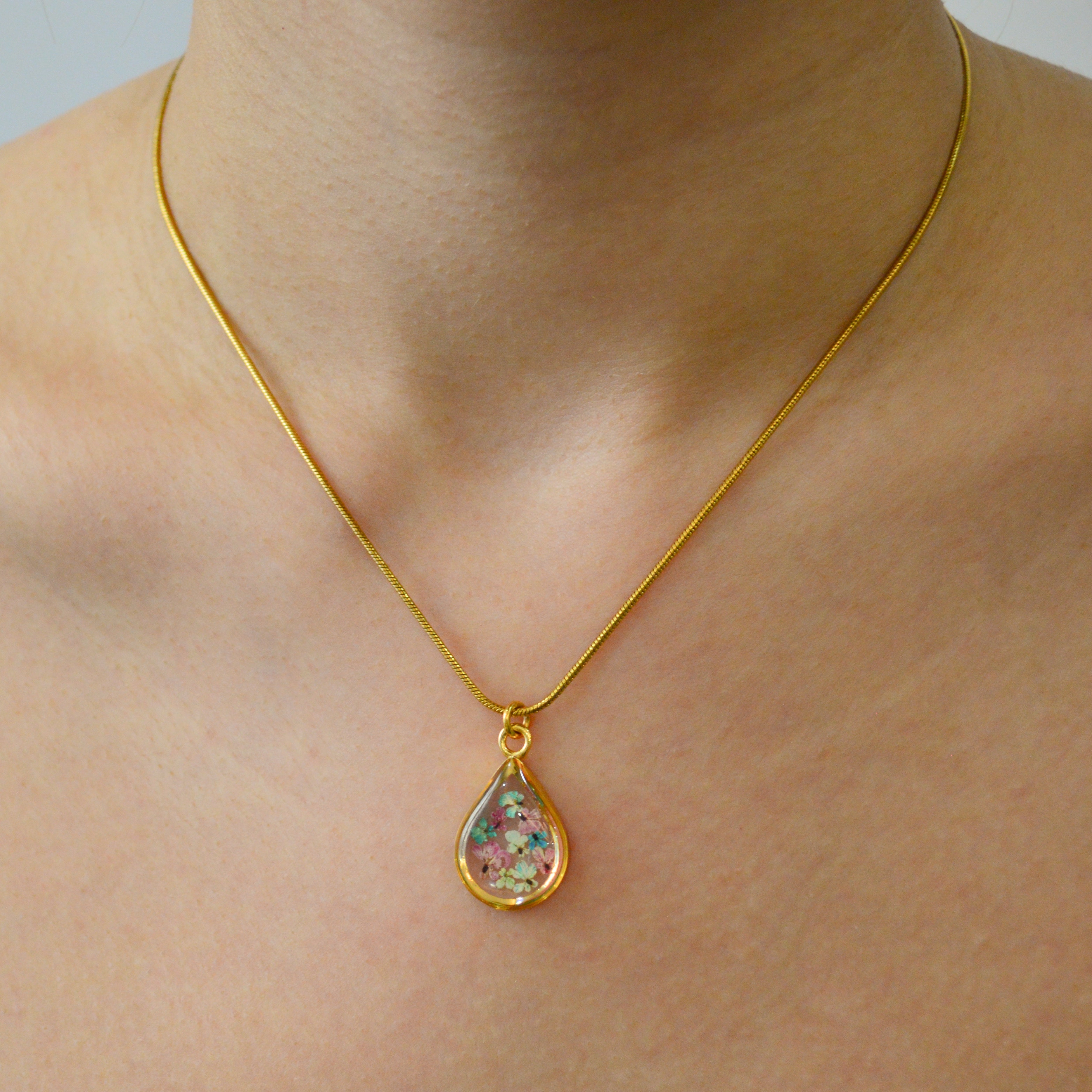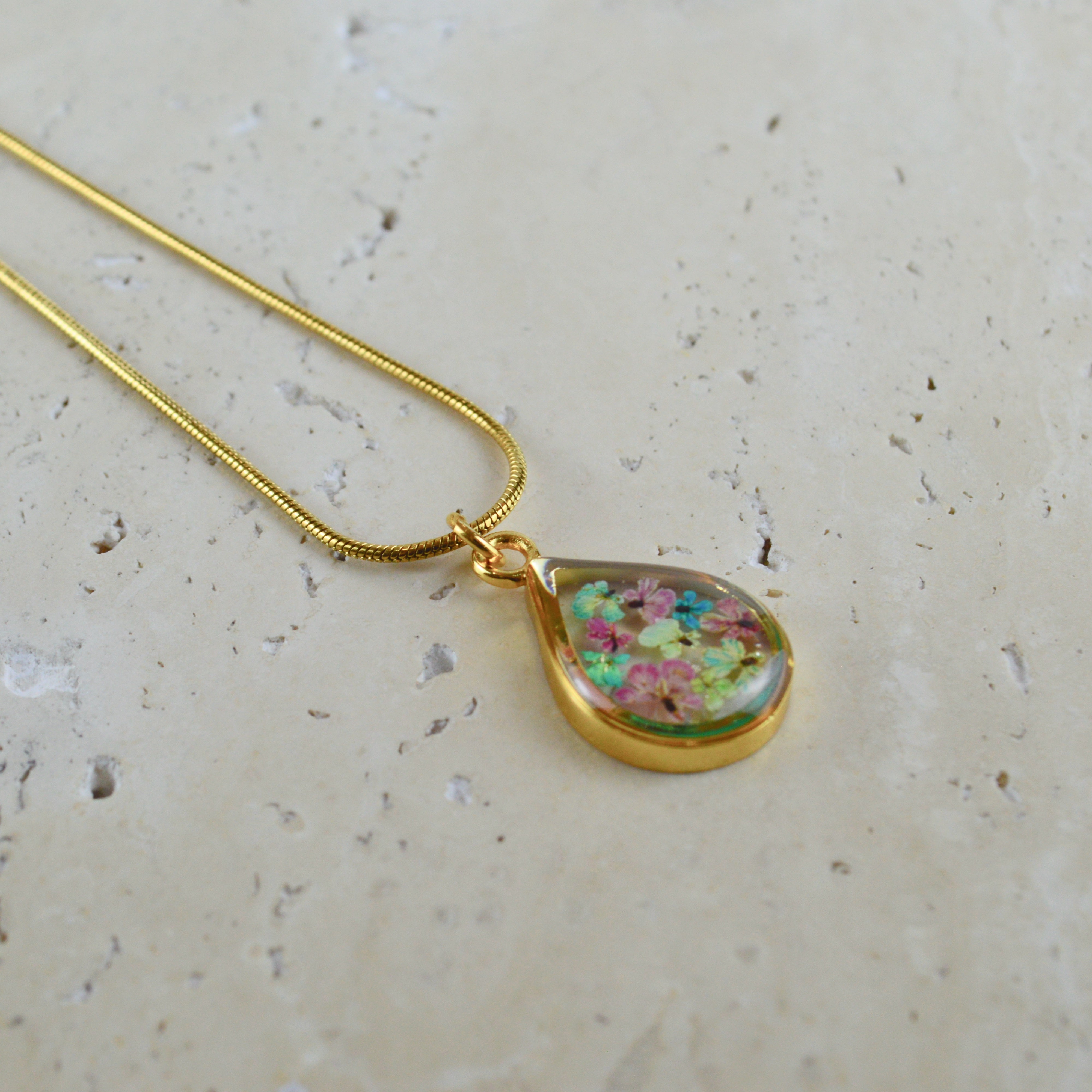 Çiçekler kuruma sürecini tamamladıktan sonra, her biri özenle minik parçalara ayrılır. Her bir çiçek parçası, reçine ile sabitlenerek koruma altına alınır. Bu sayede doğanın zarif dokusu uzun süre bozulmadan korunur ve takıların içinde ölümsüzleşir. Her detay, titizlikle işlenir ve takıya hayat verir.