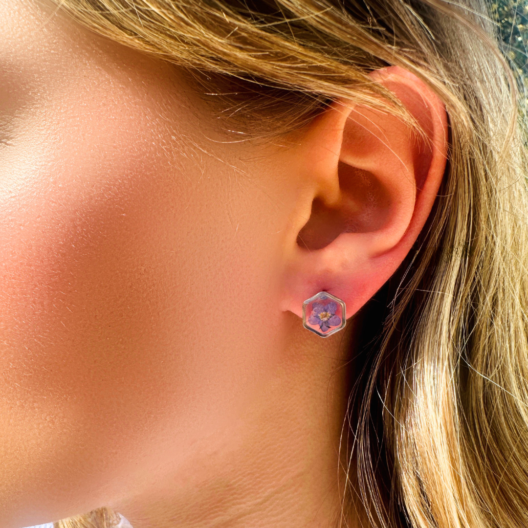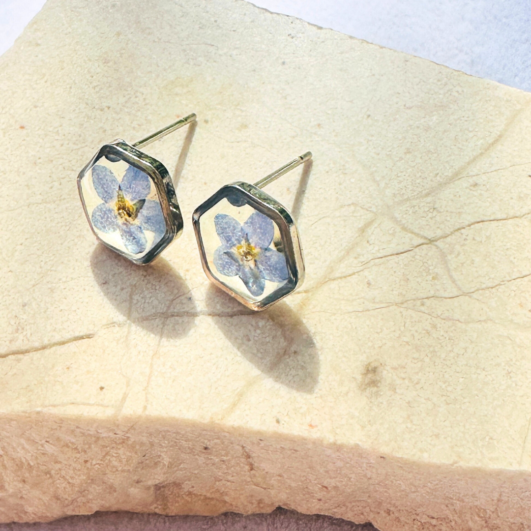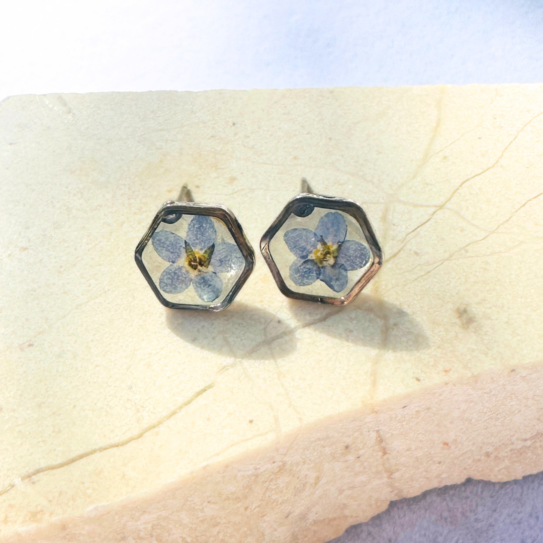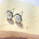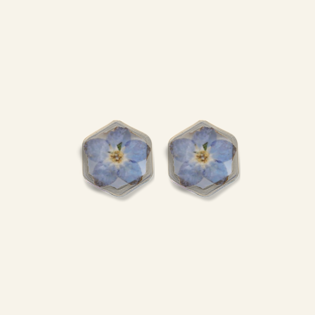 Teeny Weeny Hexagon Forget Me Not Küpe | Rhodium
