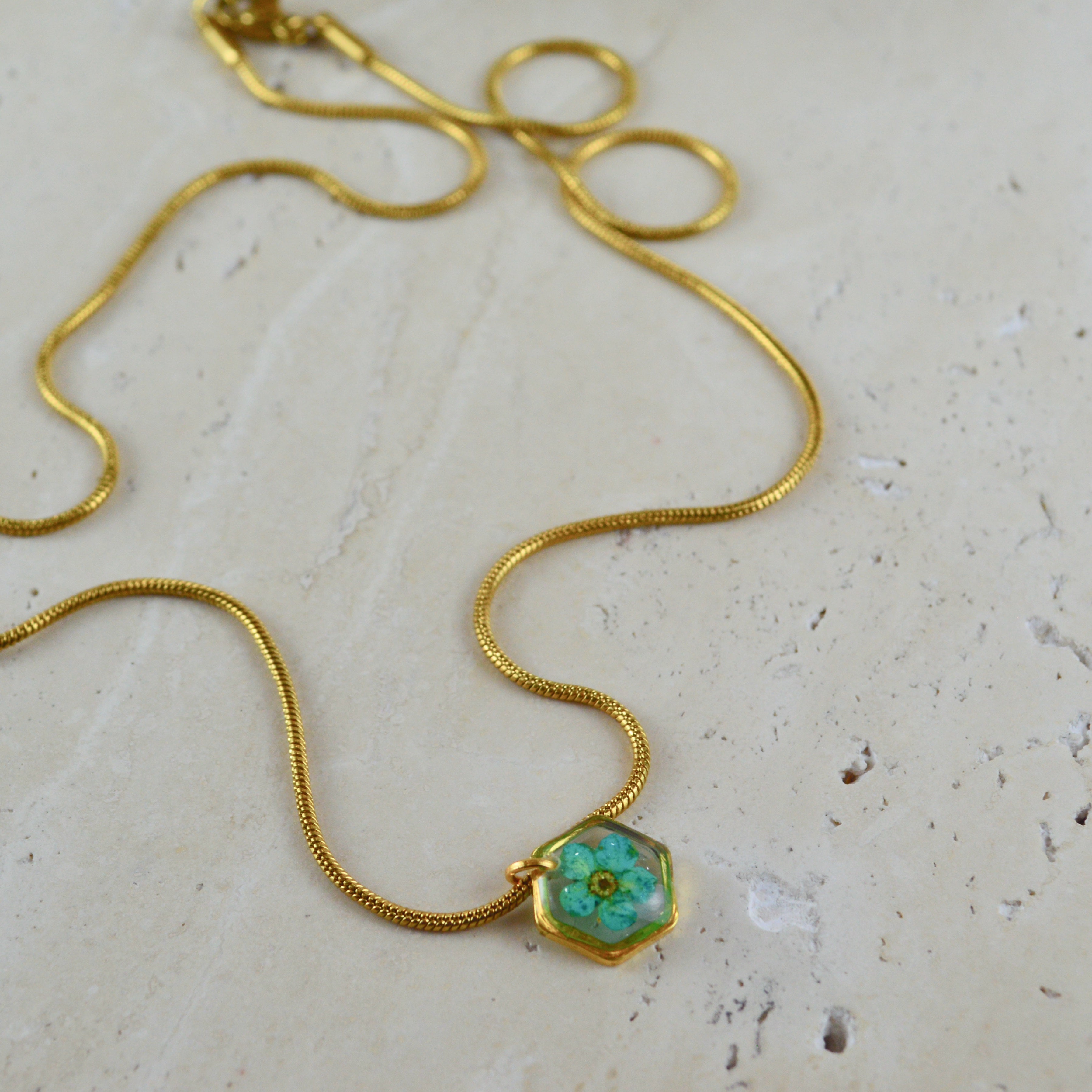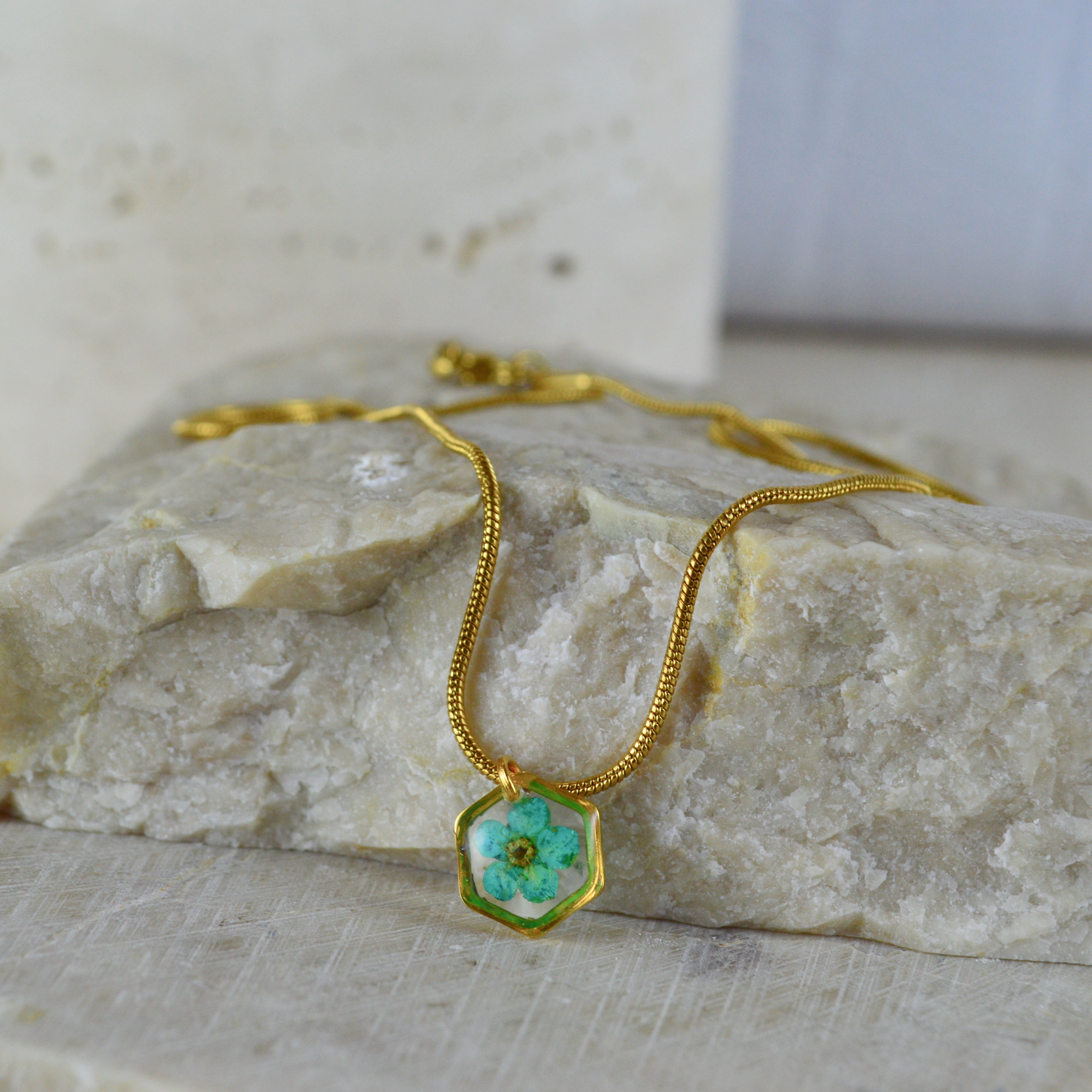 Çiçekler kuruma sürecini tamamladıktan sonra, her biri özenle minik parçalara ayrılır. Her bir çiçek parçası, reçine ile sabitlenerek koruma altına alınır. Bu sayede doğanın zarif dokusu uzun süre bozulmadan korunur ve takıların içinde ölümsüzleşir. Her detay, titizlikle işlenir ve takıya hayat verir.