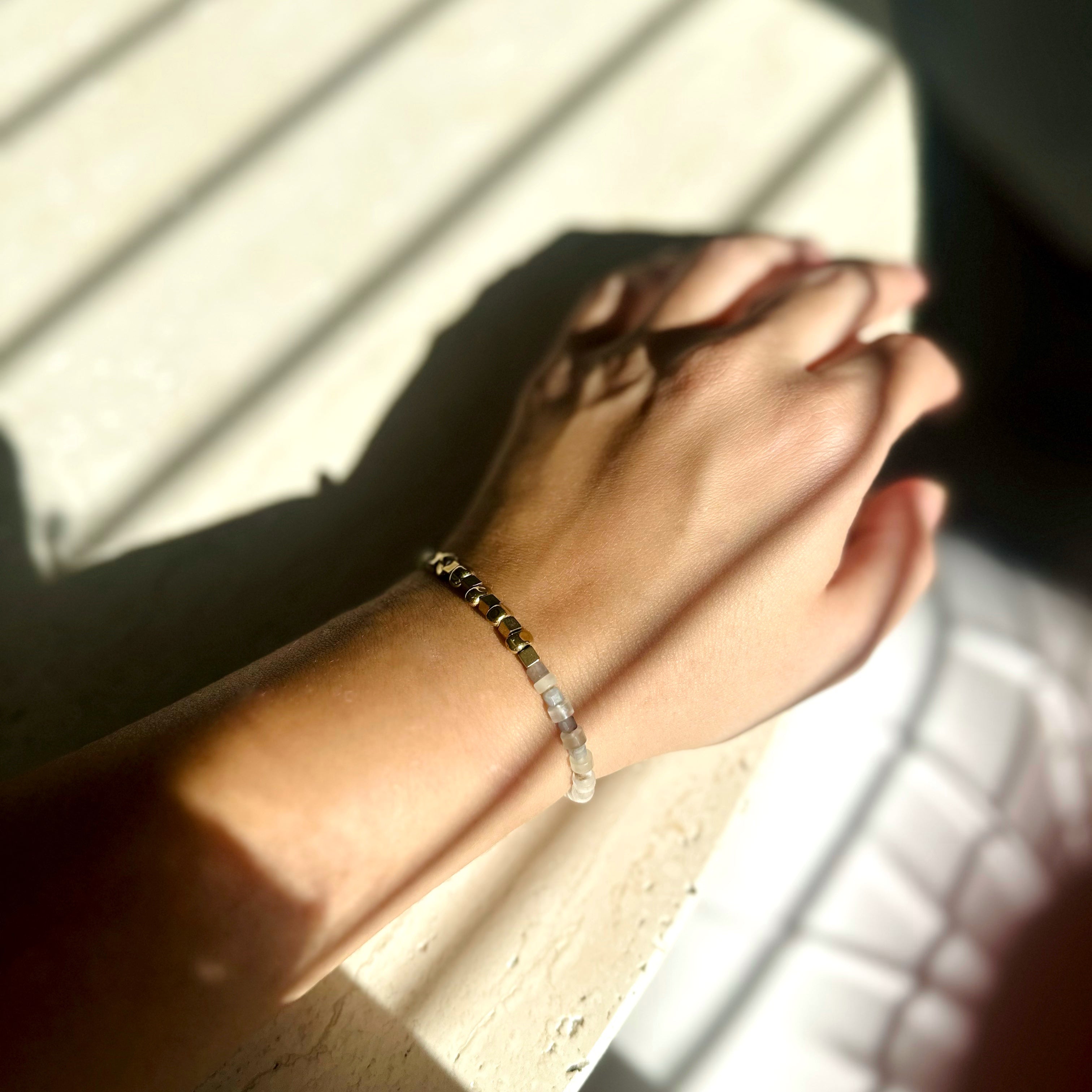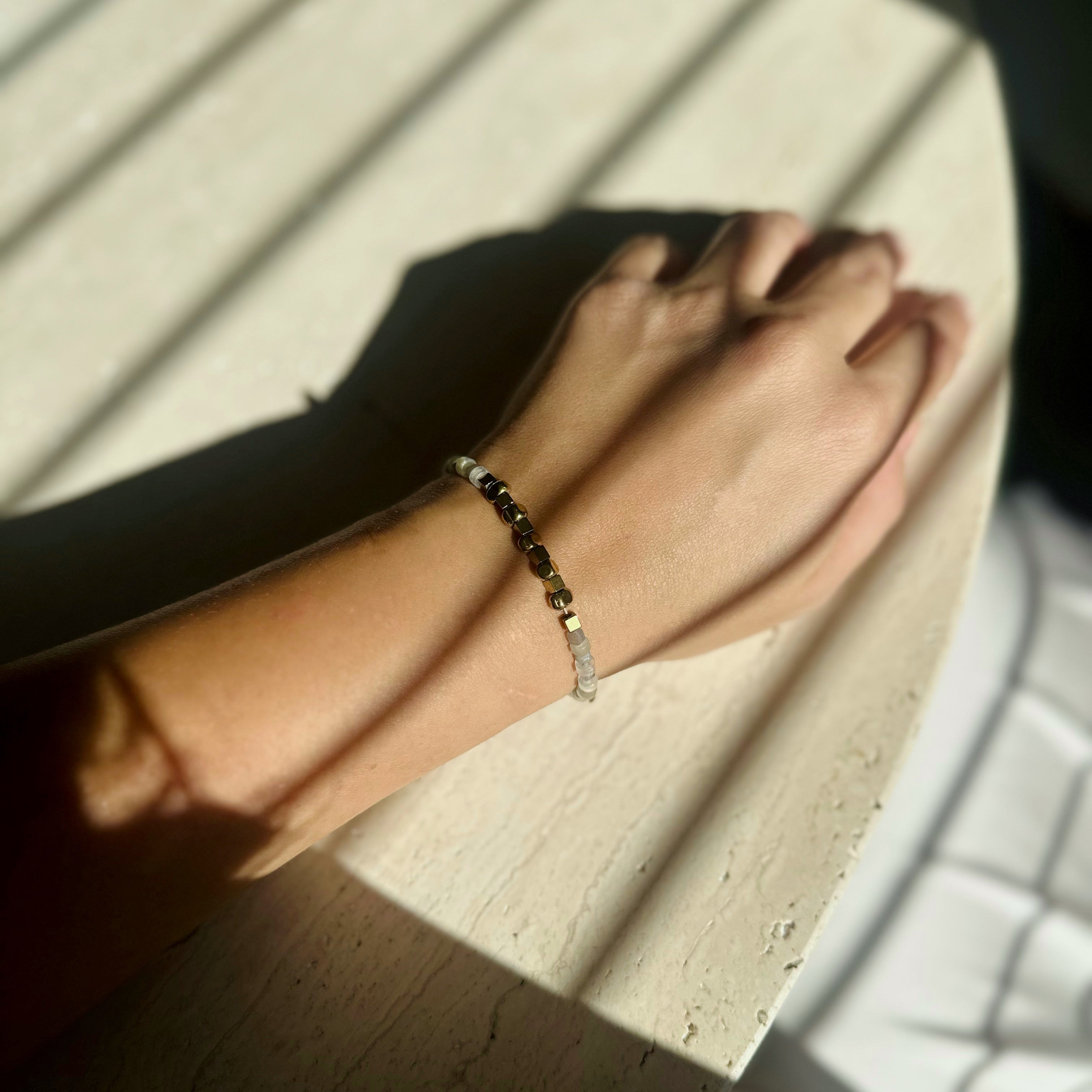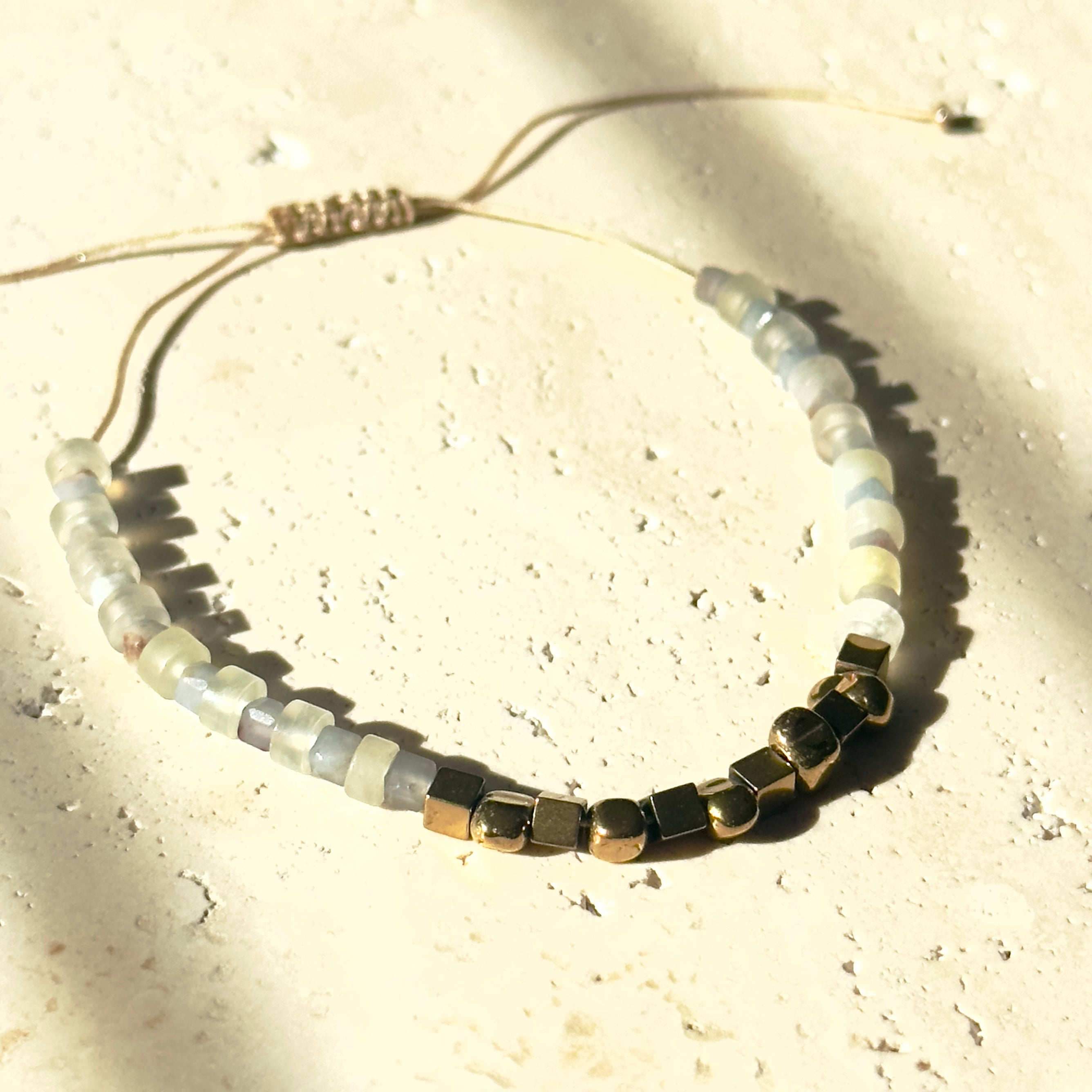 Anjelit ve hematit taşlarının uyumuyla tasarlanan bu bileklik, içsel denge ve güçlü bir enerji sunar.