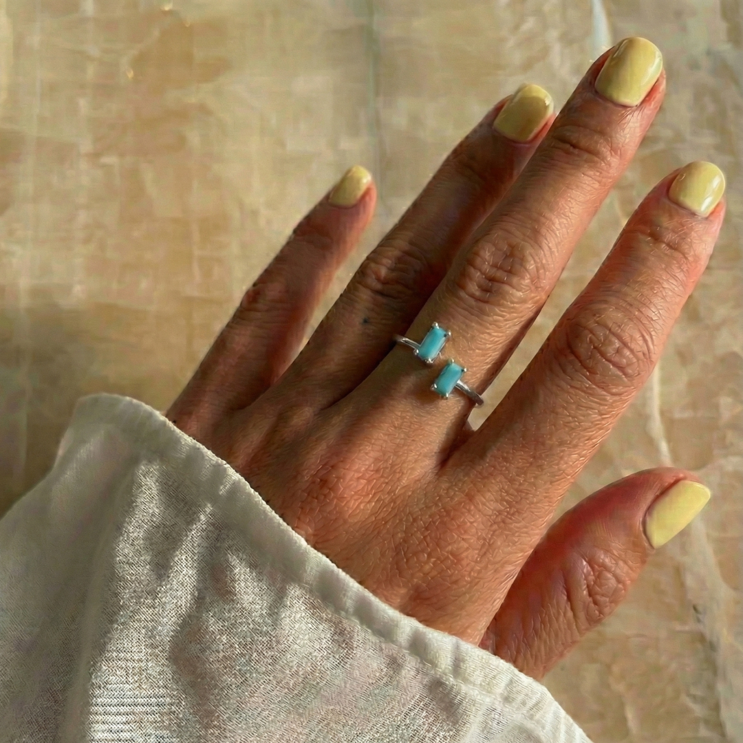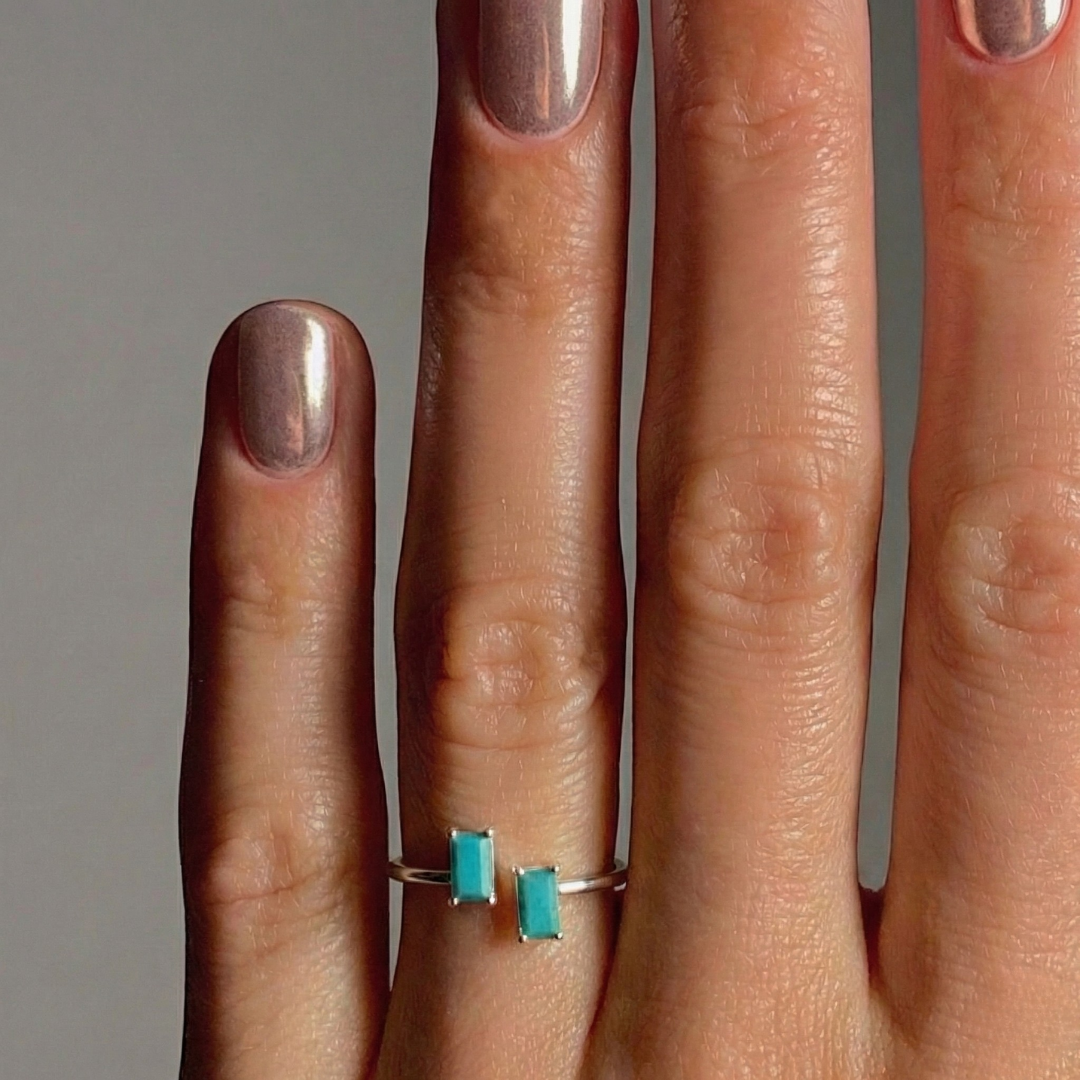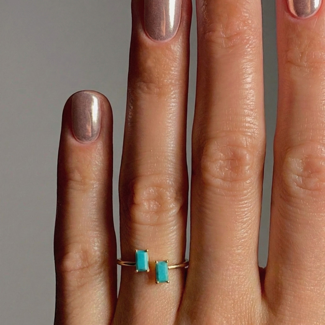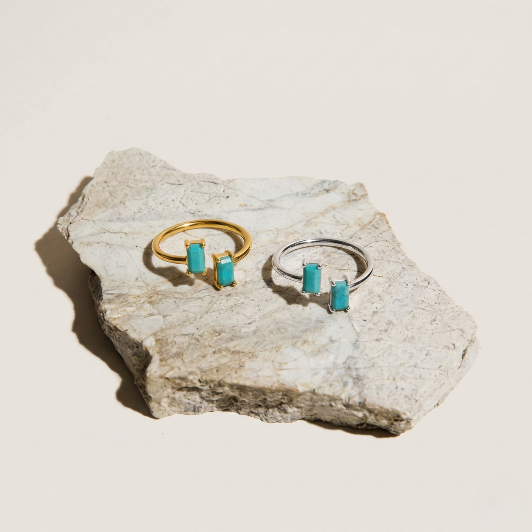 Doğanın en sakinleştirici tonlarından ilham alan bu özel 2’li turkuaz taşı yüzük, zamansız bir şıklığı günlük stile taşıyor. Turkuaz taşı aynı zamanda Firuze Taşı olarak da isimlendirilir.