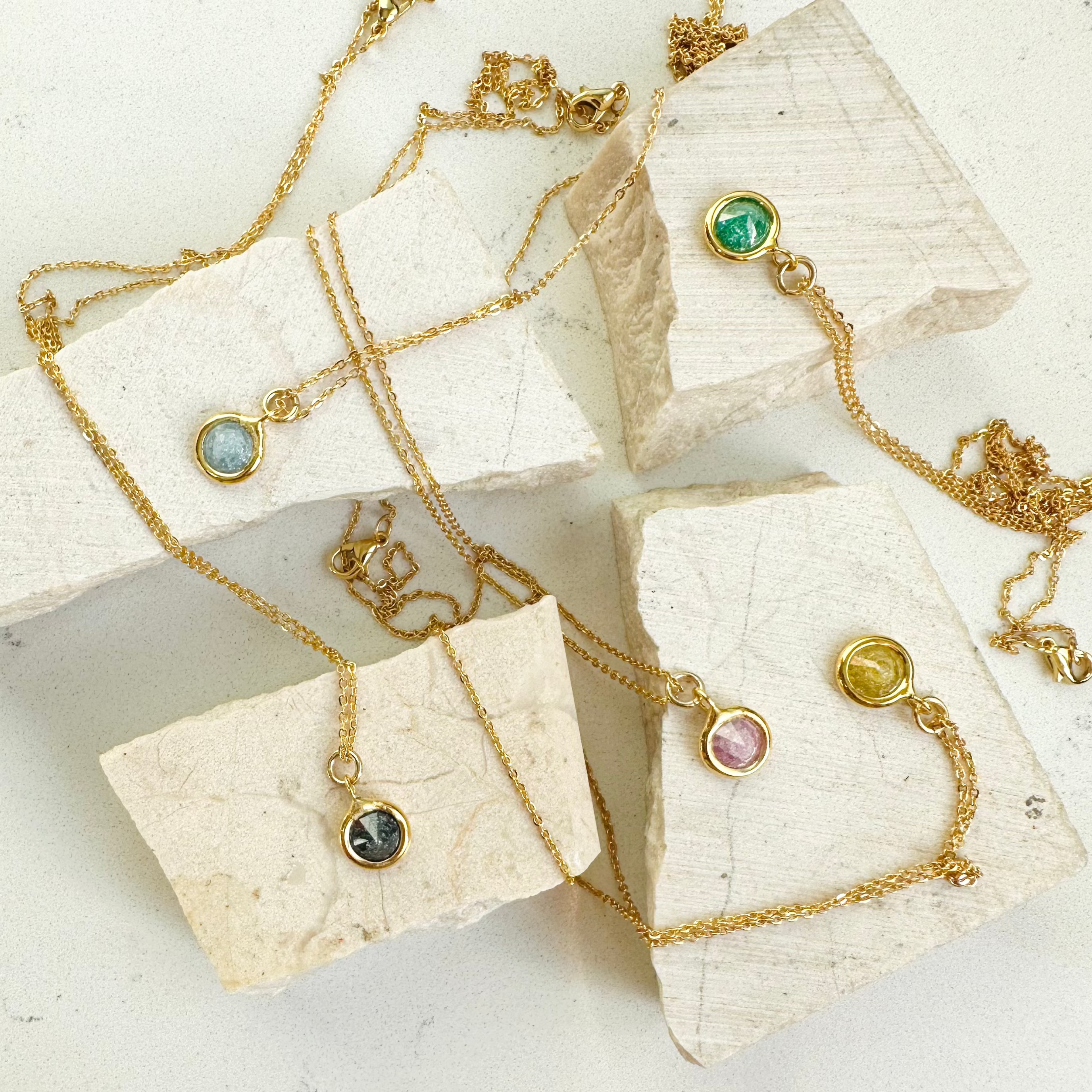Çiçekler kuruma sürecini tamamladıktan sonra, her biri özenle minik parçalara ayrılır. Her bir çiçek parçası, reçine ile sabitlenerek koruma altına alınır. Bu sayede doğanın zarif dokusu uzun süre bozulmadan korunur ve takıların içinde ölümsüzleşir. Her detay, titizlikle işlenir ve takıya hayat verir.