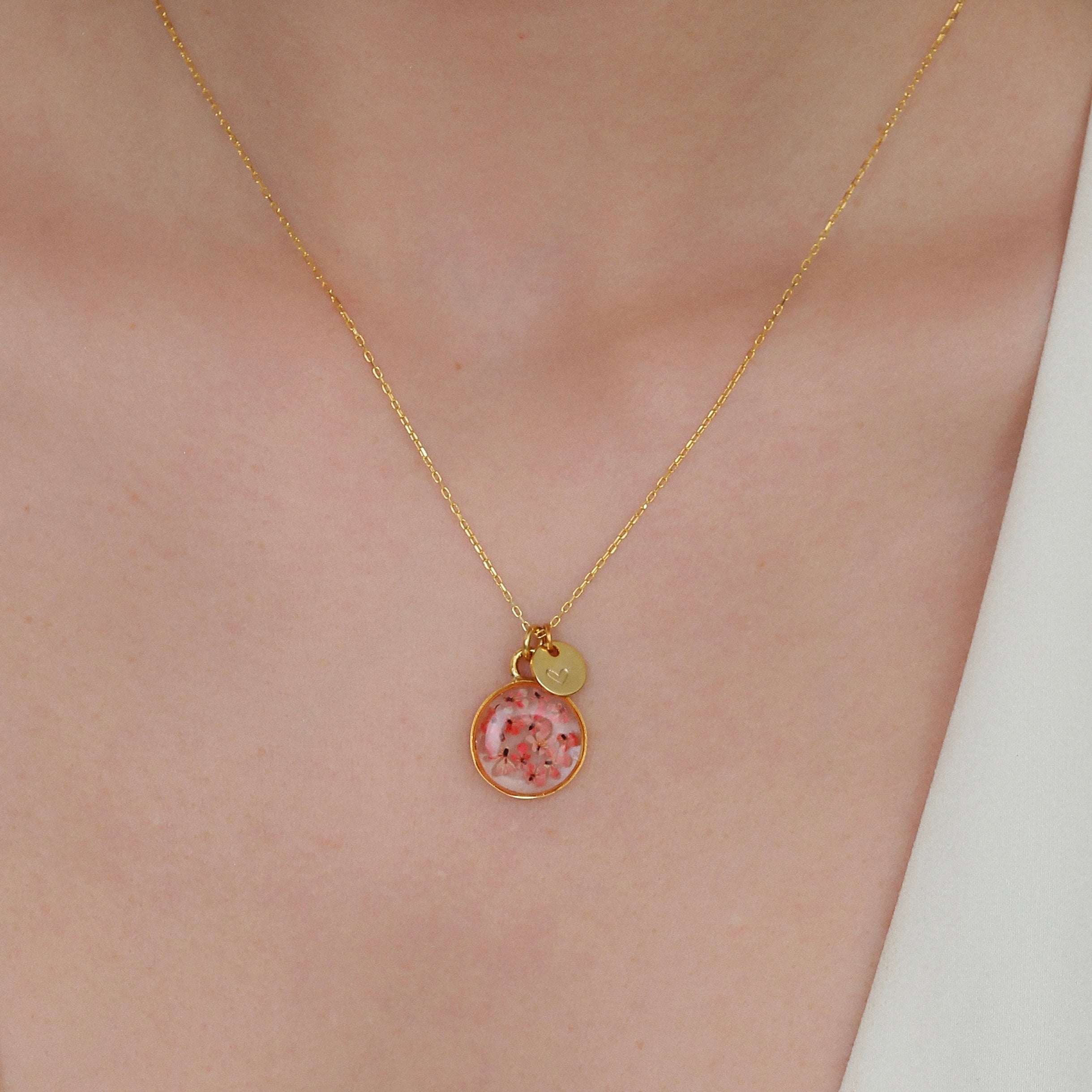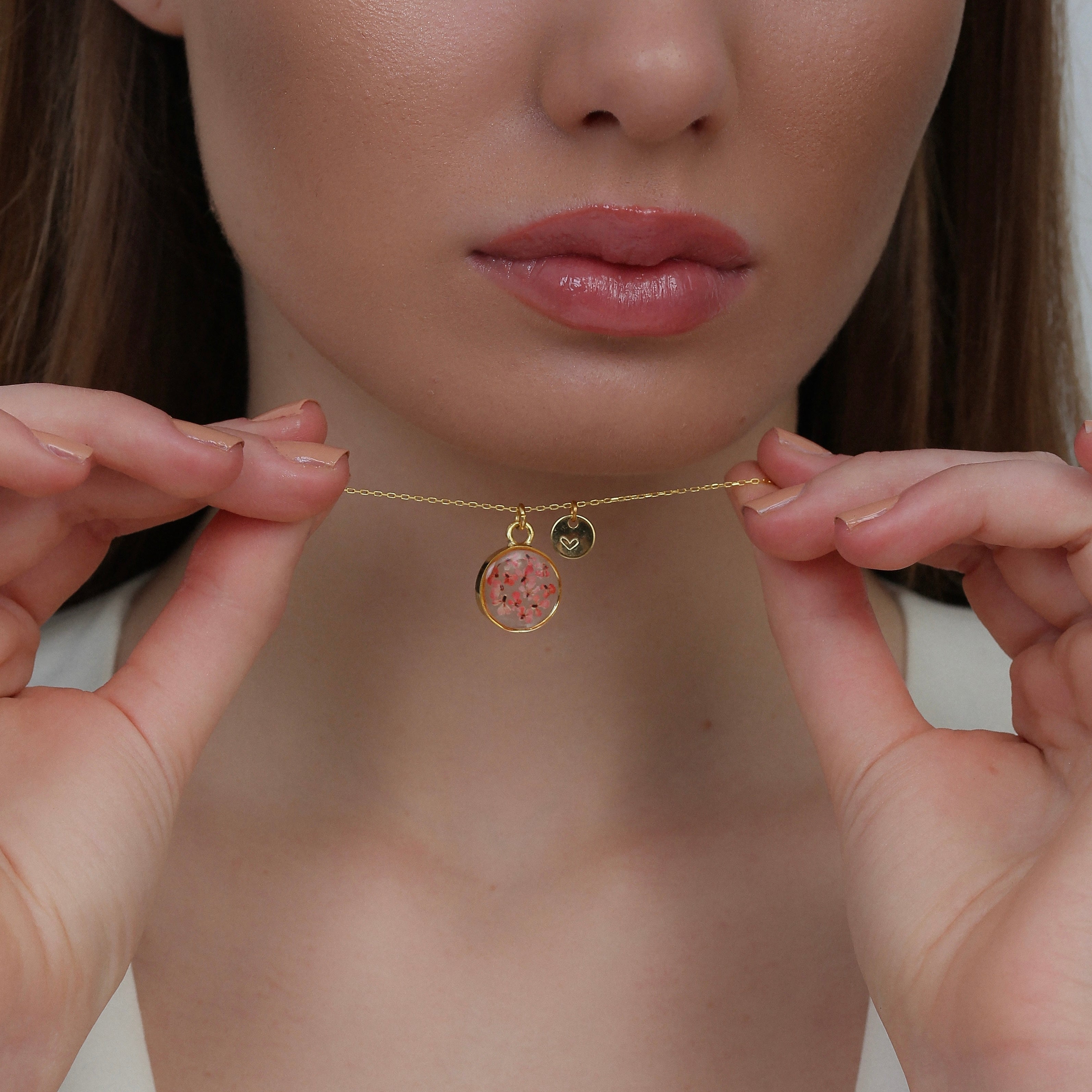 Çiçekler kuruma sürecini tamamladıktan sonra, her biri özenle minik parçalara ayrılır. Her bir çiçek parçası, reçine ile sabitlenerek koruma altına alınır. Bu sayede doğanın zarif dokusu uzun süre bozulmadan korunur ve takıların içinde ölümsüzleşir. Her detay, titizlikle işlenir ve takıya hayat verir.