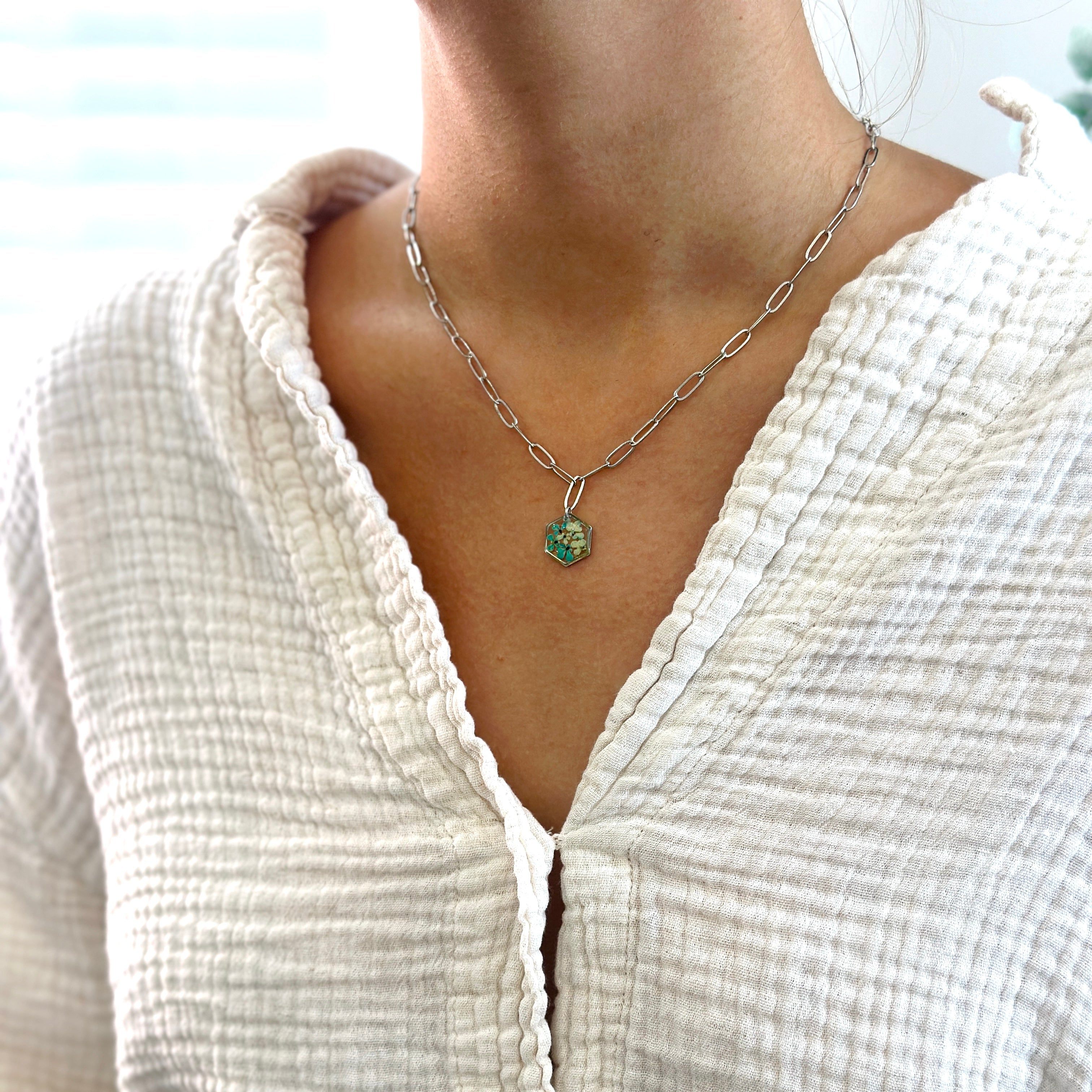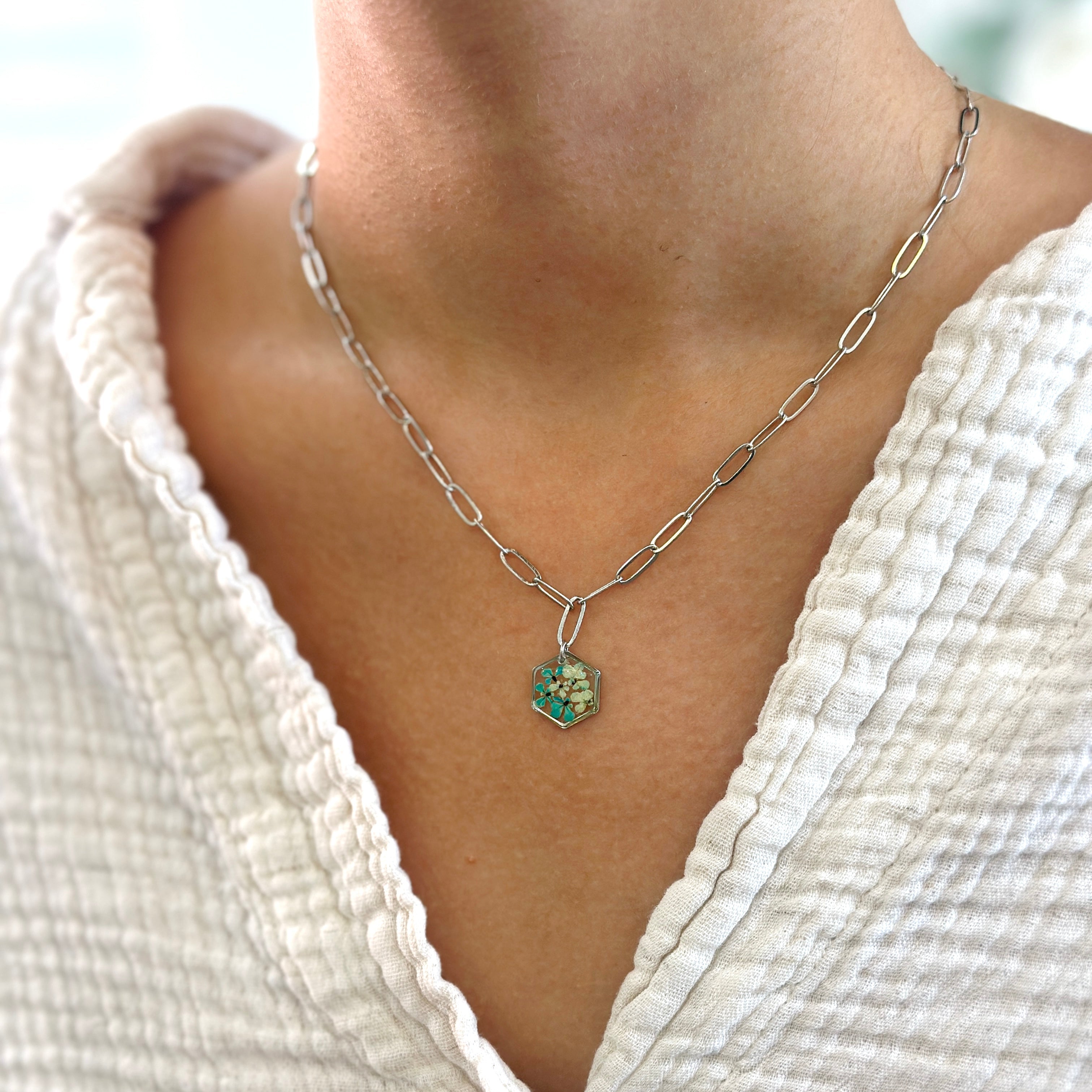 Çiçekler kuruma sürecini tamamladıktan sonra, her biri özenle minik parçalara ayrılır. Her bir çiçek parçası, reçine ile sabitlenerek koruma altına alınır. Bu sayede doğanın zarif dokusu uzun süre bozulmadan korunur ve takıların içinde ölümsüzleşir. Her detay, titizlikle işlenir ve takıya hayat verir.