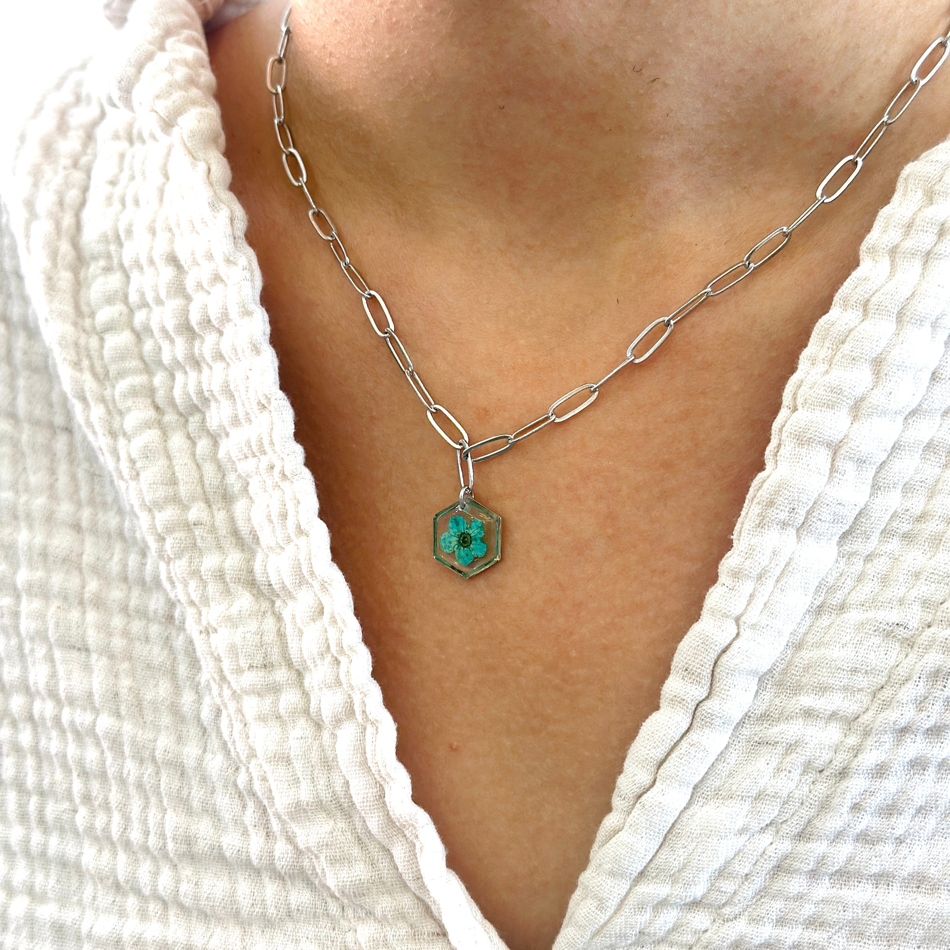Çiçekler kuruma sürecini tamamladıktan sonra, her biri özenle minik parçalara ayrılır. Her bir çiçek parçası, reçine ile sabitlenerek koruma altına alınır. Bu sayede doğanın zarif dokusu uzun süre bozulmadan korunur ve takıların içinde ölümsüzleşir. Her detay, titizlikle işlenir ve takıya hayat verir.
