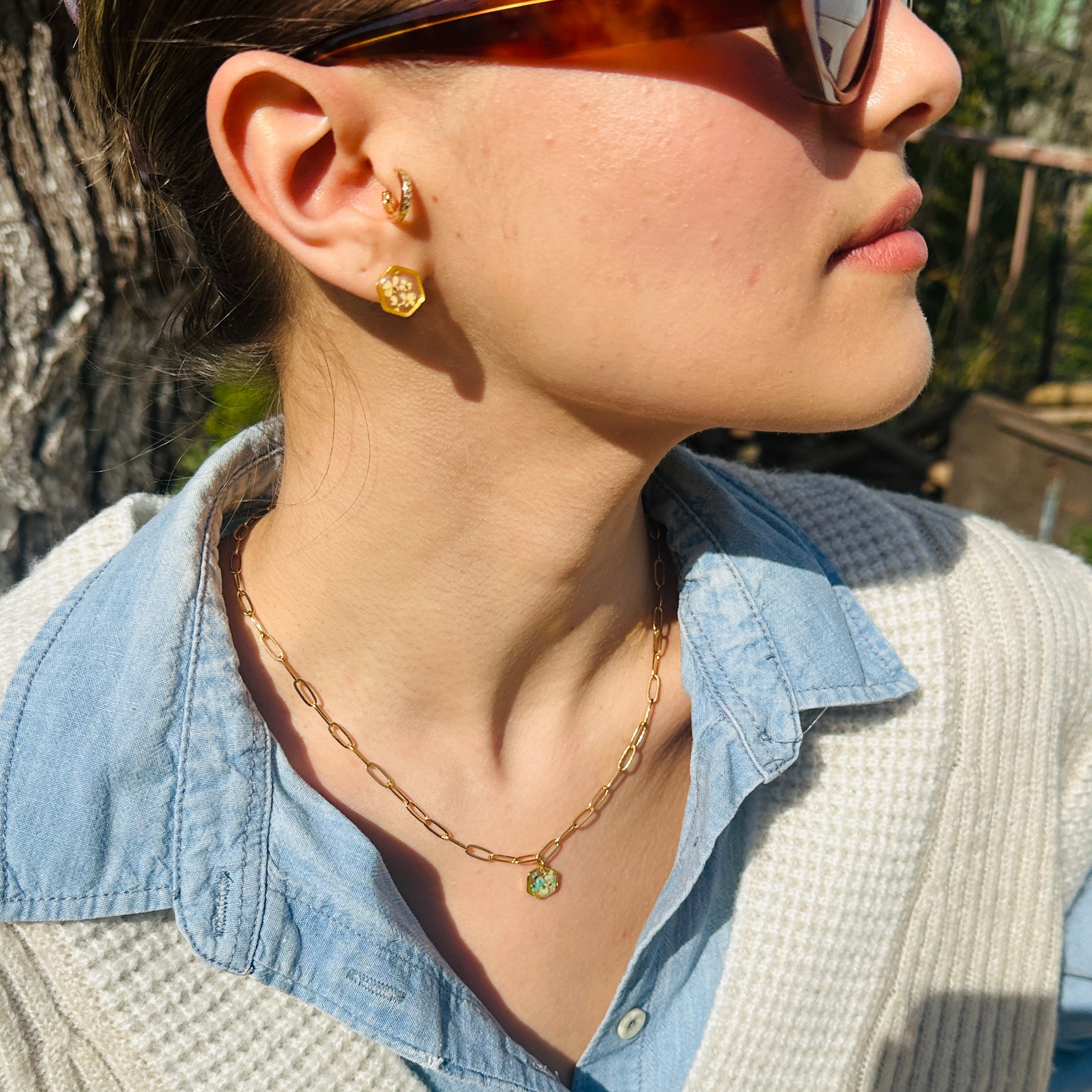 Çiçekler kuruma sürecini tamamladıktan sonra, her biri özenle minik parçalara ayrılır. Her bir çiçek parçası, reçine ile sabitlenerek koruma altına alınır. Bu sayede doğanın zarif dokusu uzun süre bozulmadan korunur ve takıların içinde ölümsüzleşir. Her detay, titizlikle işlenir ve takıya hayat verir.