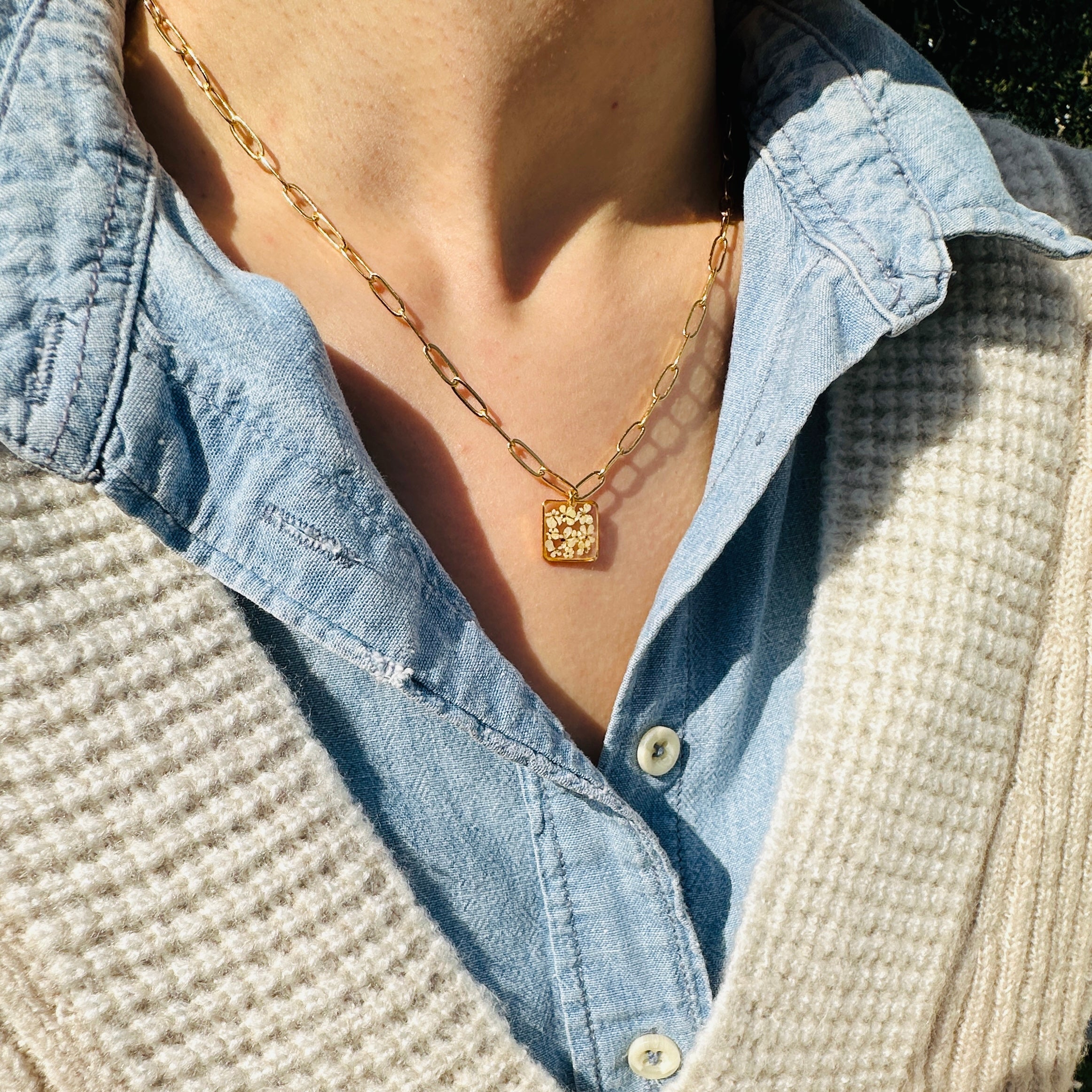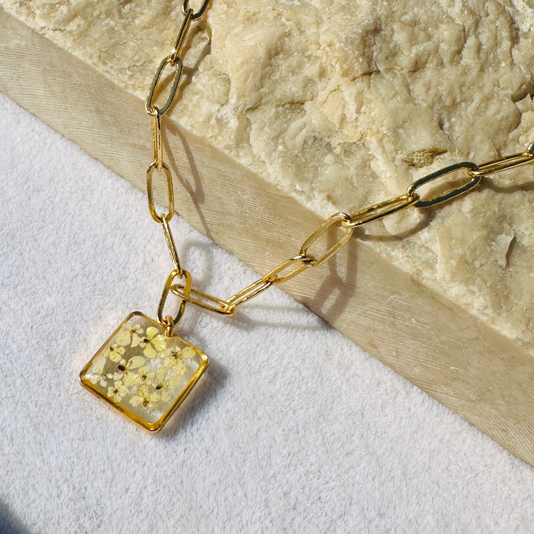Çiçekler kuruma sürecini tamamladıktan sonra, her biri özenle minik parçalara ayrılır. Her bir çiçek parçası, reçine ile sabitlenerek koruma altına alınır. Bu sayede doğanın zarif dokusu uzun süre bozulmadan korunur ve takıların içinde ölümsüzleşir. Her detay, titizlikle işlenir ve takıya hayat verir.