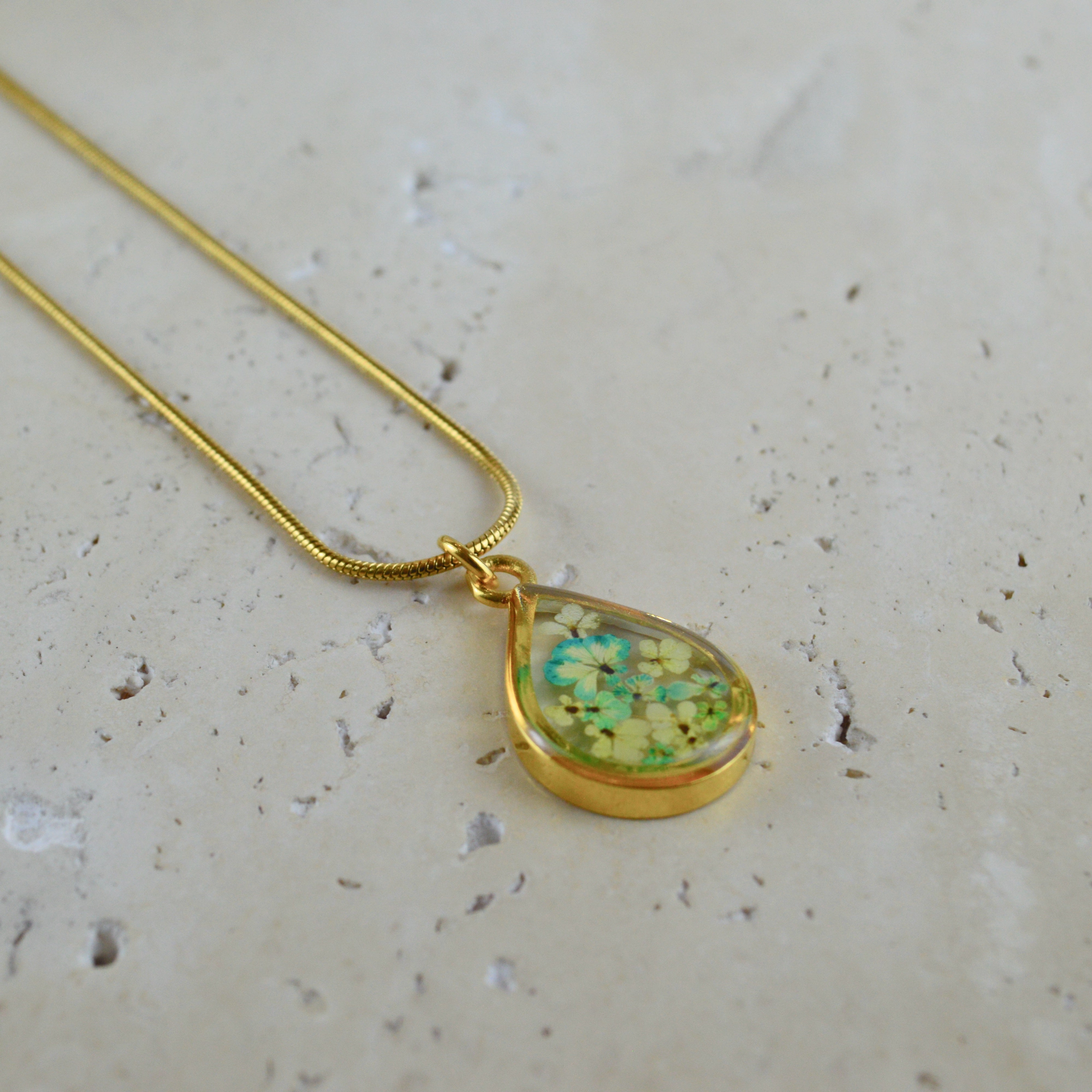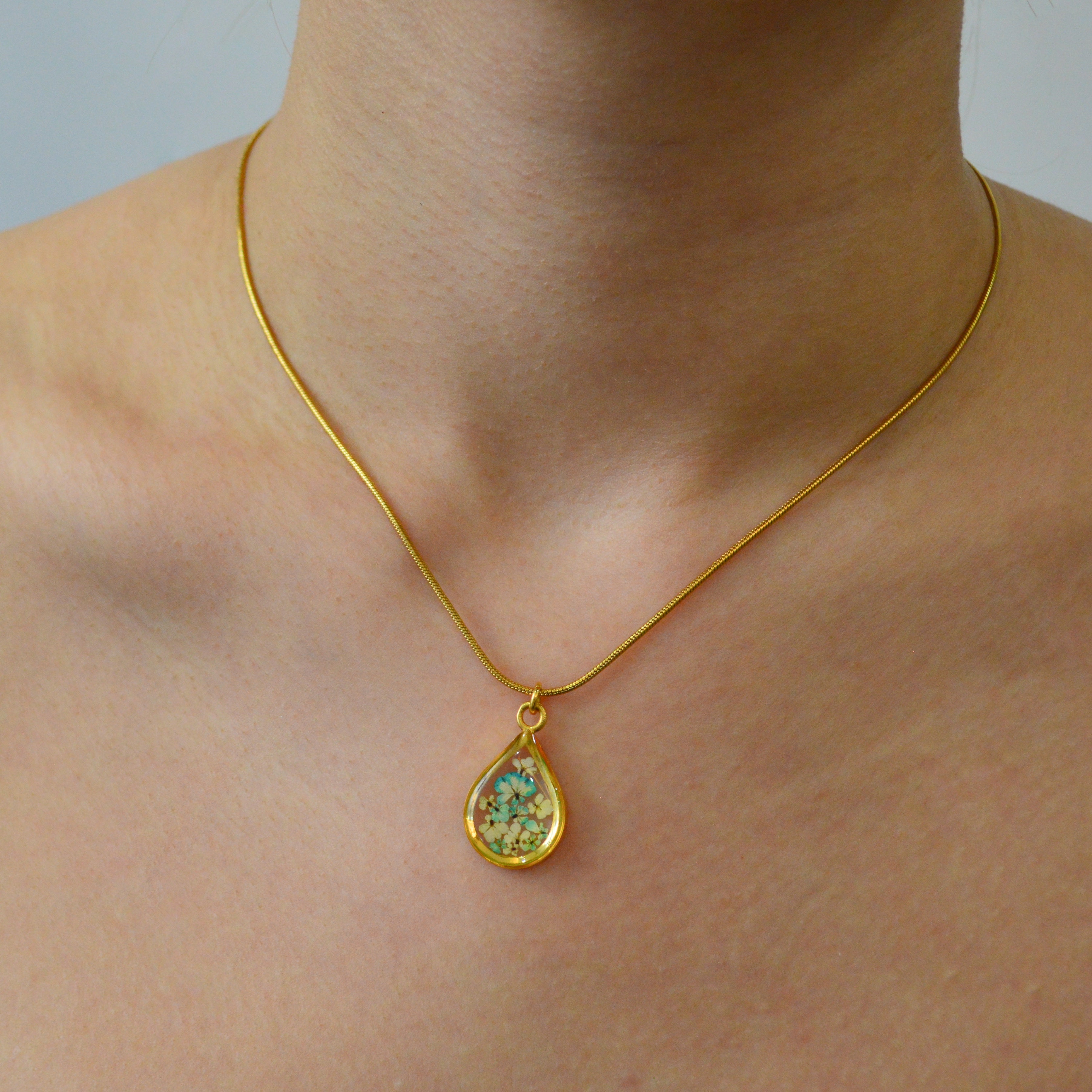 Çiçekler kuruma sürecini tamamladıktan sonra, her biri özenle minik parçalara ayrılır. Her bir çiçek parçası, reçine ile sabitlenerek koruma altına alınır. Bu sayede doğanın zarif dokusu uzun süre bozulmadan korunur ve takıların içinde ölümsüzleşir. Her detay, titizlikle işlenir ve takıya hayat verir.