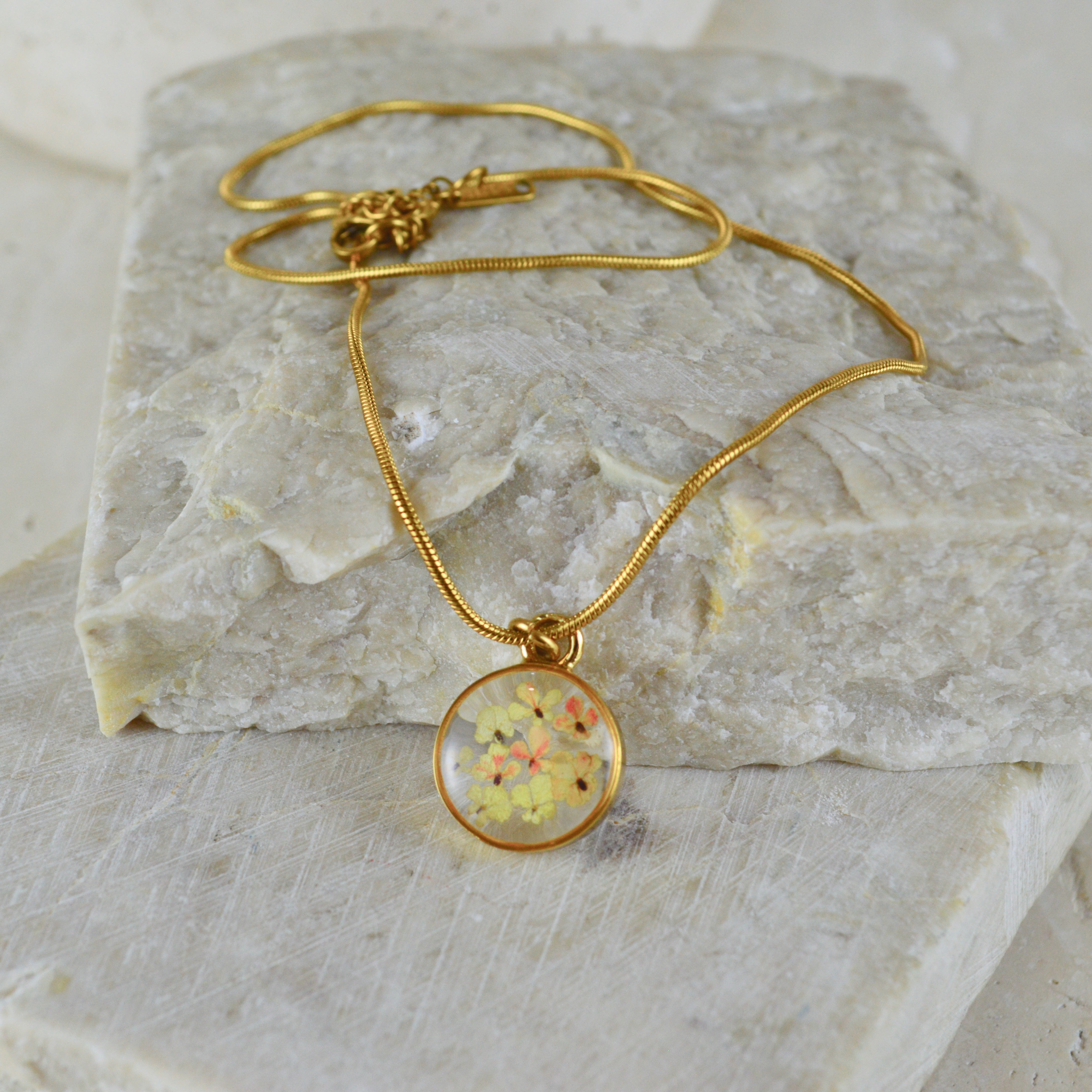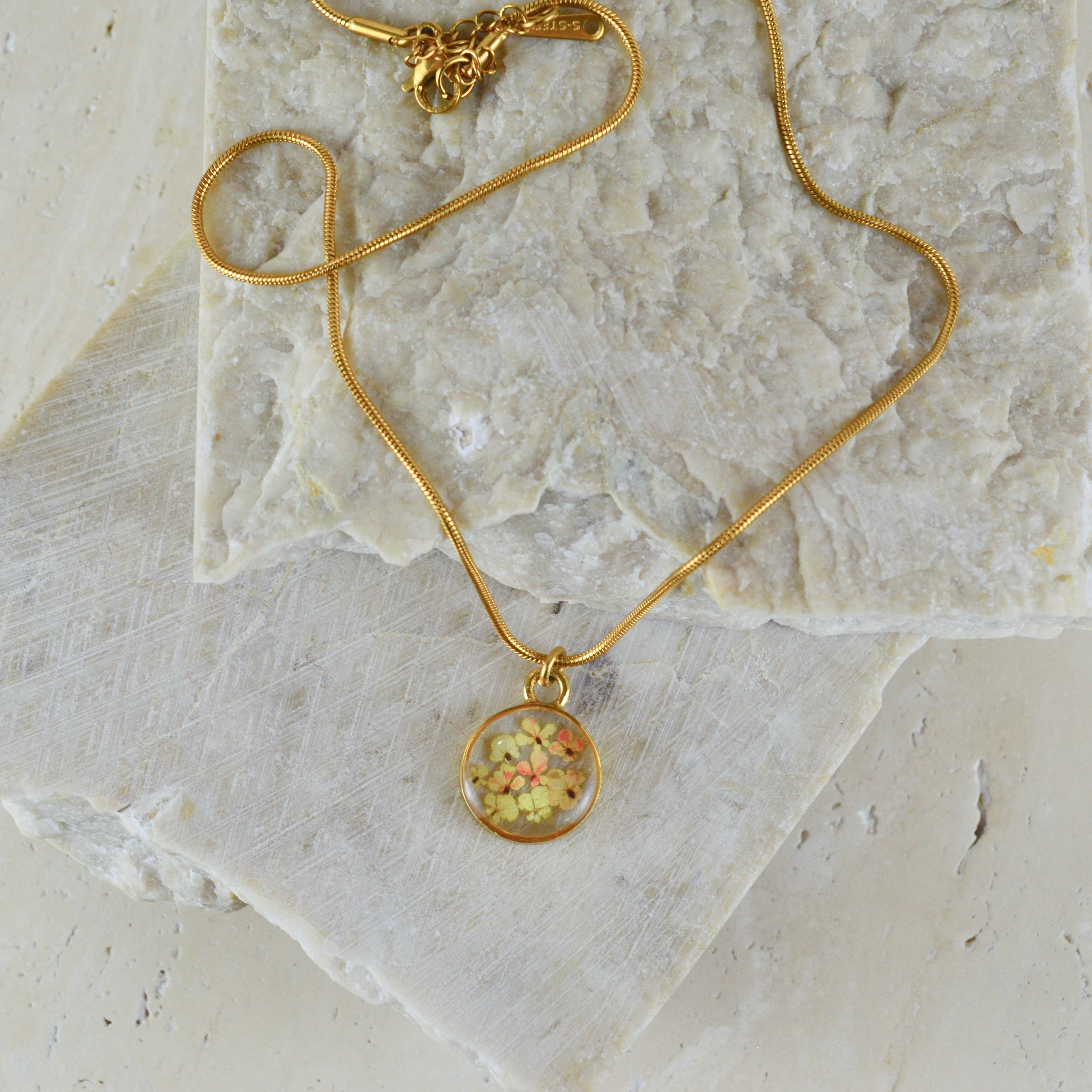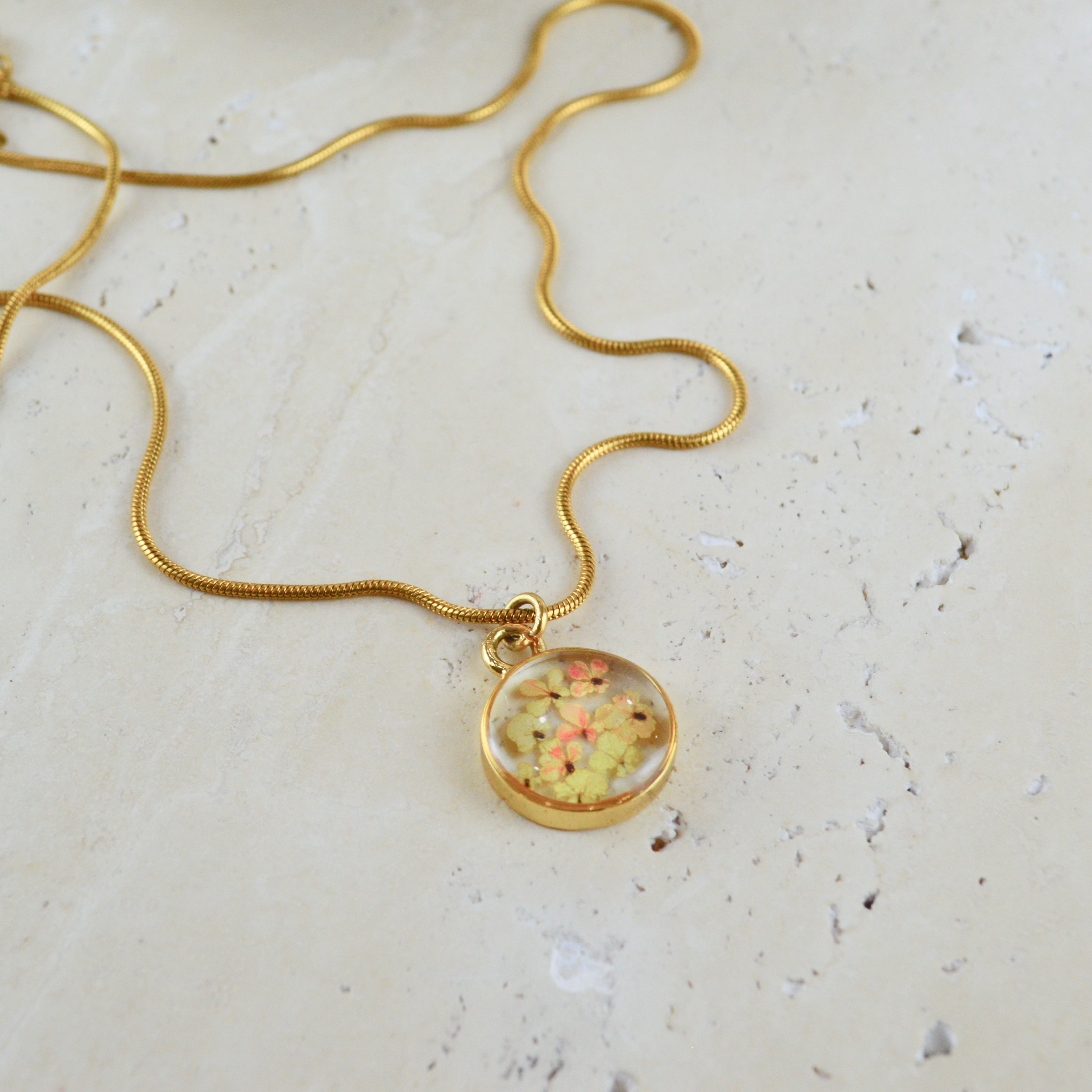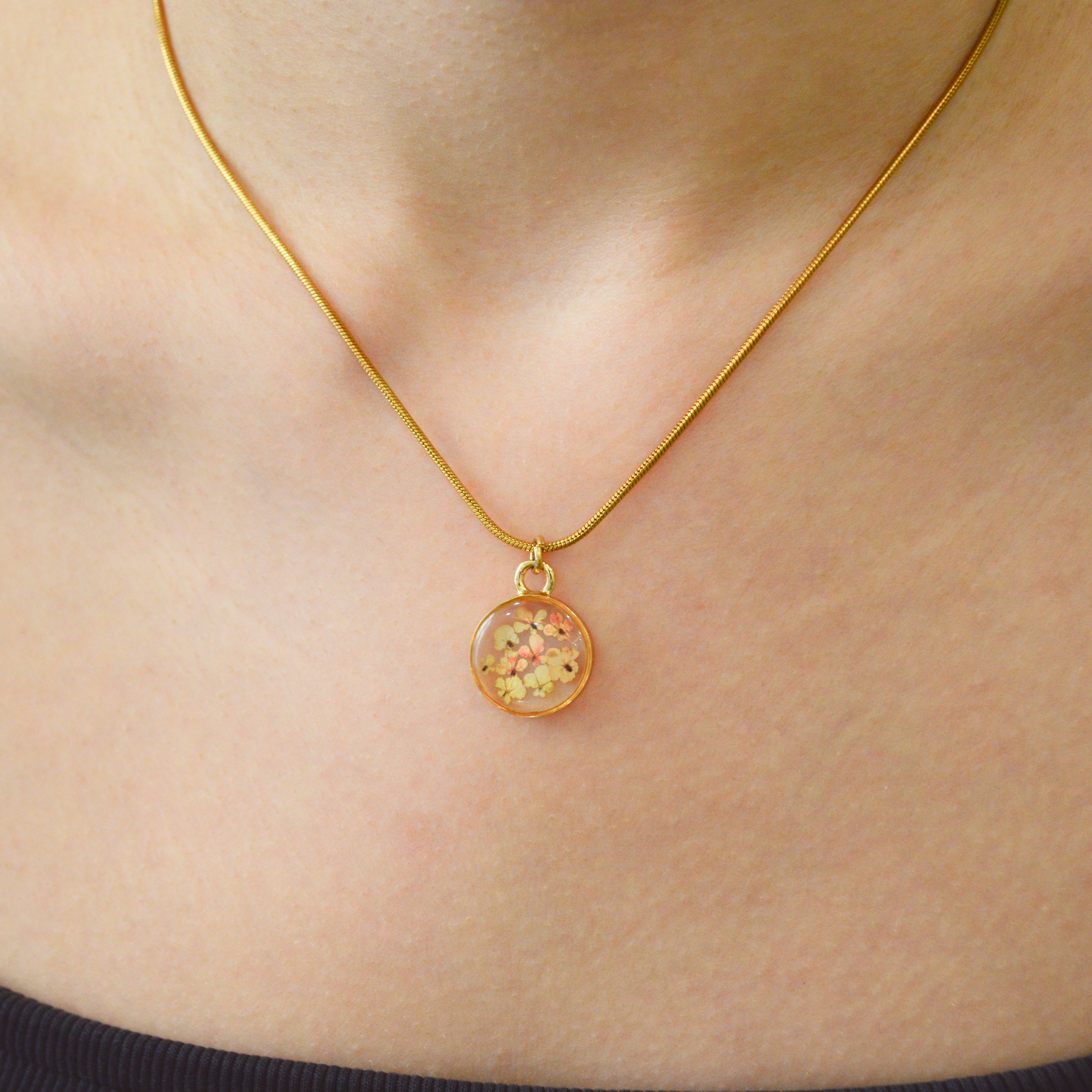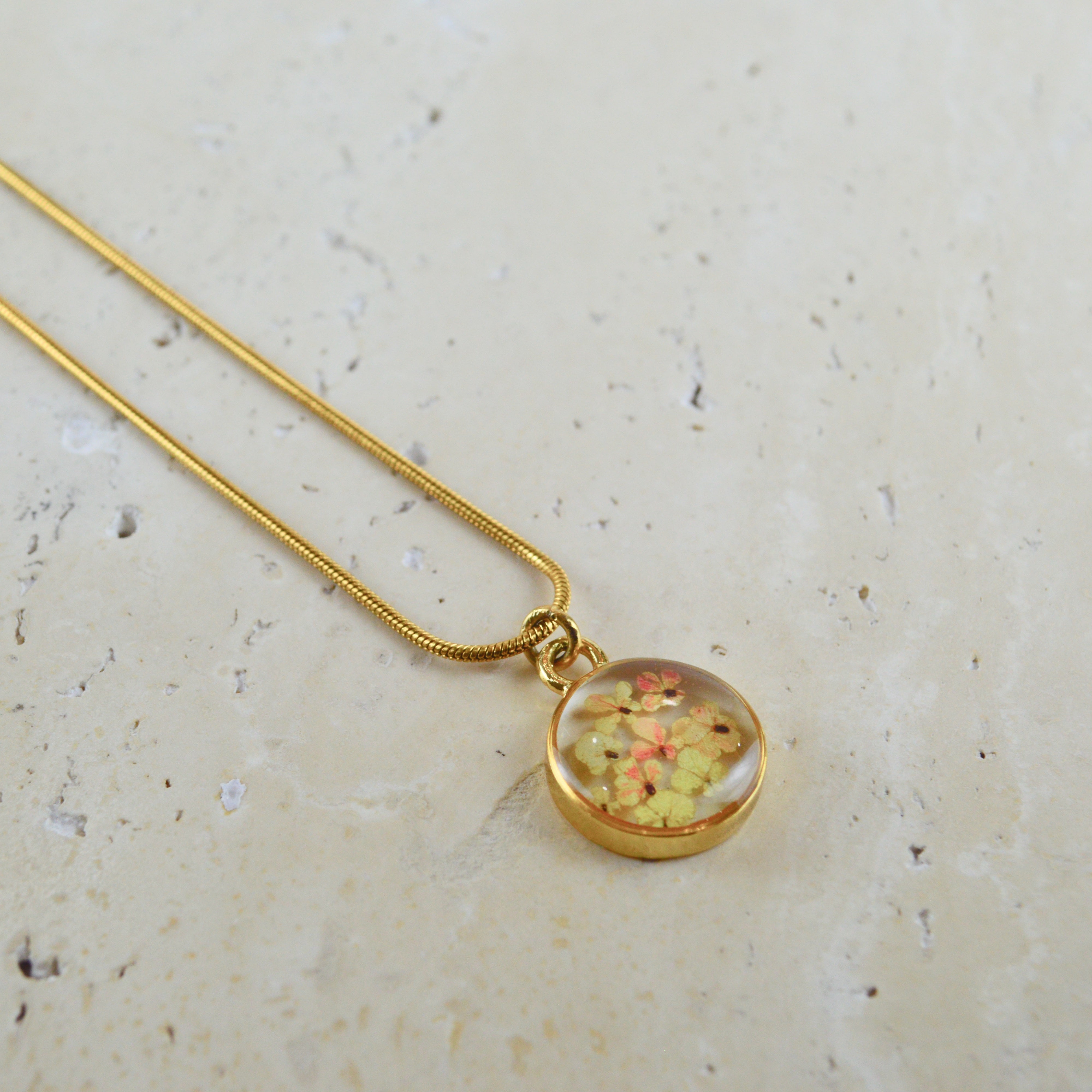 Çiçekler kuruma sürecini tamamladıktan sonra, her biri özenle minik parçalara ayrılır. Her bir çiçek parçası, reçine ile sabitlenerek koruma altına alınır. Bu sayede doğanın zarif dokusu uzun süre bozulmadan korunur ve takıların içinde ölümsüzleşir. Her detay, titizlikle işlenir ve takıya hayat verir.
