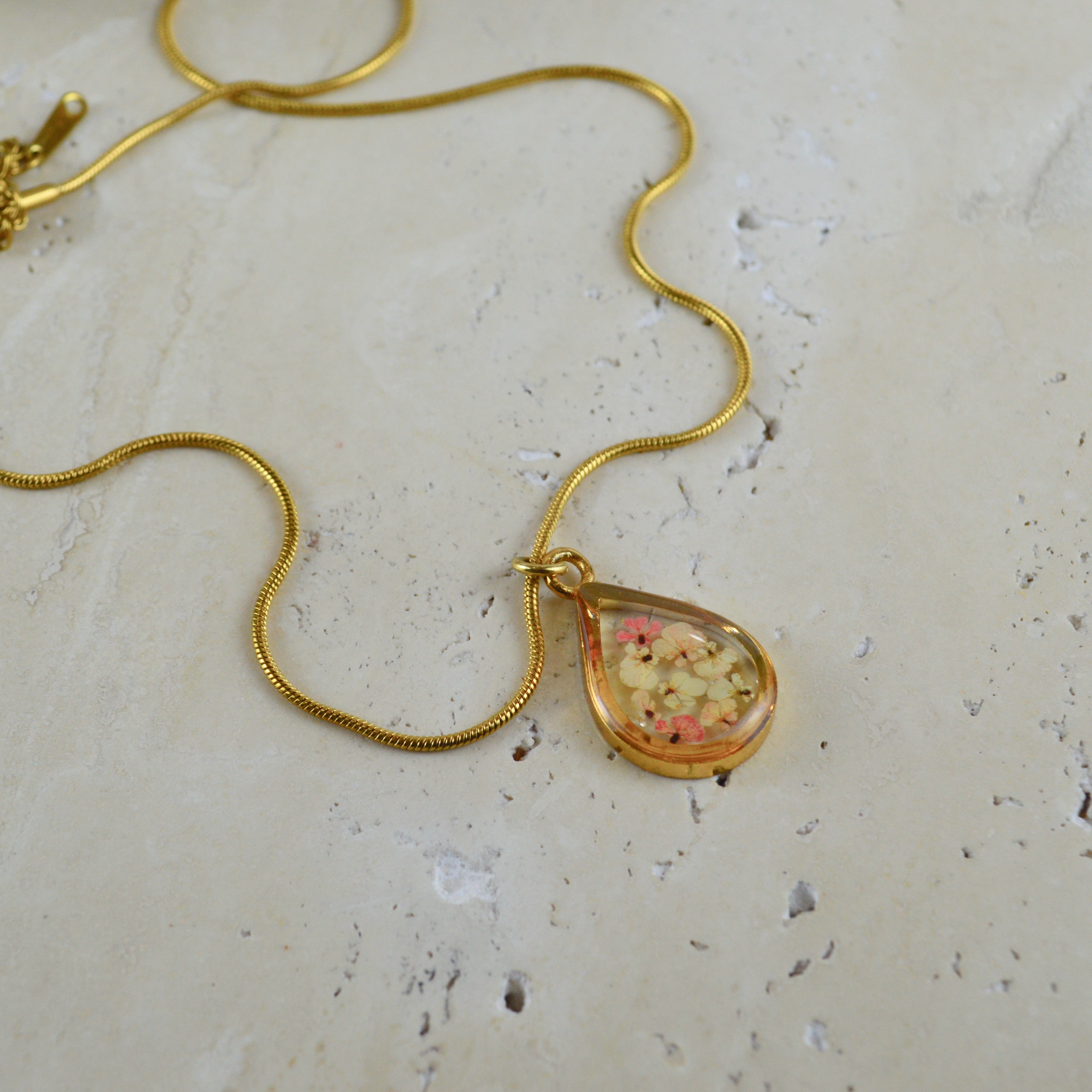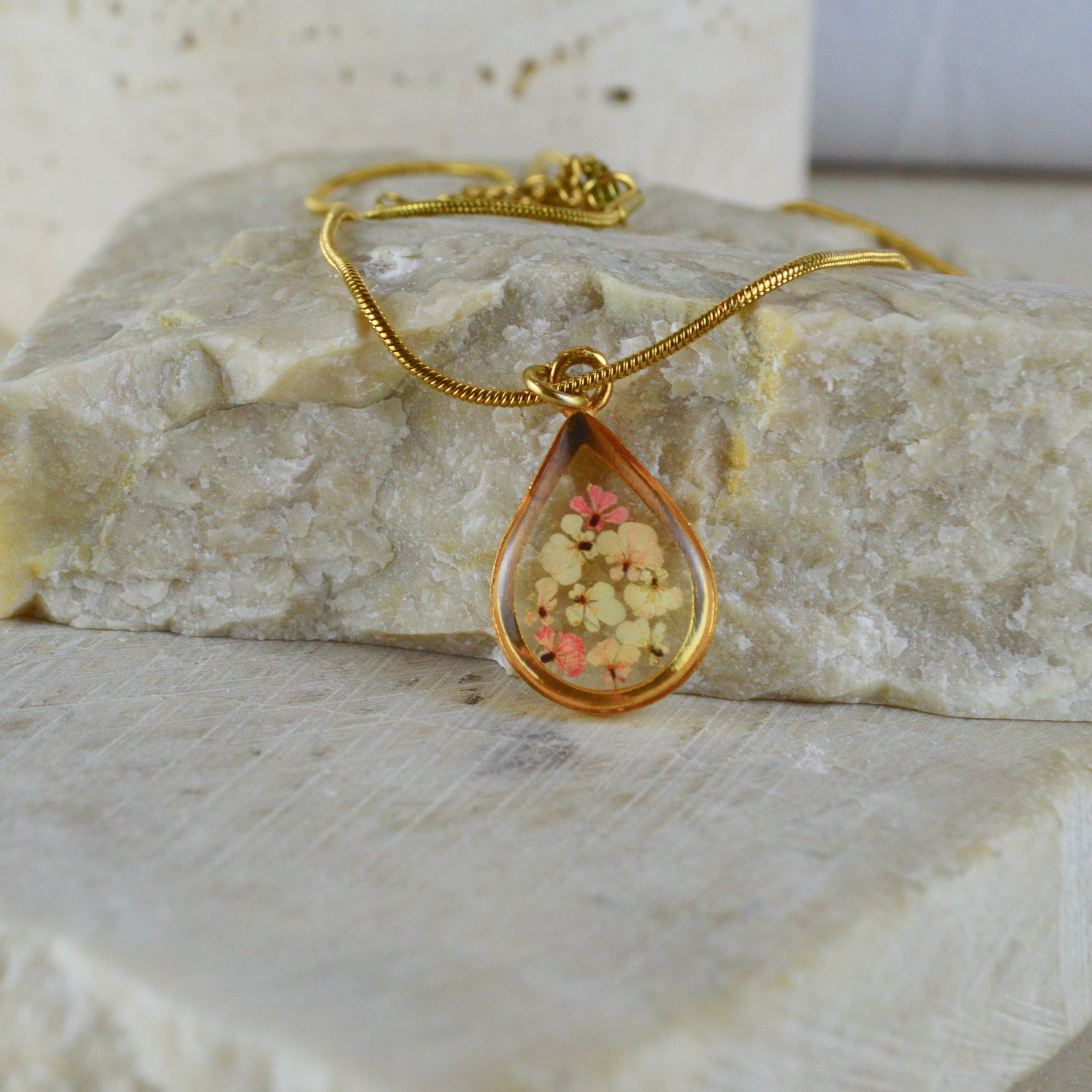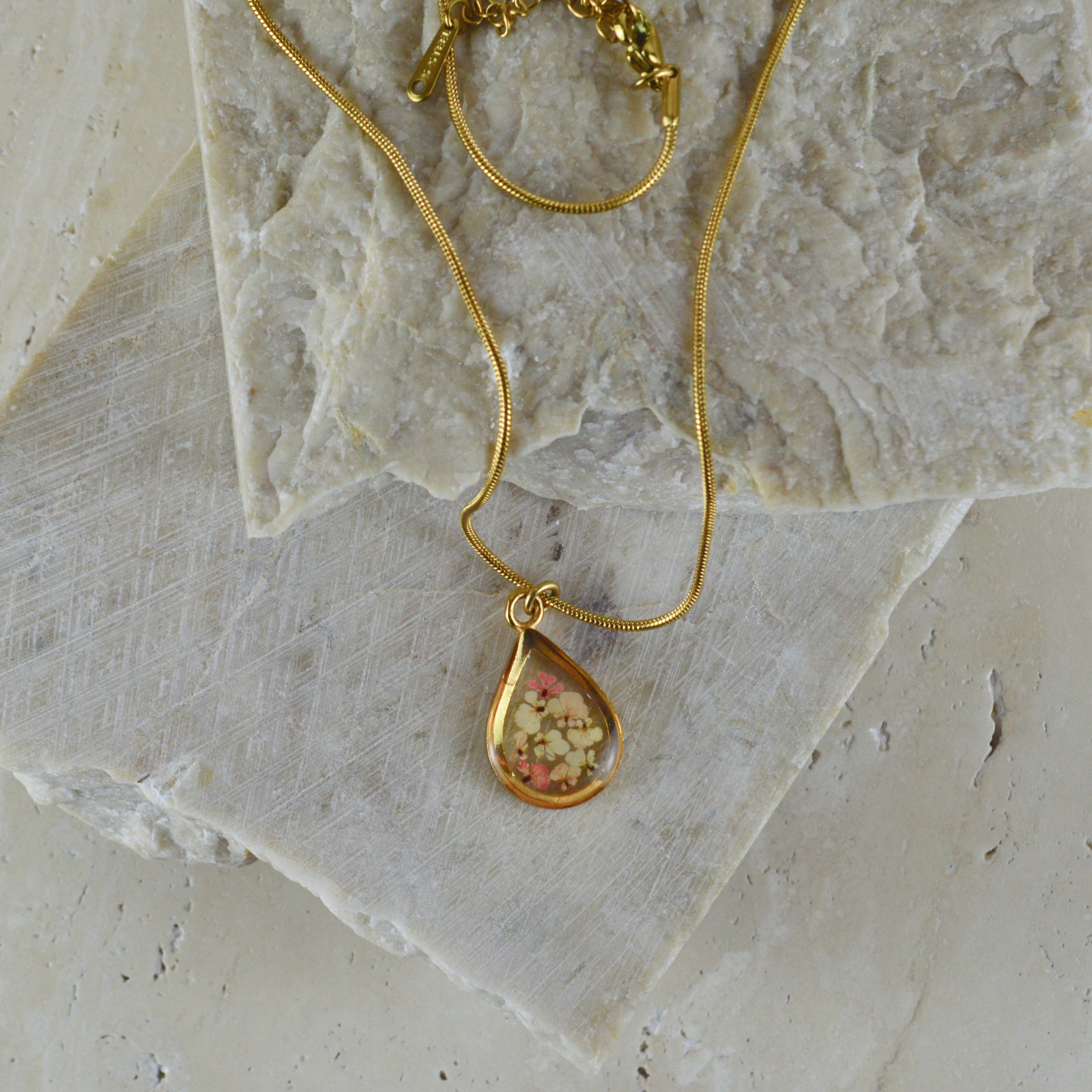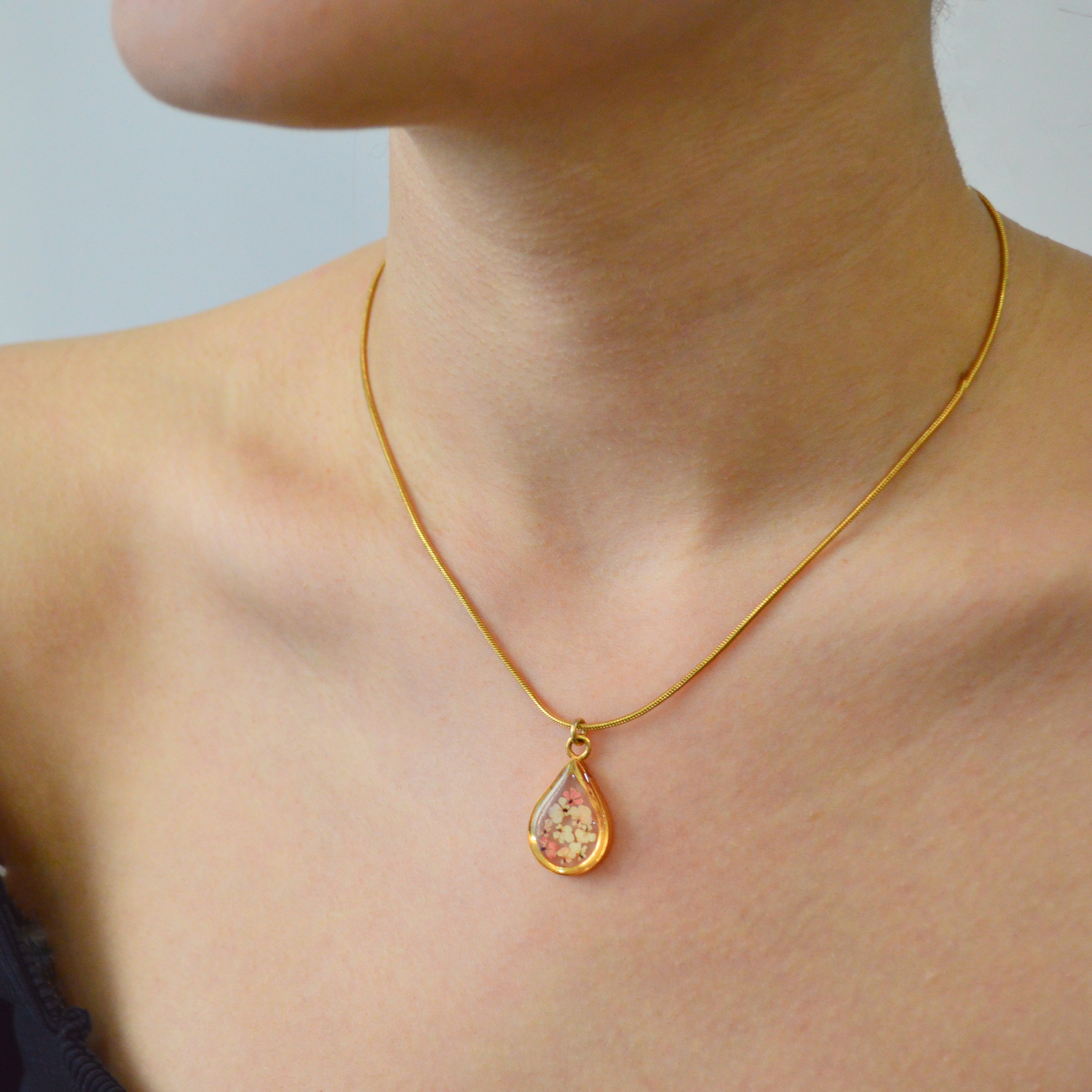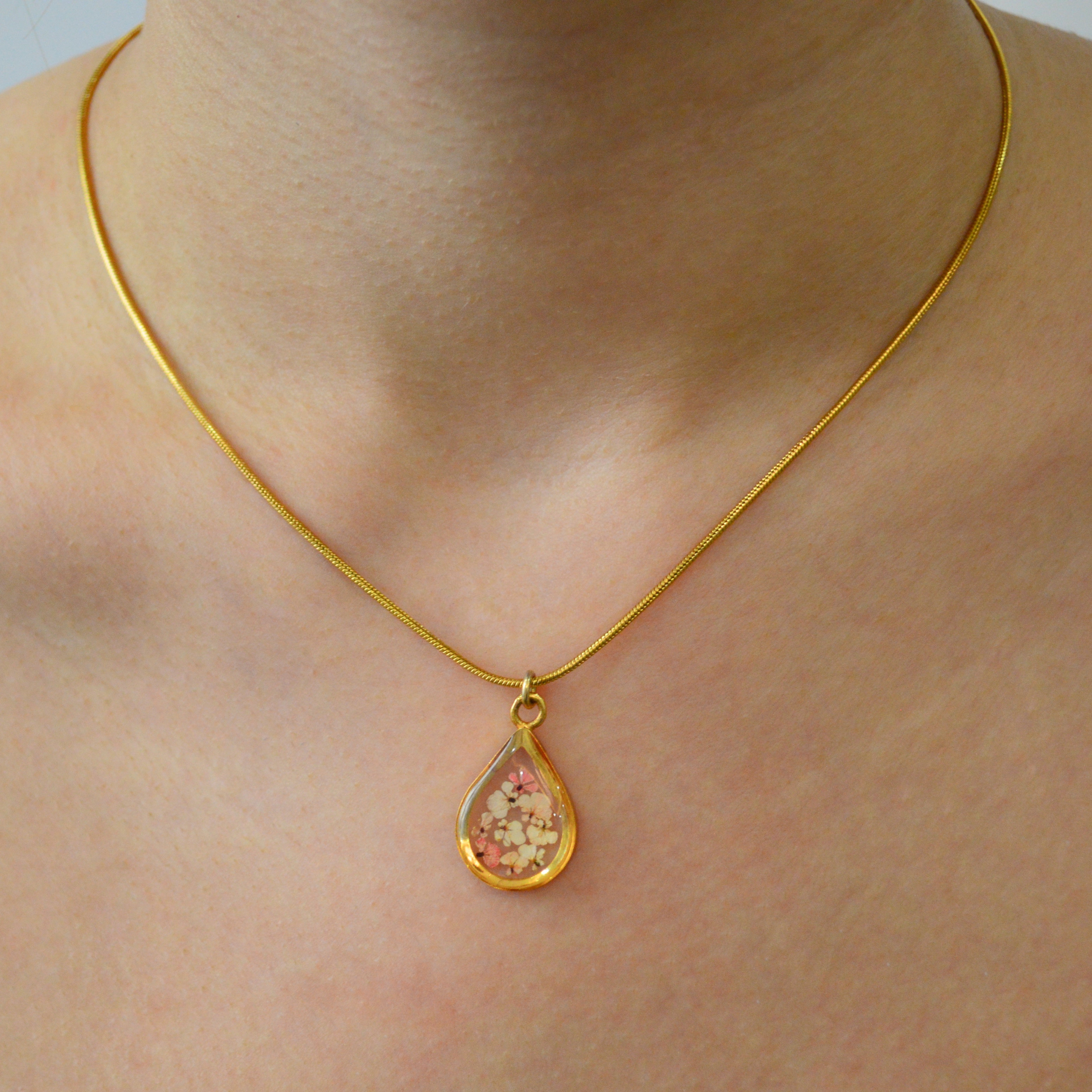 Çiçekler kuruma sürecini tamamladıktan sonra, her biri özenle minik parçalara ayrılır. Her bir çiçek parçası, reçine ile sabitlenerek koruma altına alınır. Bu sayede doğanın zarif dokusu uzun süre bozulmadan korunur ve takıların içinde ölümsüzleşir. Her detay, titizlikle işlenir ve takıya hayat verir.