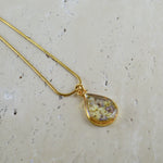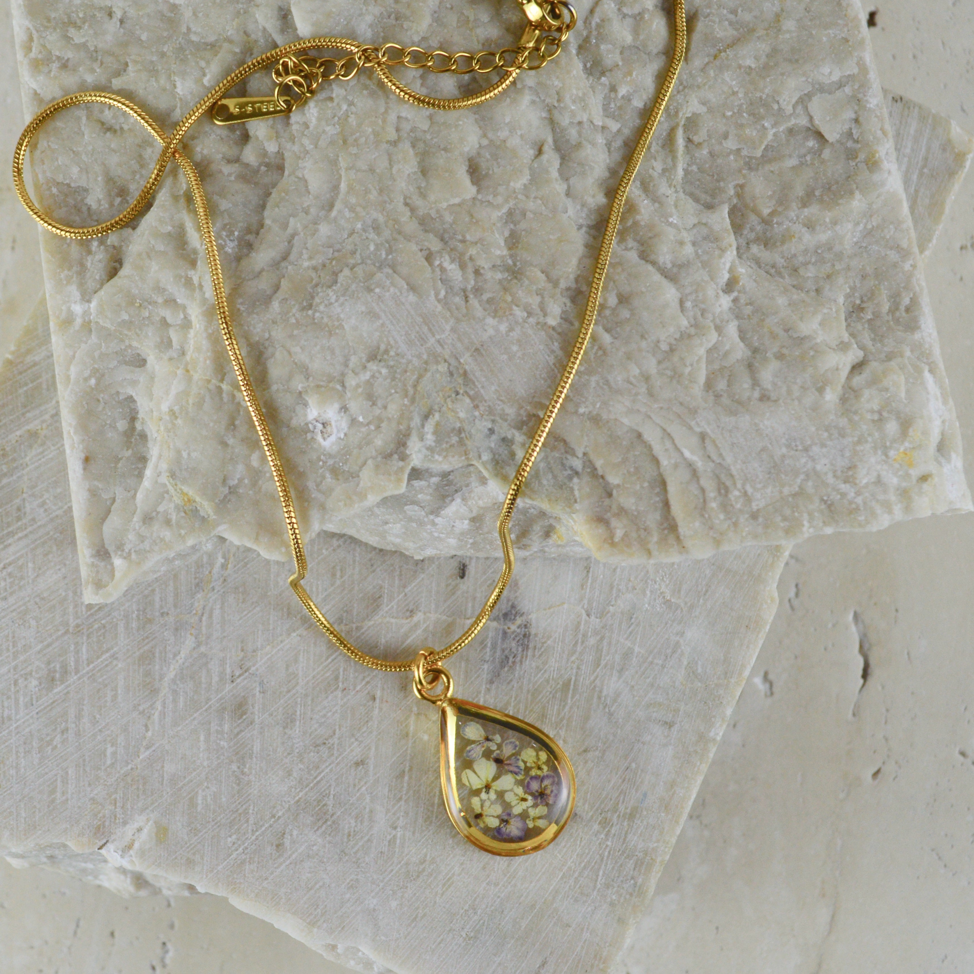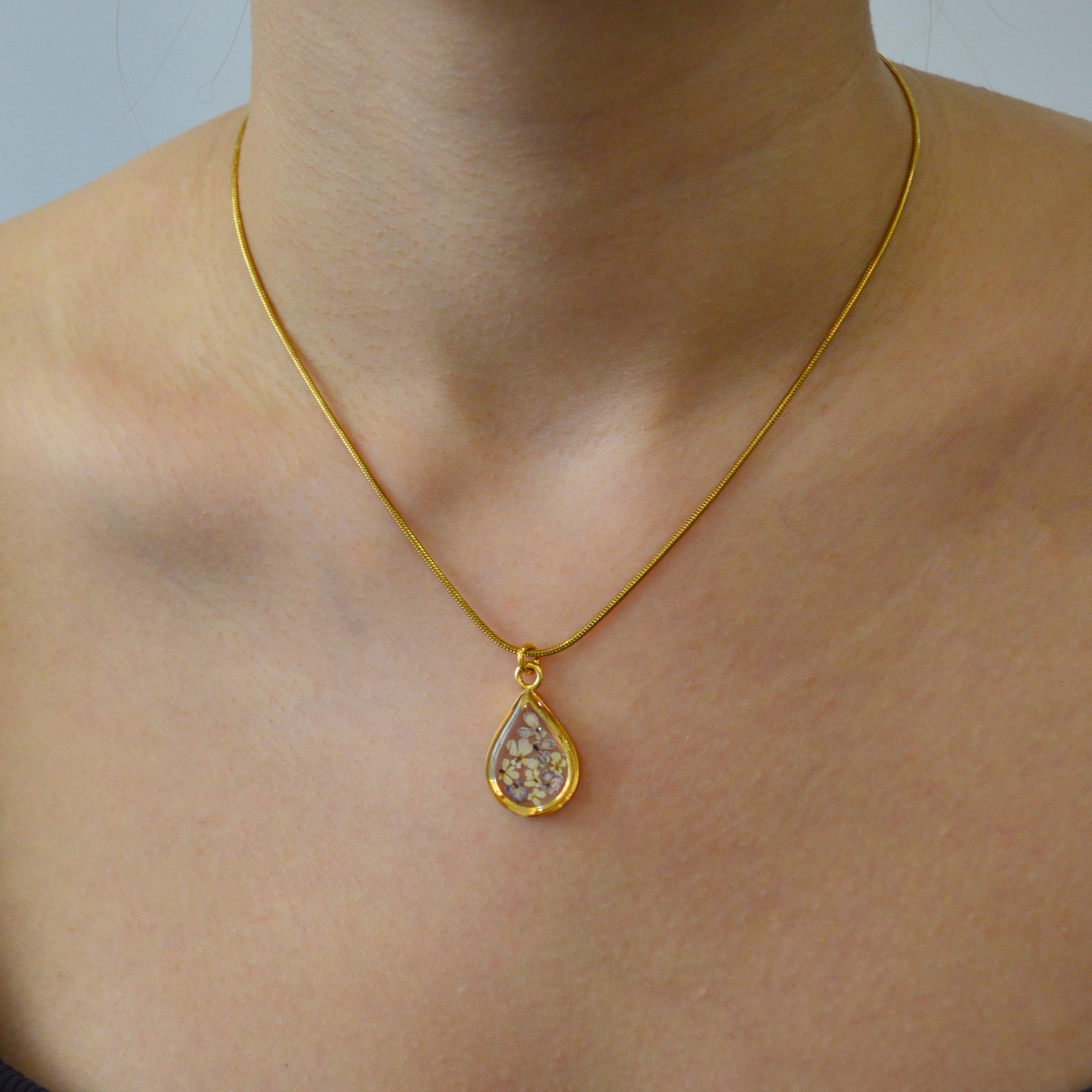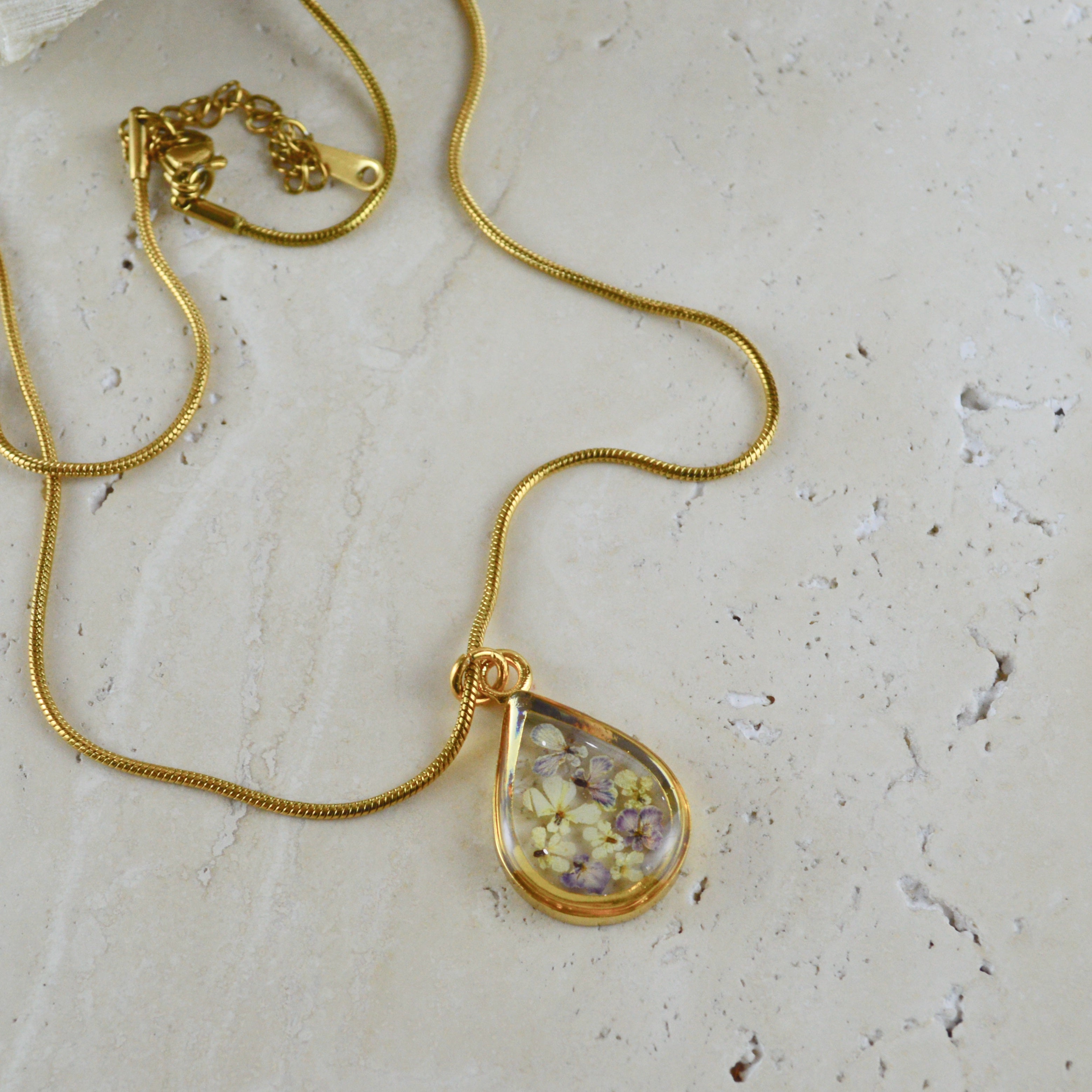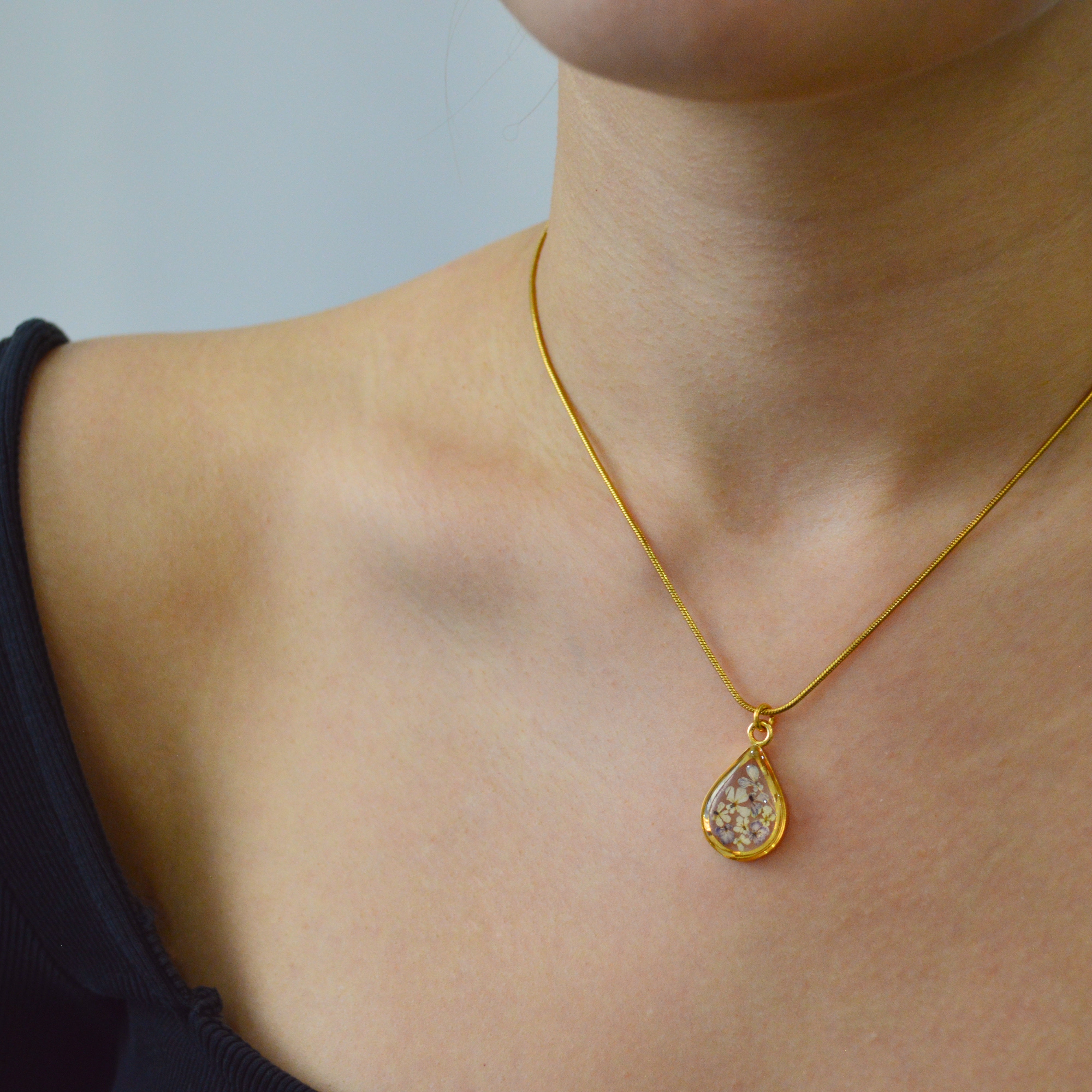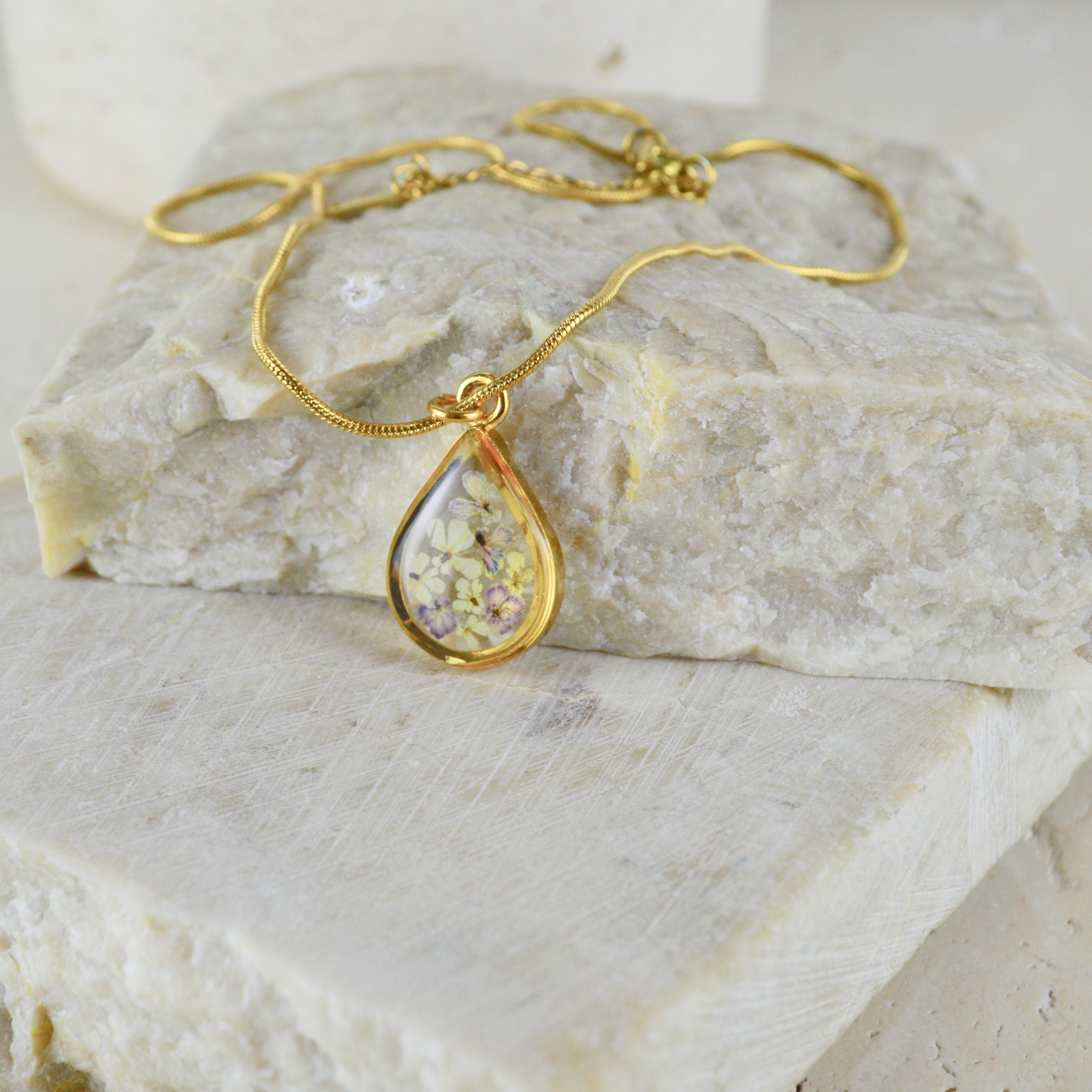 Çiçekler kuruma sürecini tamamladıktan sonra, her biri özenle minik parçalara ayrılır. Her bir çiçek parçası, reçine ile sabitlenerek koruma altına alınır. Bu sayede doğanın zarif dokusu uzun süre bozulmadan korunur ve takıların içinde ölümsüzleşir. Her detay, titizlikle işlenir ve takıya hayat verir.