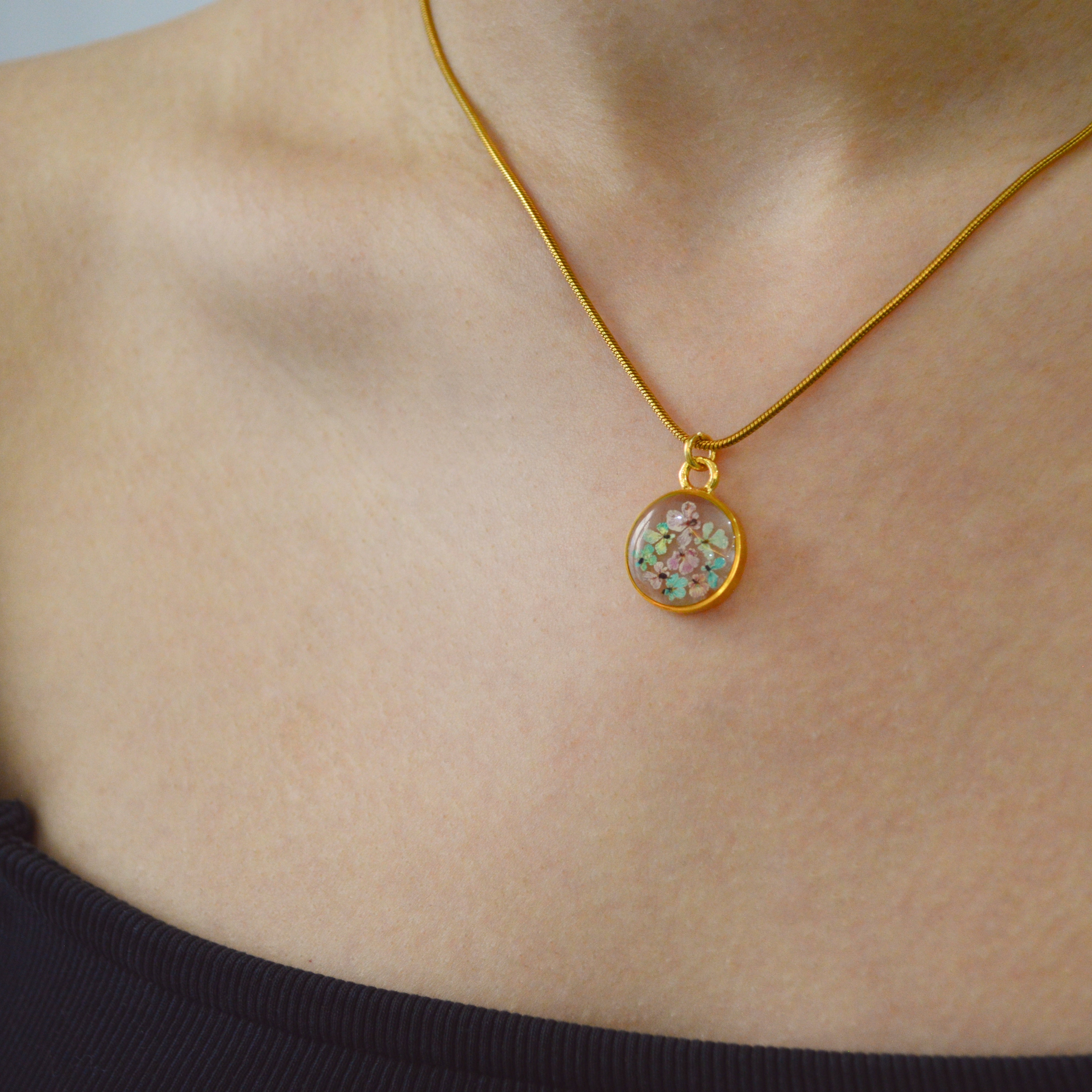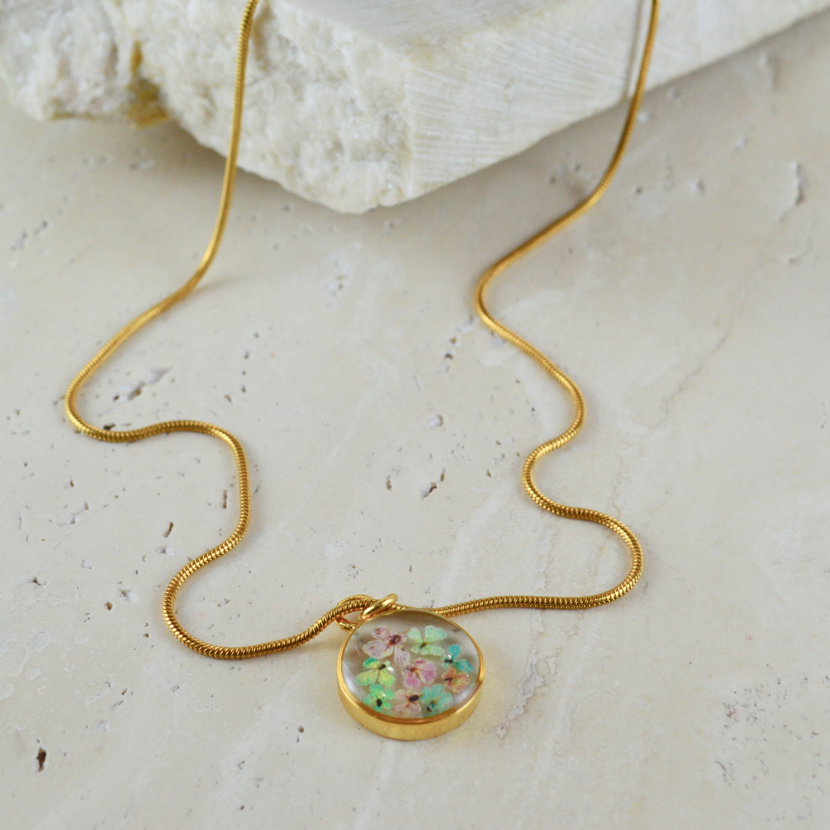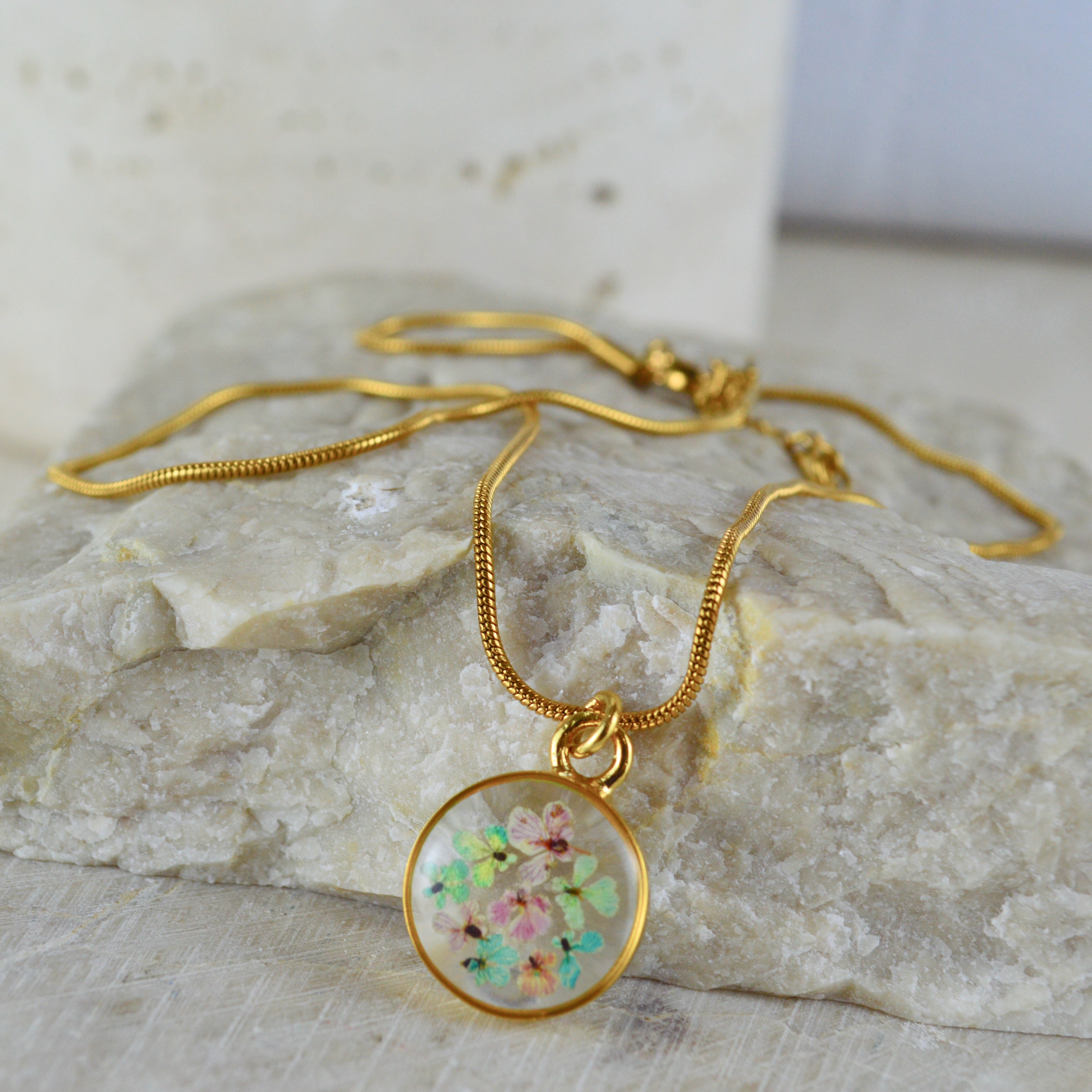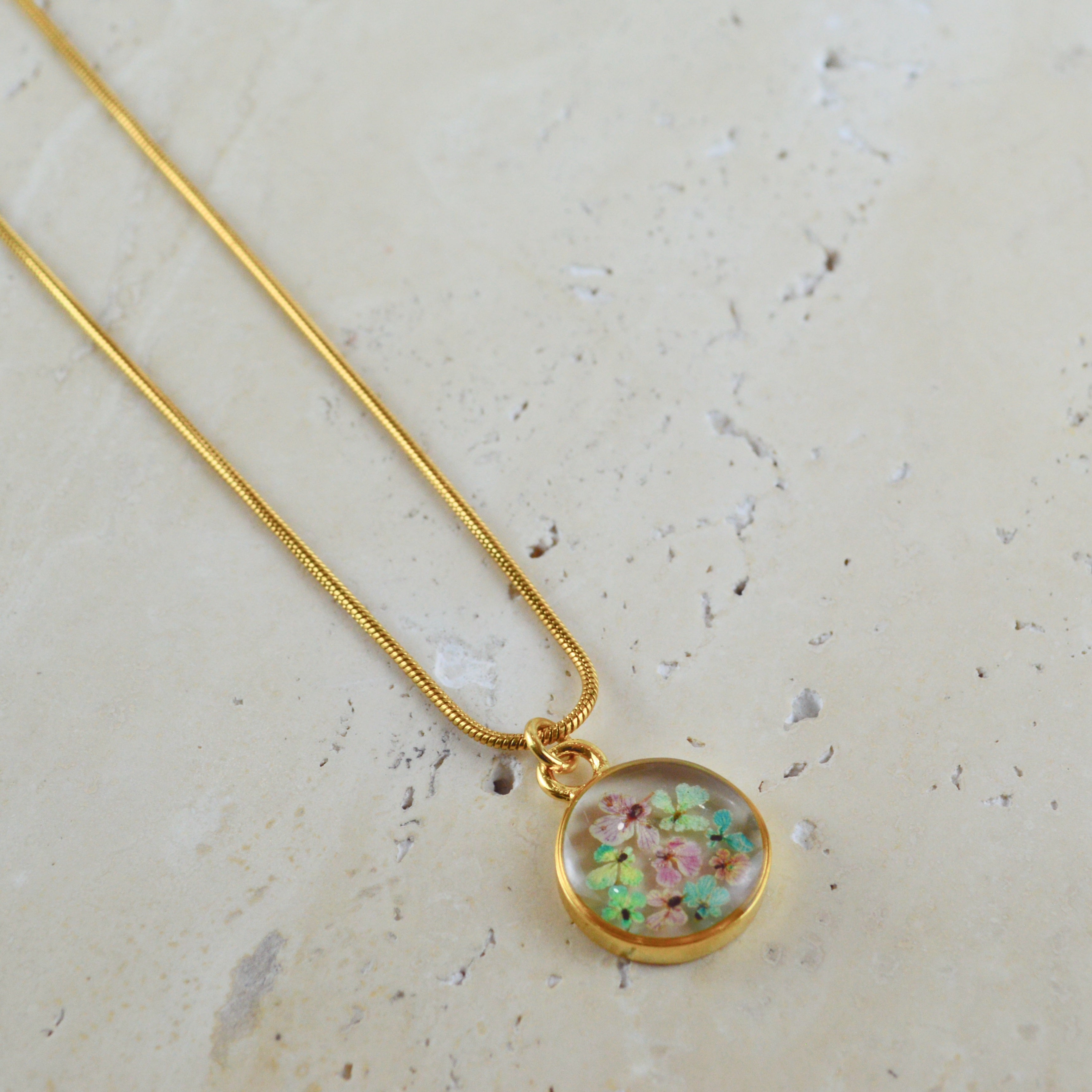 Çiçekler kuruma sürecini tamamladıktan sonra, her biri özenle minik parçalara ayrılır. Her bir çiçek parçası, reçine ile sabitlenerek koruma altına alınır. Bu sayede doğanın zarif dokusu uzun süre bozulmadan korunur ve takıların içinde ölümsüzleşir. Her detay, titizlikle işlenir ve takıya hayat verir.