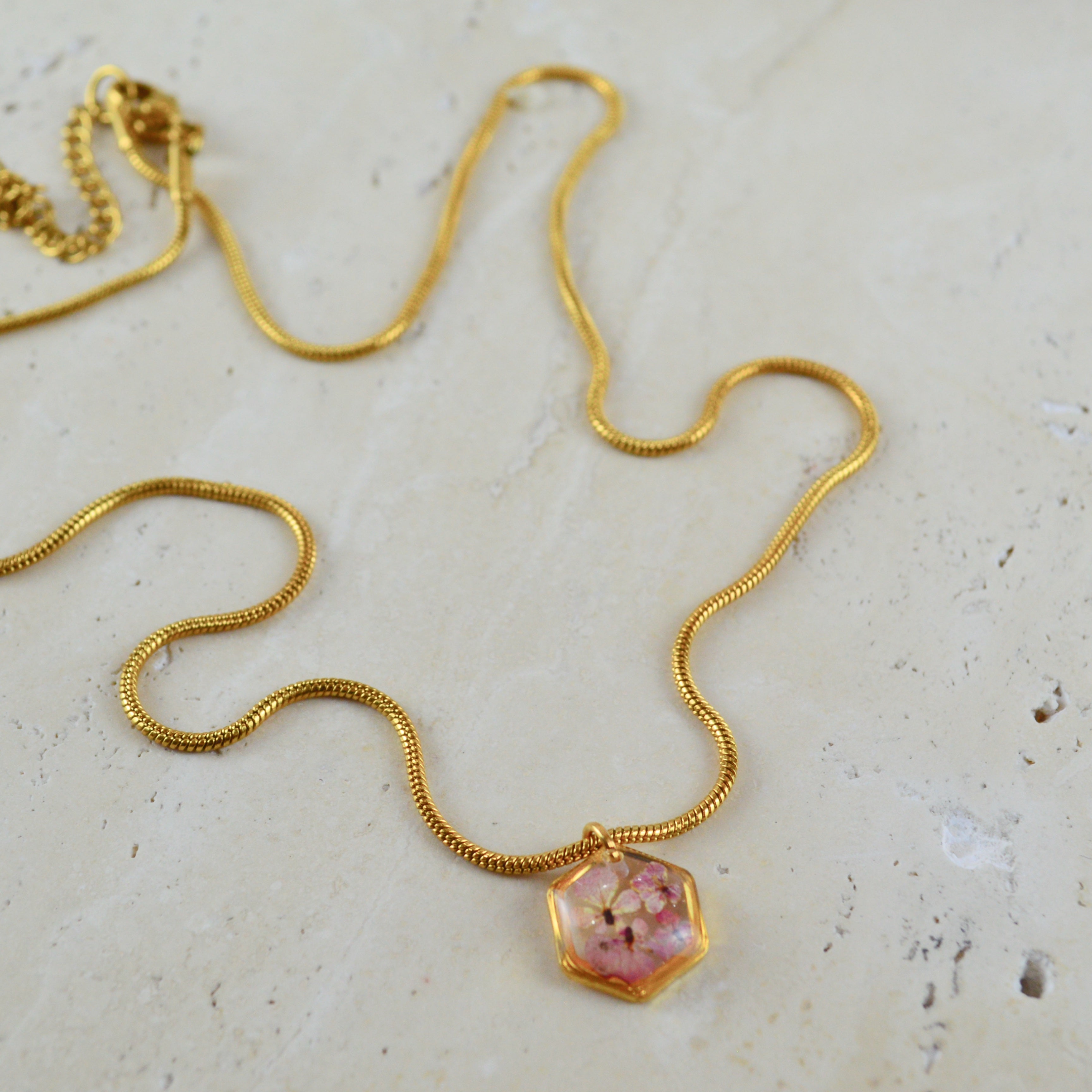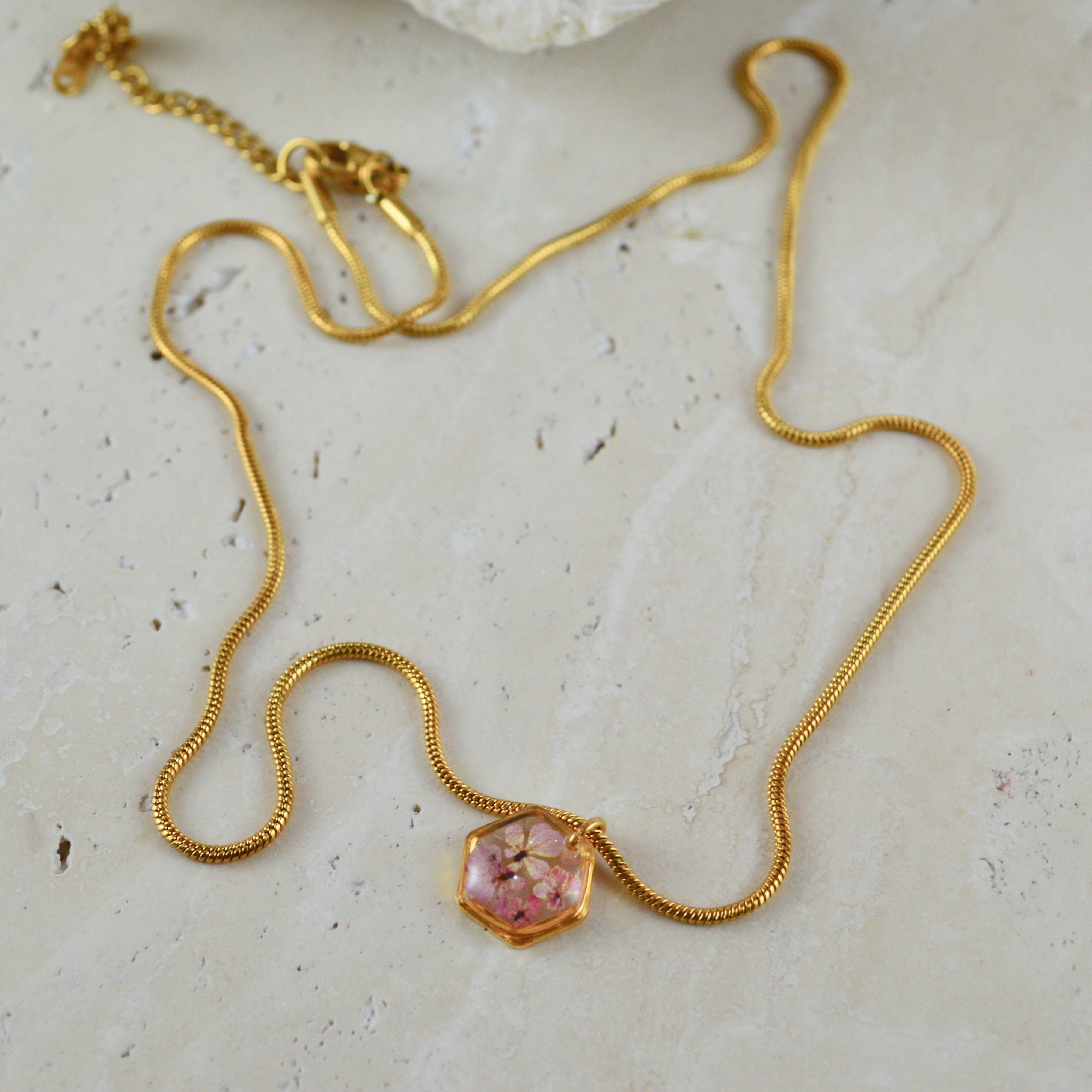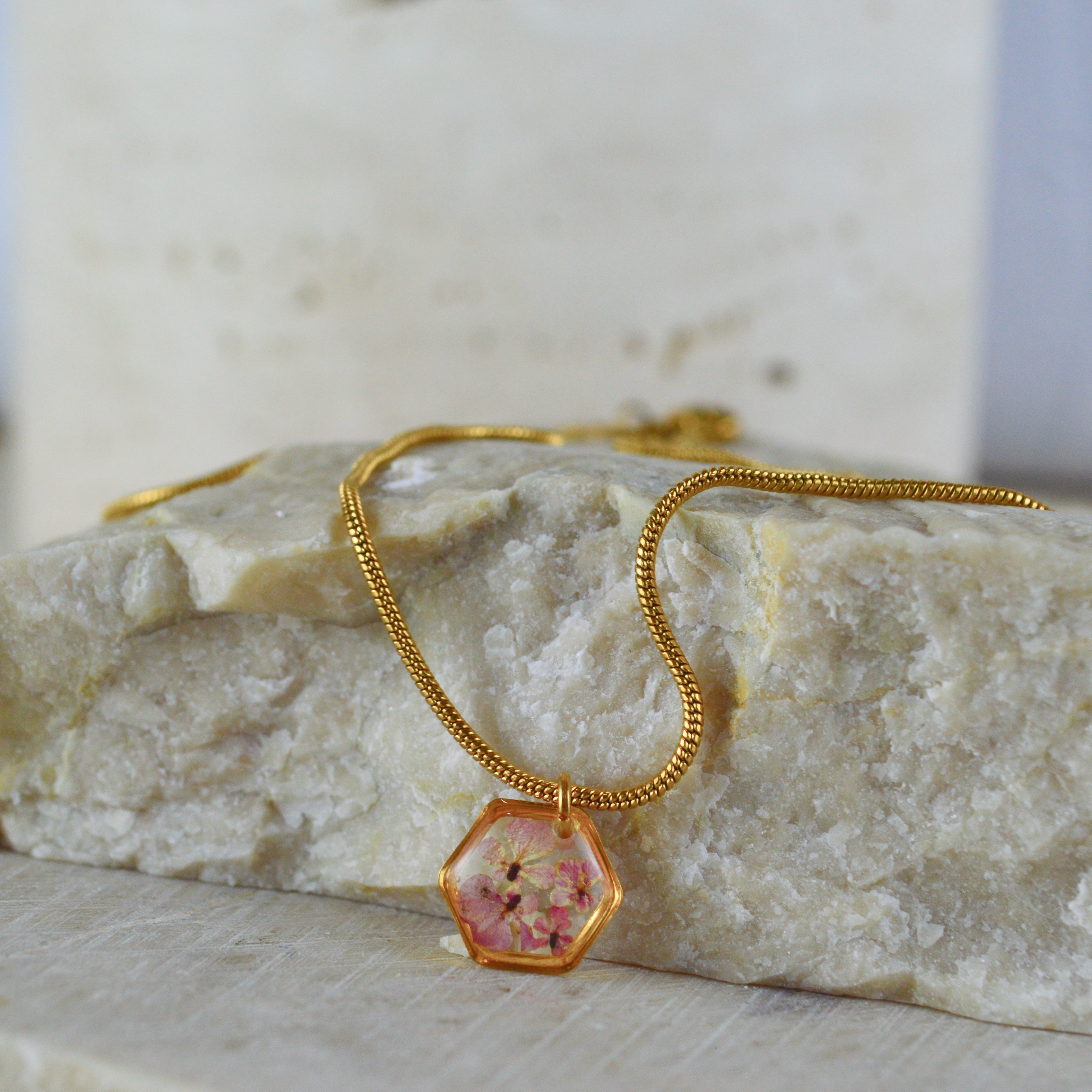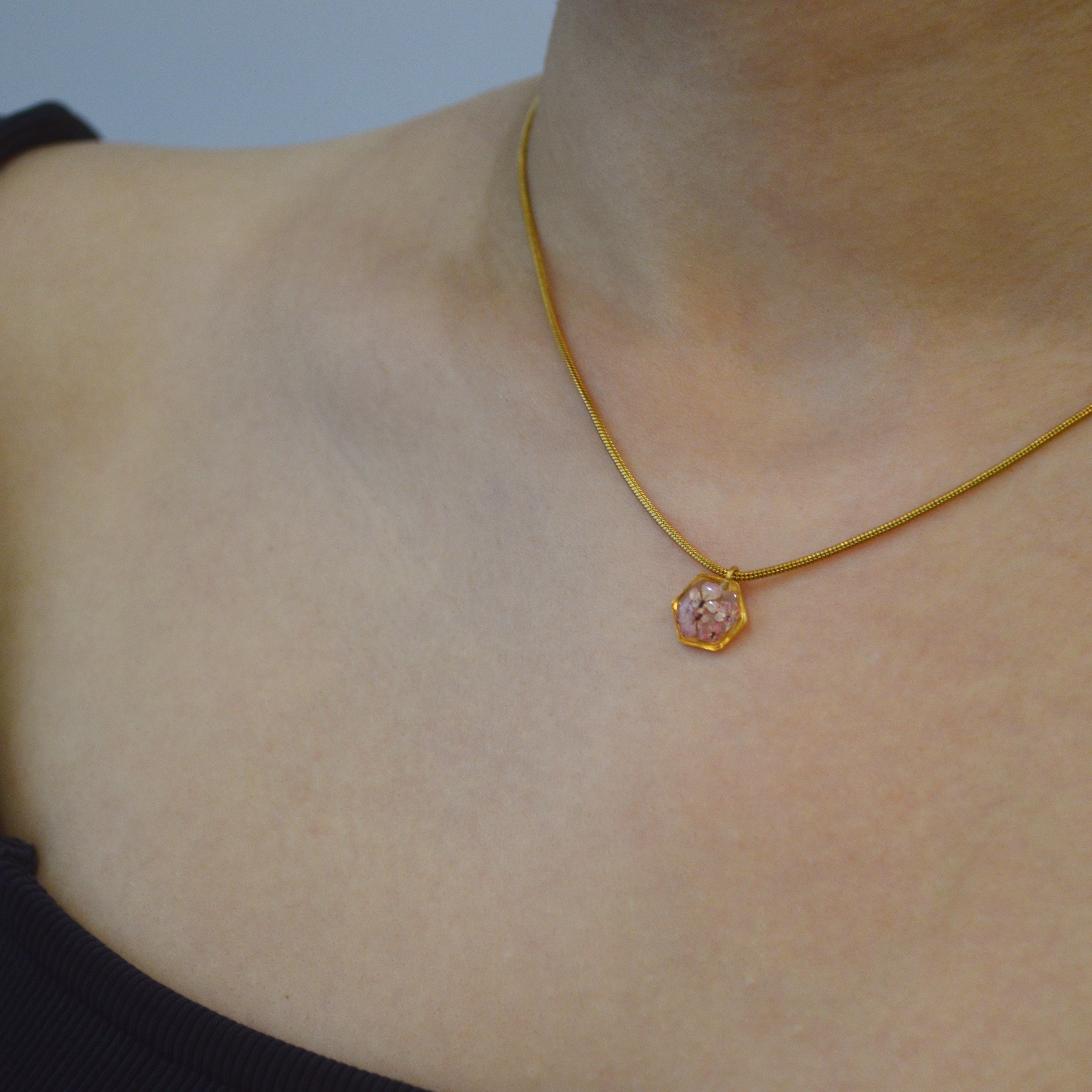 Çiçekler kuruma sürecini tamamladıktan sonra, her biri özenle minik parçalara ayrılır. Her bir çiçek parçası, reçine ile sabitlenerek koruma altına alınır. Bu sayede doğanın zarif dokusu uzun süre bozulmadan korunur ve takıların içinde ölümsüzleşir. Her detay, titizlikle işlenir ve takıya hayat verir.