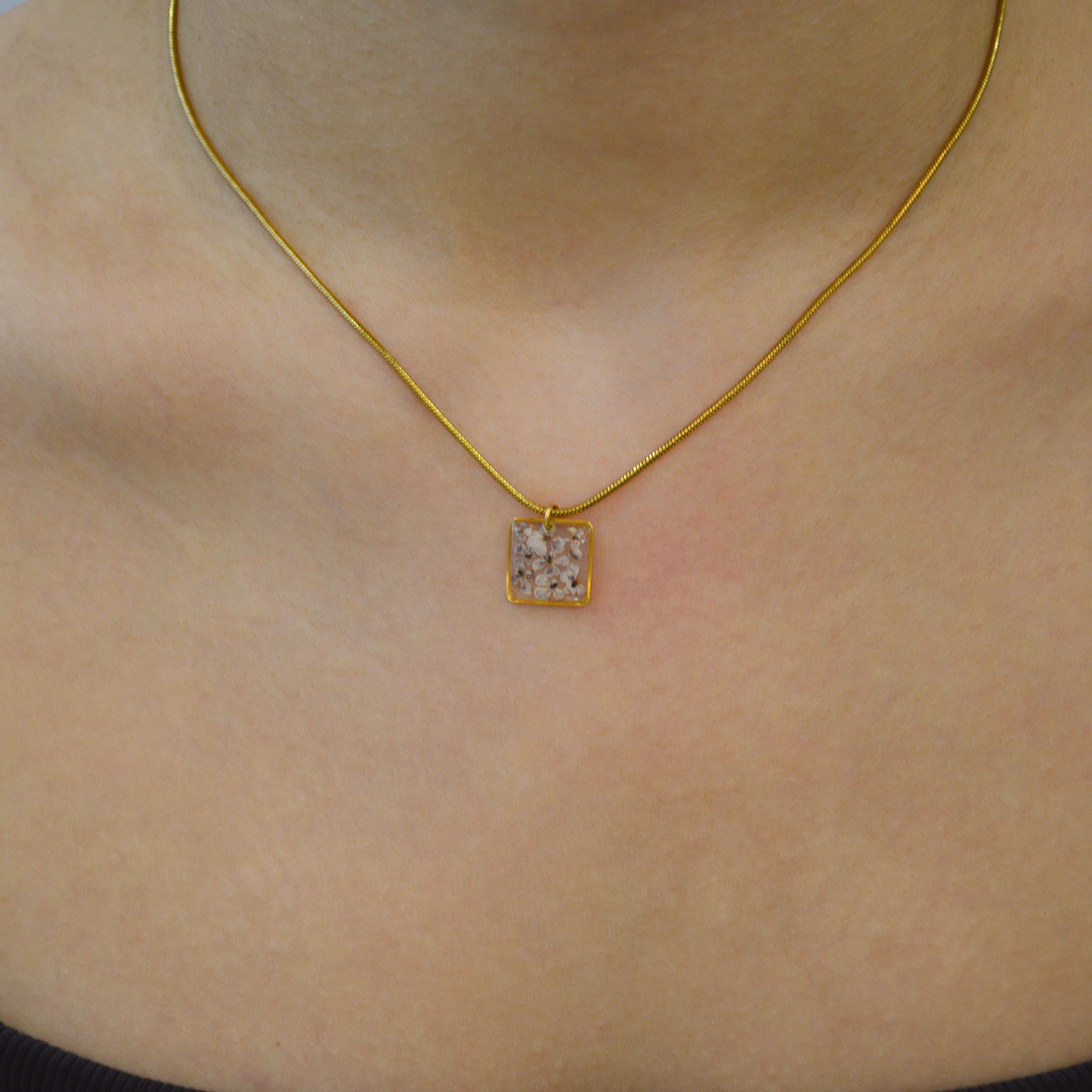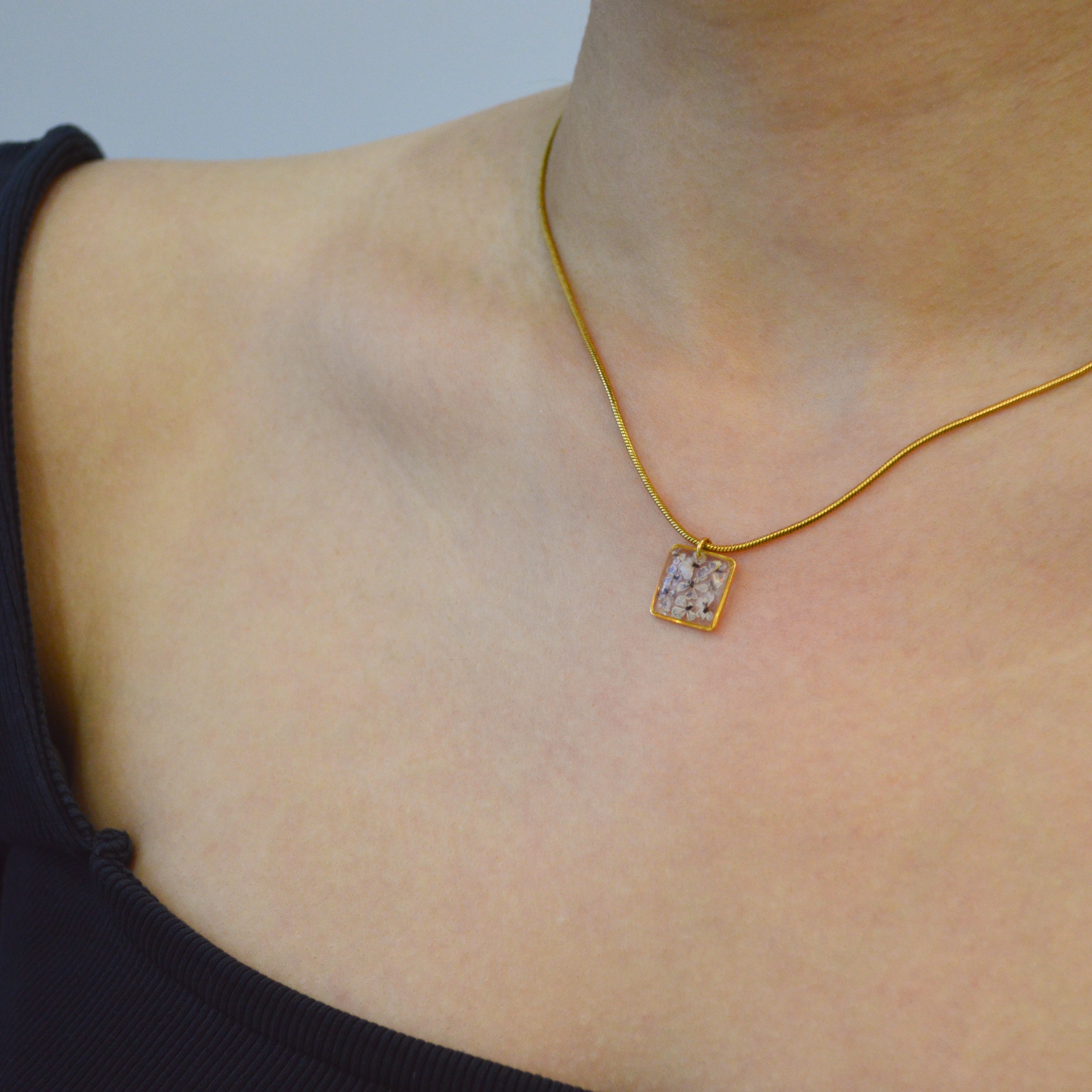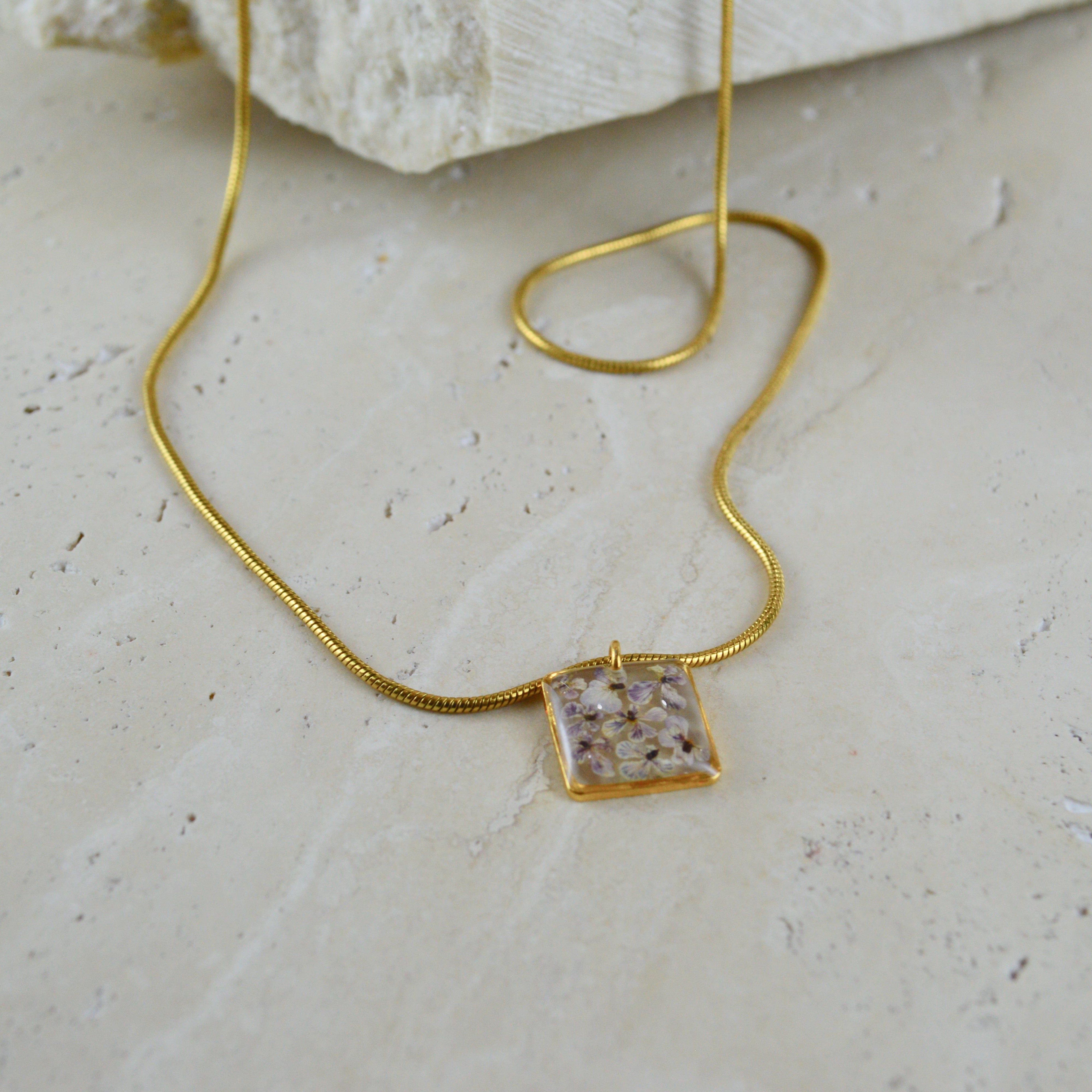Çiçekler kuruma sürecini tamamladıktan sonra, her biri özenle minik parçalara ayrılır. Her bir çiçek parçası, reçine ile sabitlenerek koruma altına alınır. Bu sayede doğanın zarif dokusu uzun süre bozulmadan korunur ve takıların içinde ölümsüzleşir. Her detay, titizlikle işlenir ve takıya hayat verir.