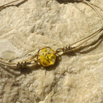 Çiçekli kadın bilekliği ve düz ip erkek bilekliği. Her iki bileklik de ayarlanabilir özelliğe sahip olup, bilek ölçüsüne göre rahatça uyum sağlar.