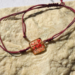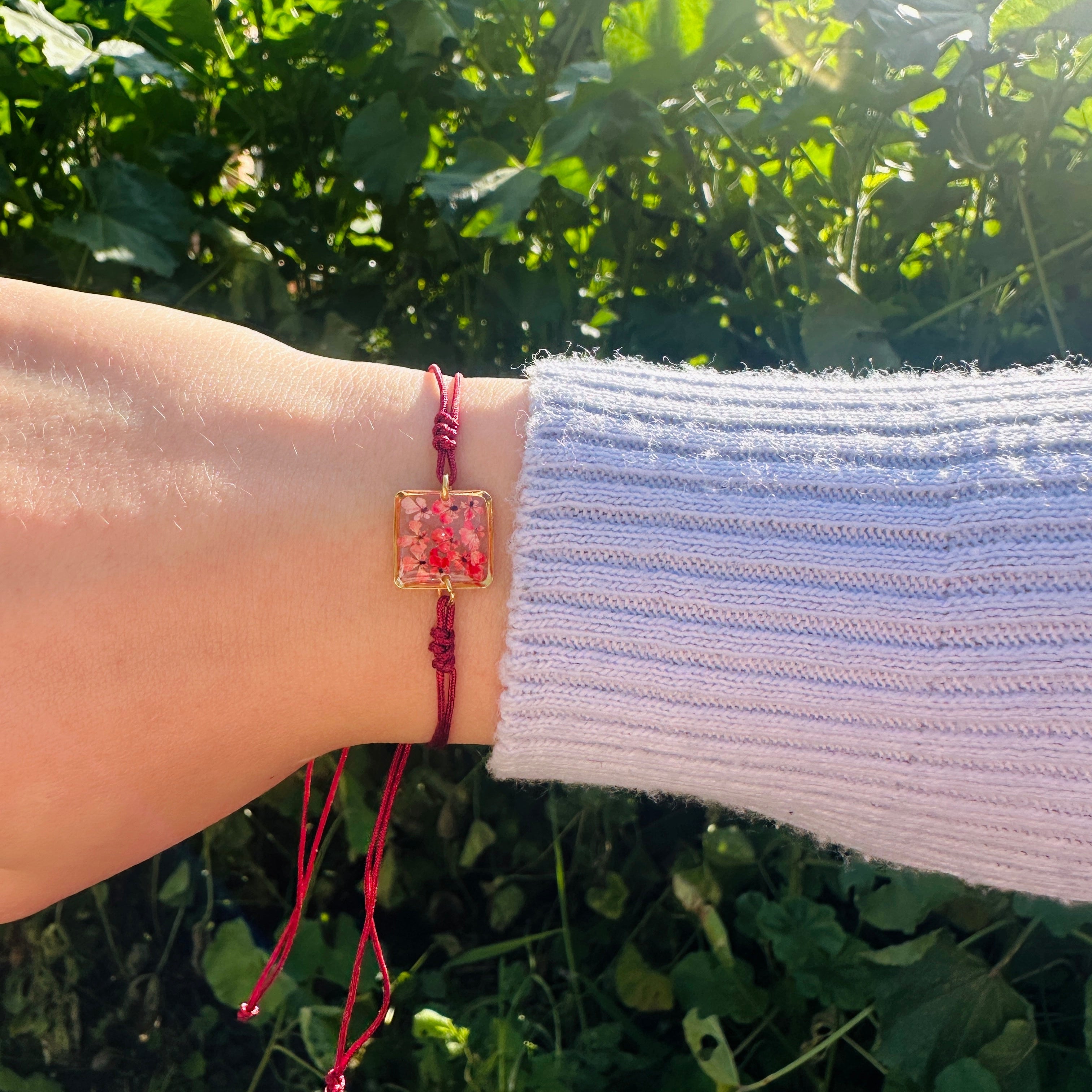 Çiçekli kadın bilekliği ve düz ip erkek bilekliği. Her iki bileklik de ayarlanabilir özelliğe sahip olup, bilek ölçüsüne göre rahatça uyum sağlar.