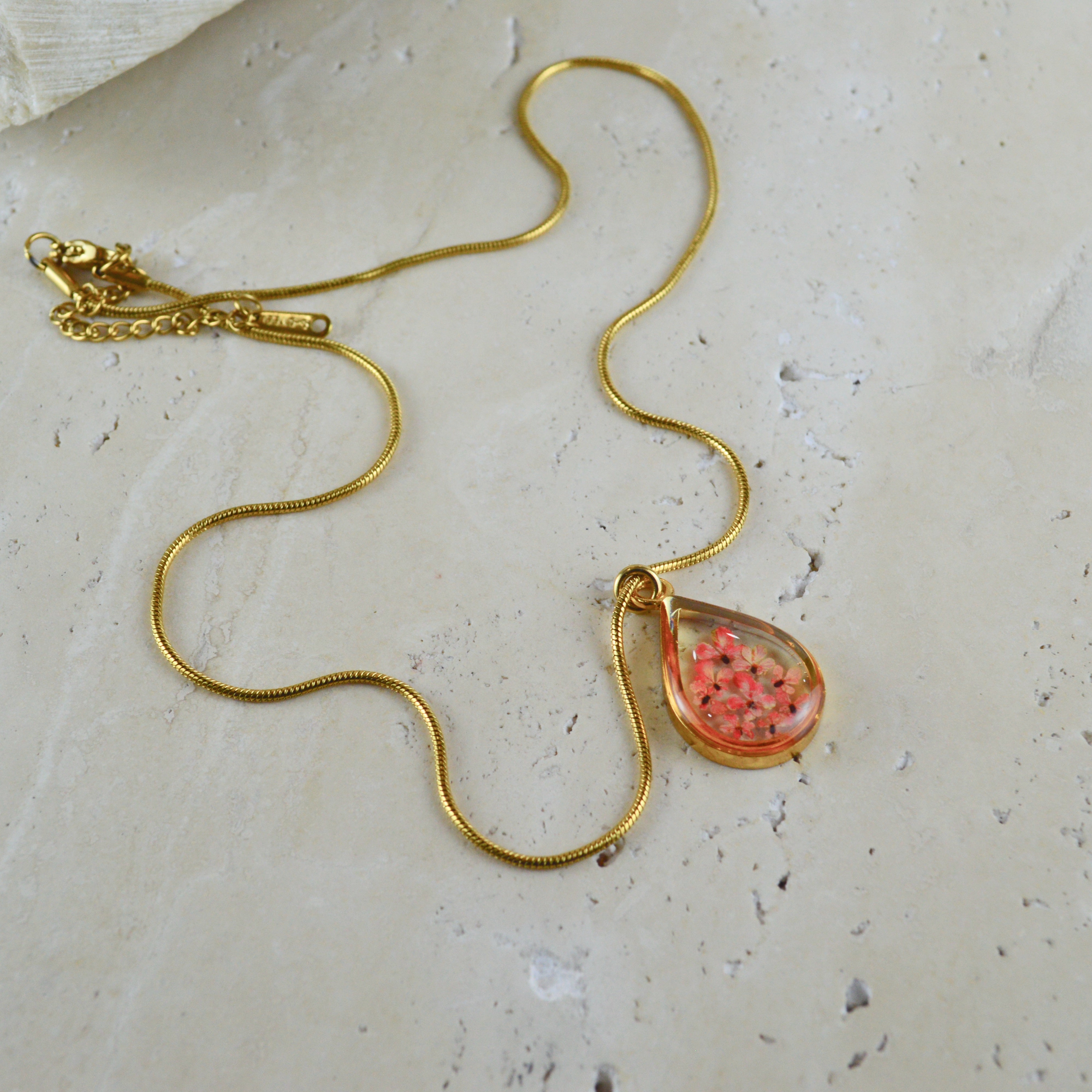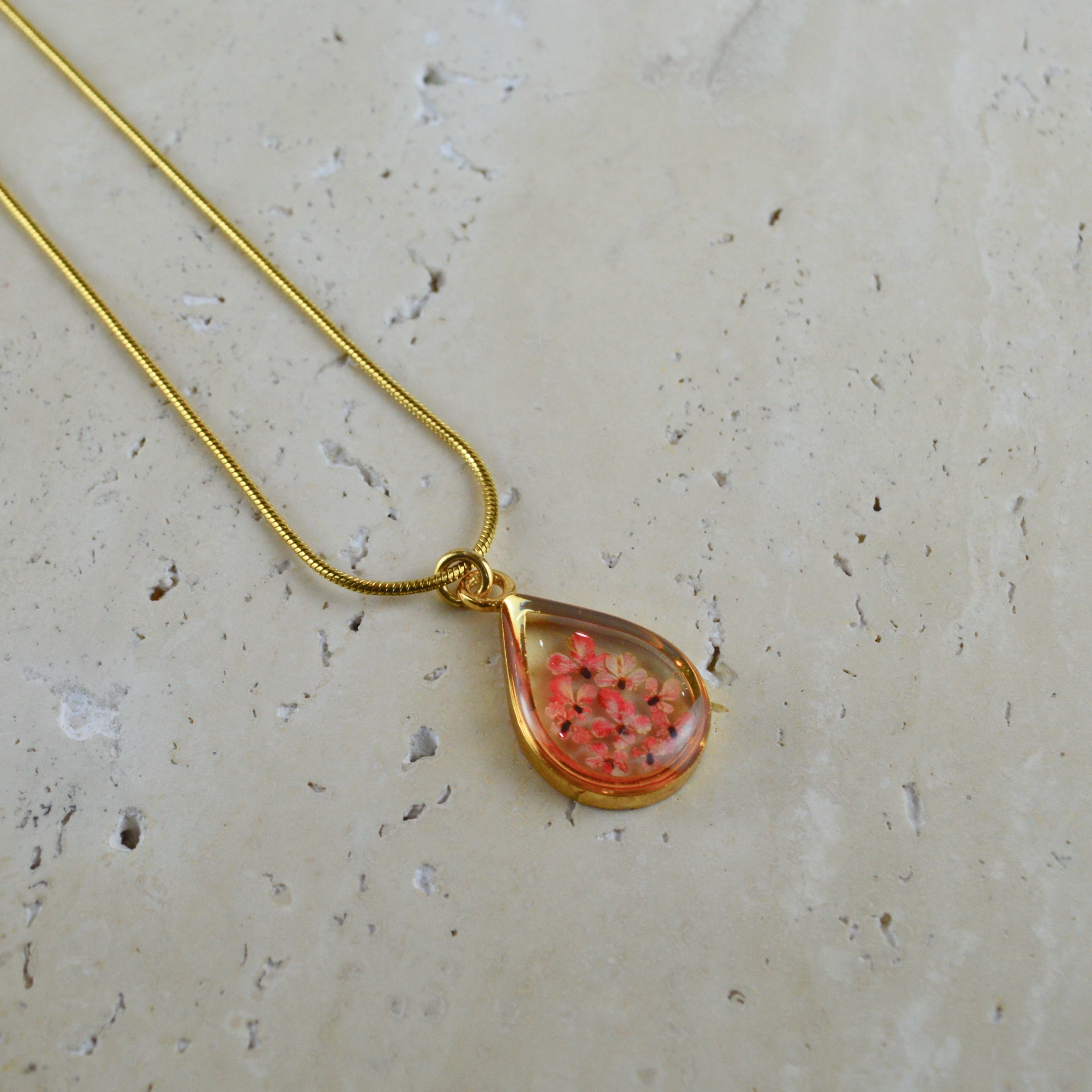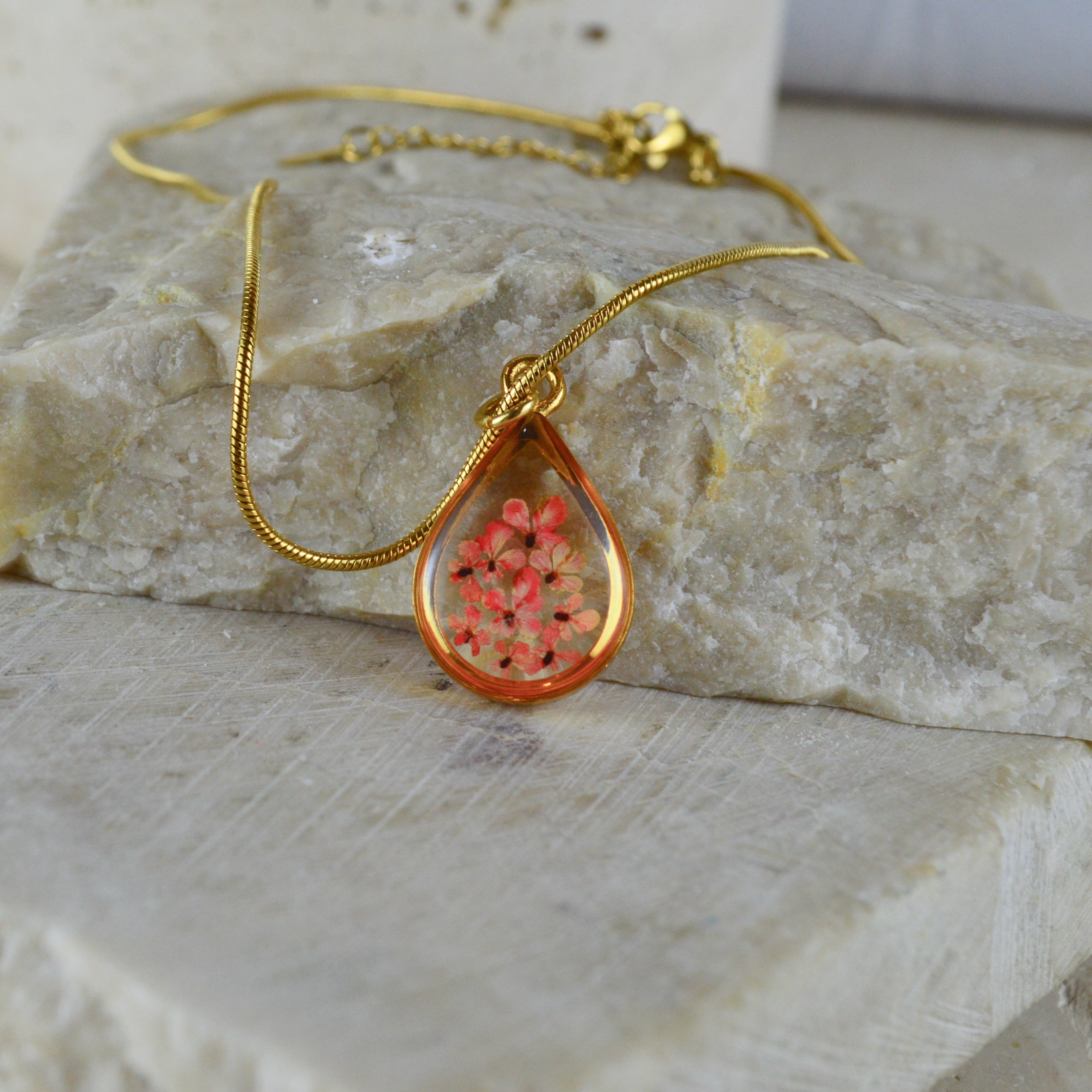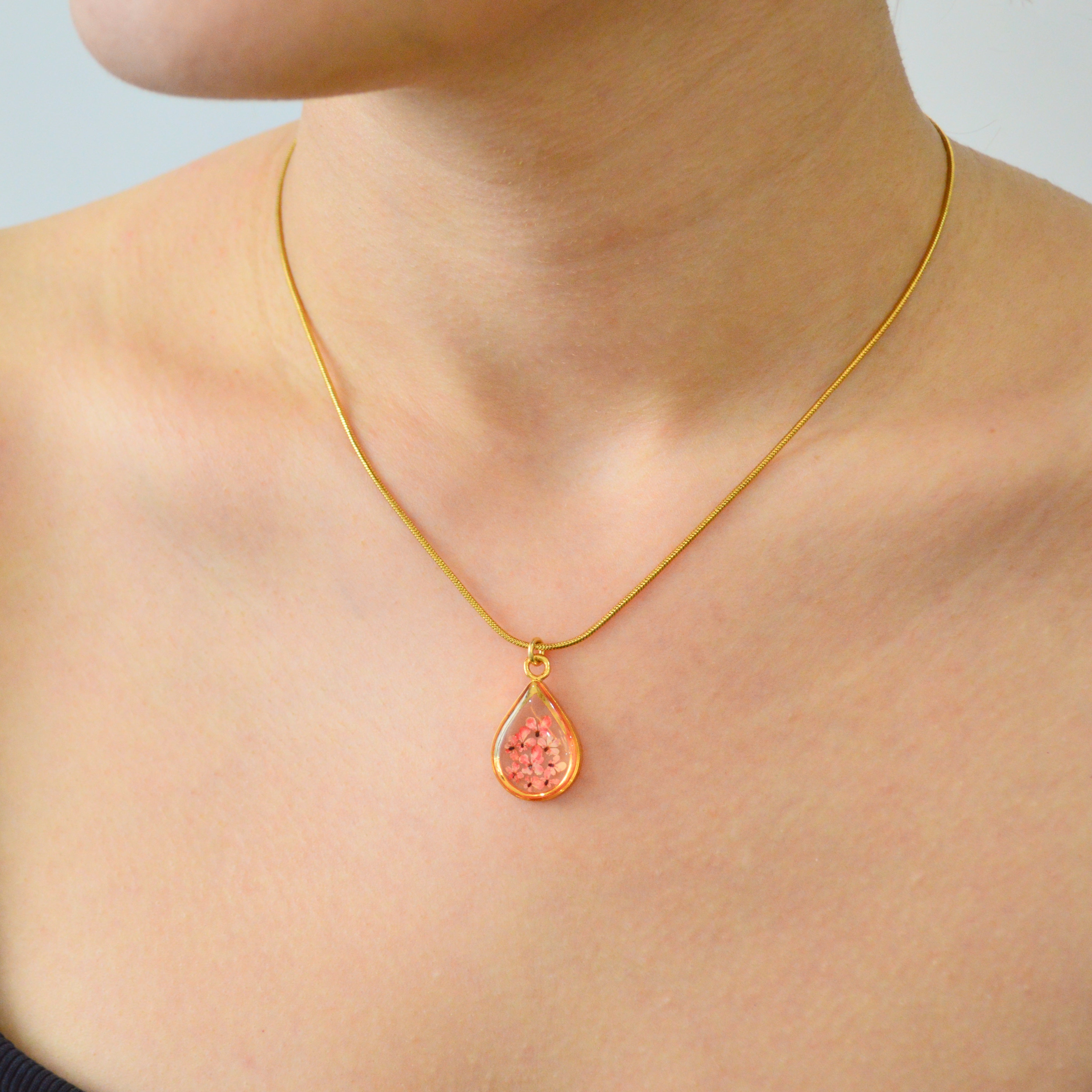 Çiçekler kuruma sürecini tamamladıktan sonra, her biri özenle minik parçalara ayrılır. Her bir çiçek parçası, reçine ile sabitlenerek koruma altına alınır. Bu sayede doğanın zarif dokusu uzun süre bozulmadan korunur ve takıların içinde ölümsüzleşir. Her detay, titizlikle işlenir ve takıya hayat verir.