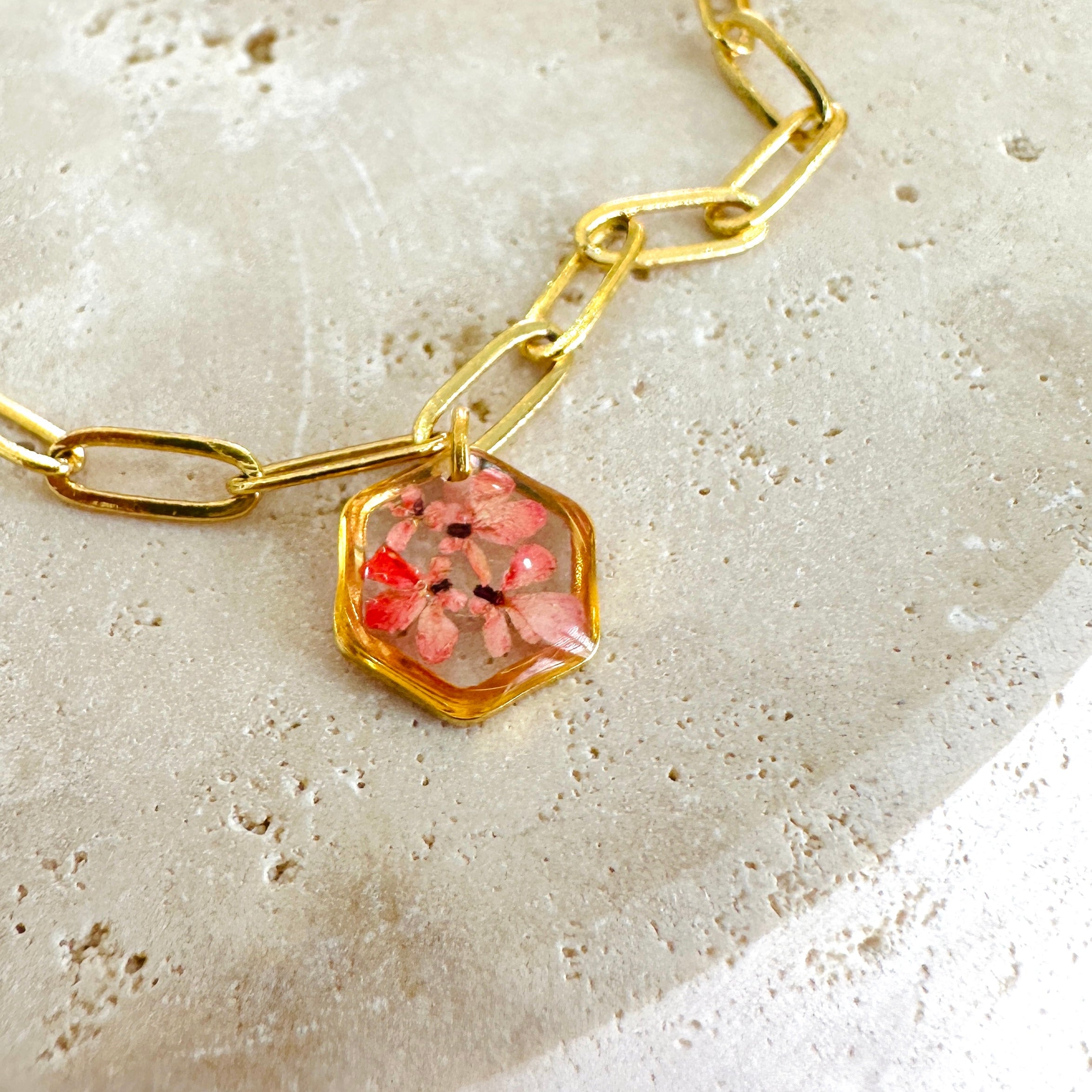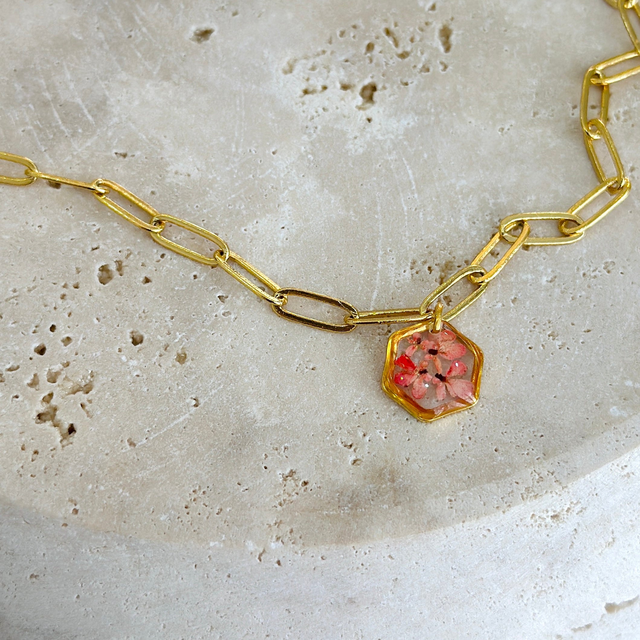 Çiçekler kuruma sürecini tamamladıktan sonra, her biri özenle minik parçalara ayrılır. Her bir çiçek parçası, reçine ile sabitlenerek koruma altına alınır. Bu sayede doğanın zarif dokusu uzun süre bozulmadan korunur ve takıların içinde ölümsüzleşir. Her detay, titizlikle işlenir ve takıya hayat verir.