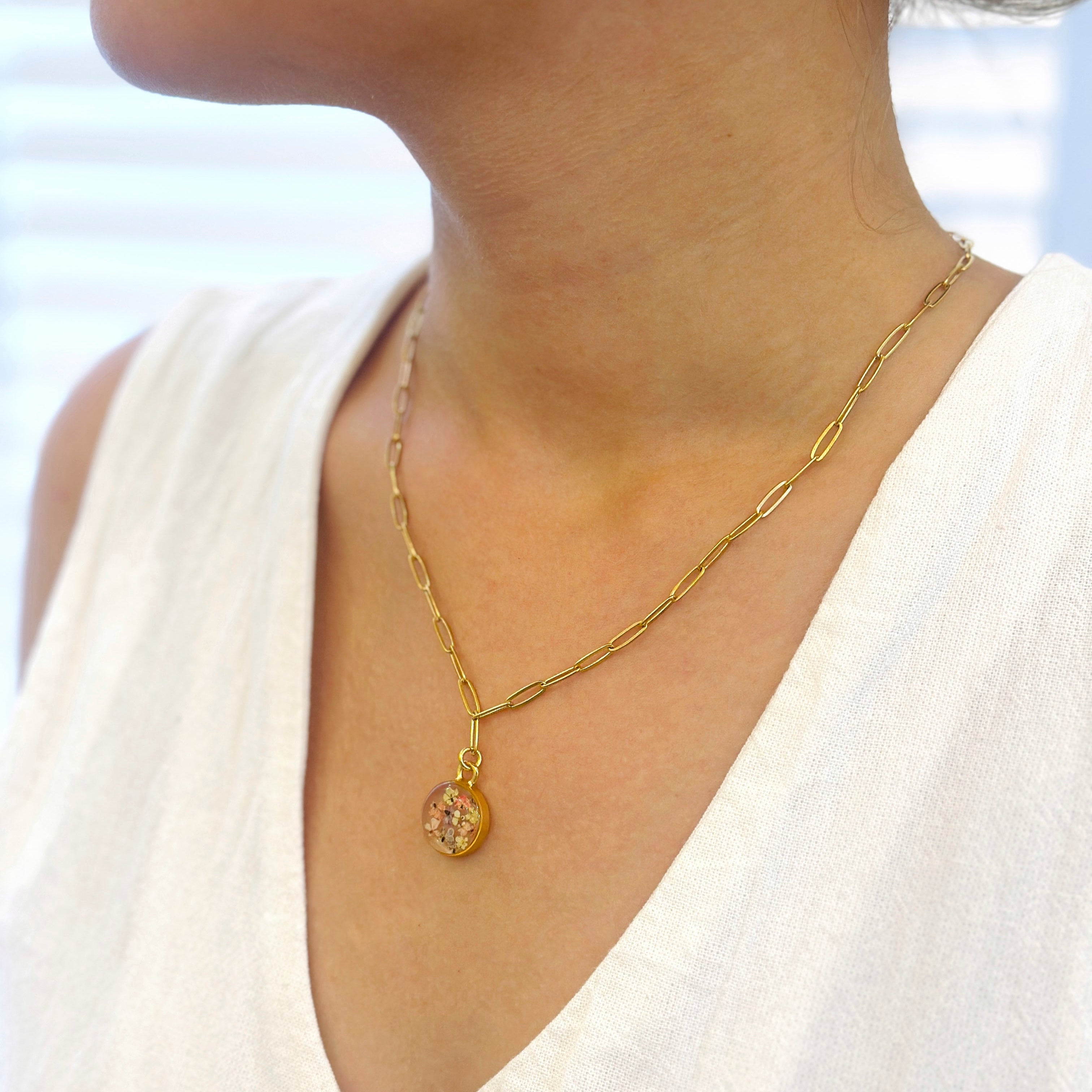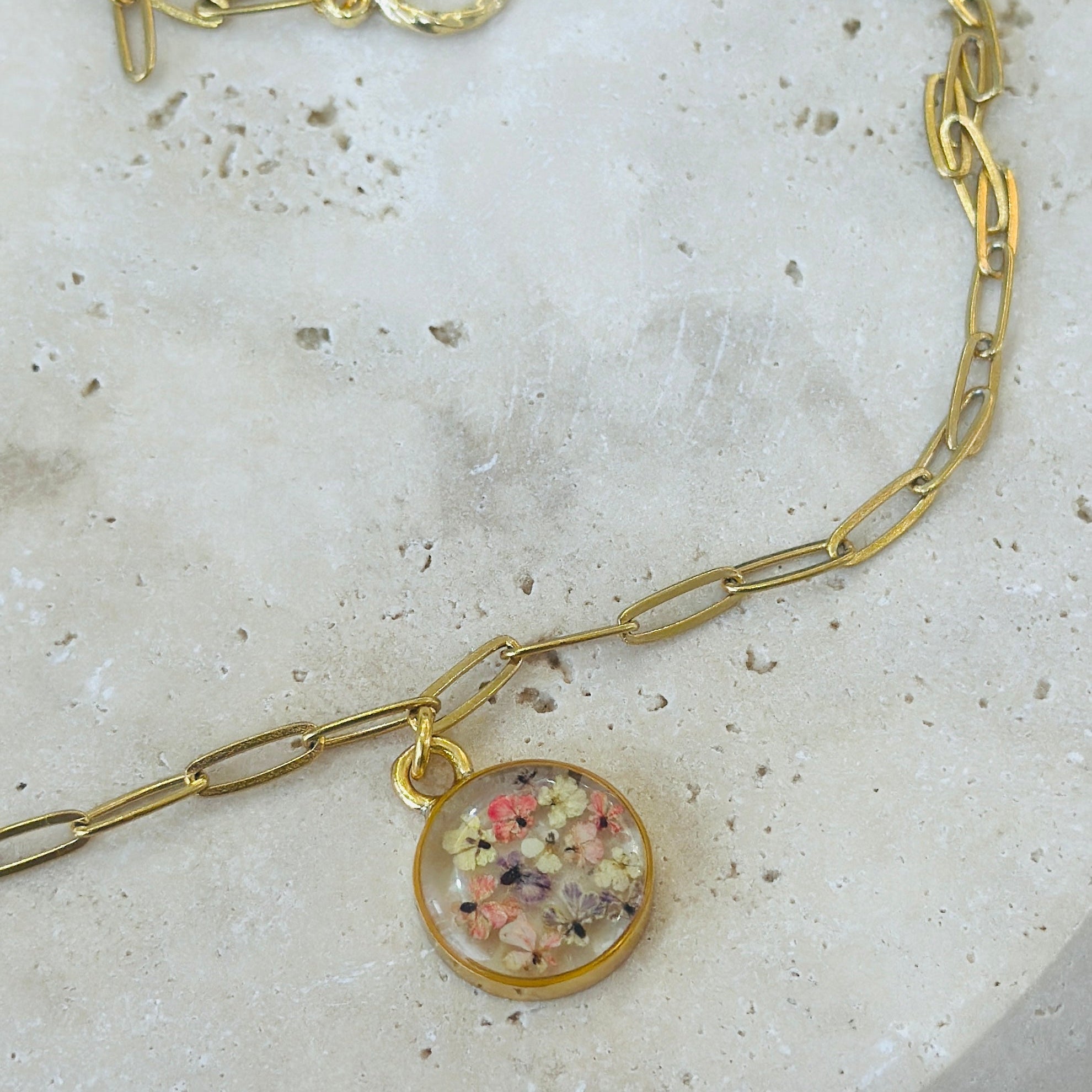 Çiçekler kuruma sürecini tamamladıktan sonra, her biri özenle minik parçalara ayrılır. Her bir çiçek parçası, reçine ile sabitlenerek koruma altına alınır. Bu sayede doğanın zarif dokusu uzun süre bozulmadan korunur ve takıların içinde ölümsüzleşir. Her detay, titizlikle işlenir ve takıya hayat verir.