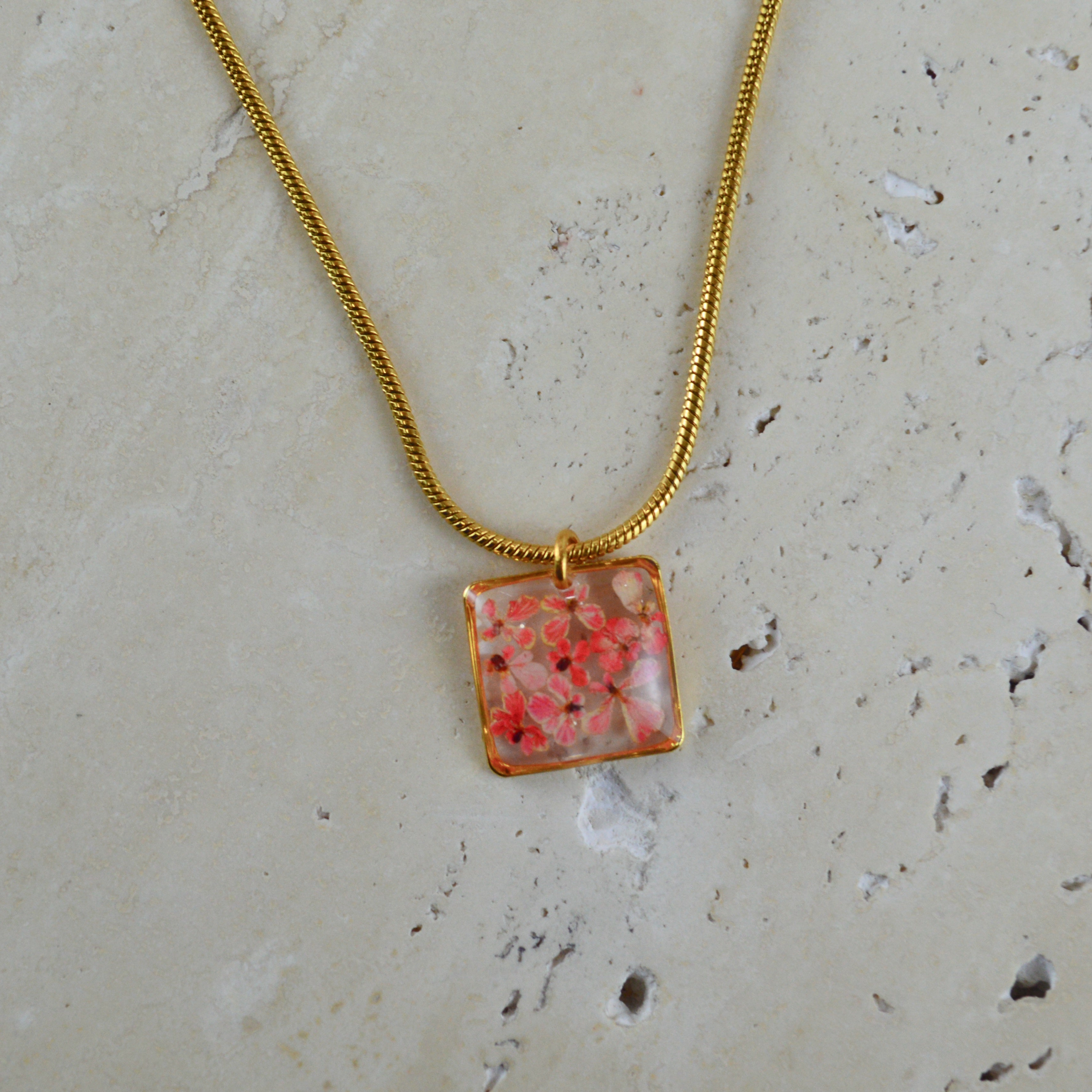 Çiçekler kuruma sürecini tamamladıktan sonra, her biri özenle minik parçalara ayrılır. Her bir çiçek parçası, reçine ile sabitlenerek koruma altına alınır. Bu sayede doğanın zarif dokusu uzun süre bozulmadan korunur ve takıların içinde ölümsüzleşir. Her detay, titizlikle işlenir ve takıya hayat verir.