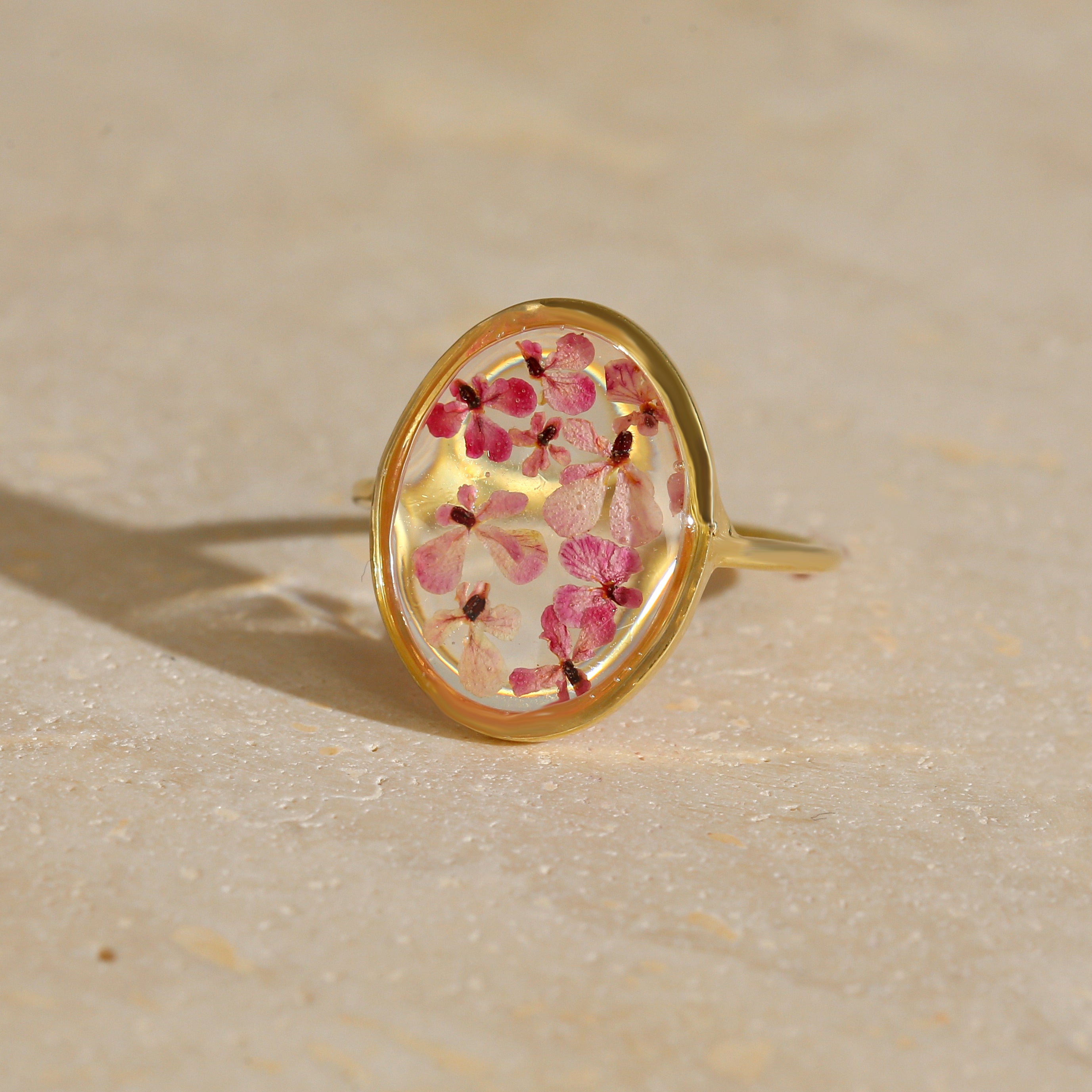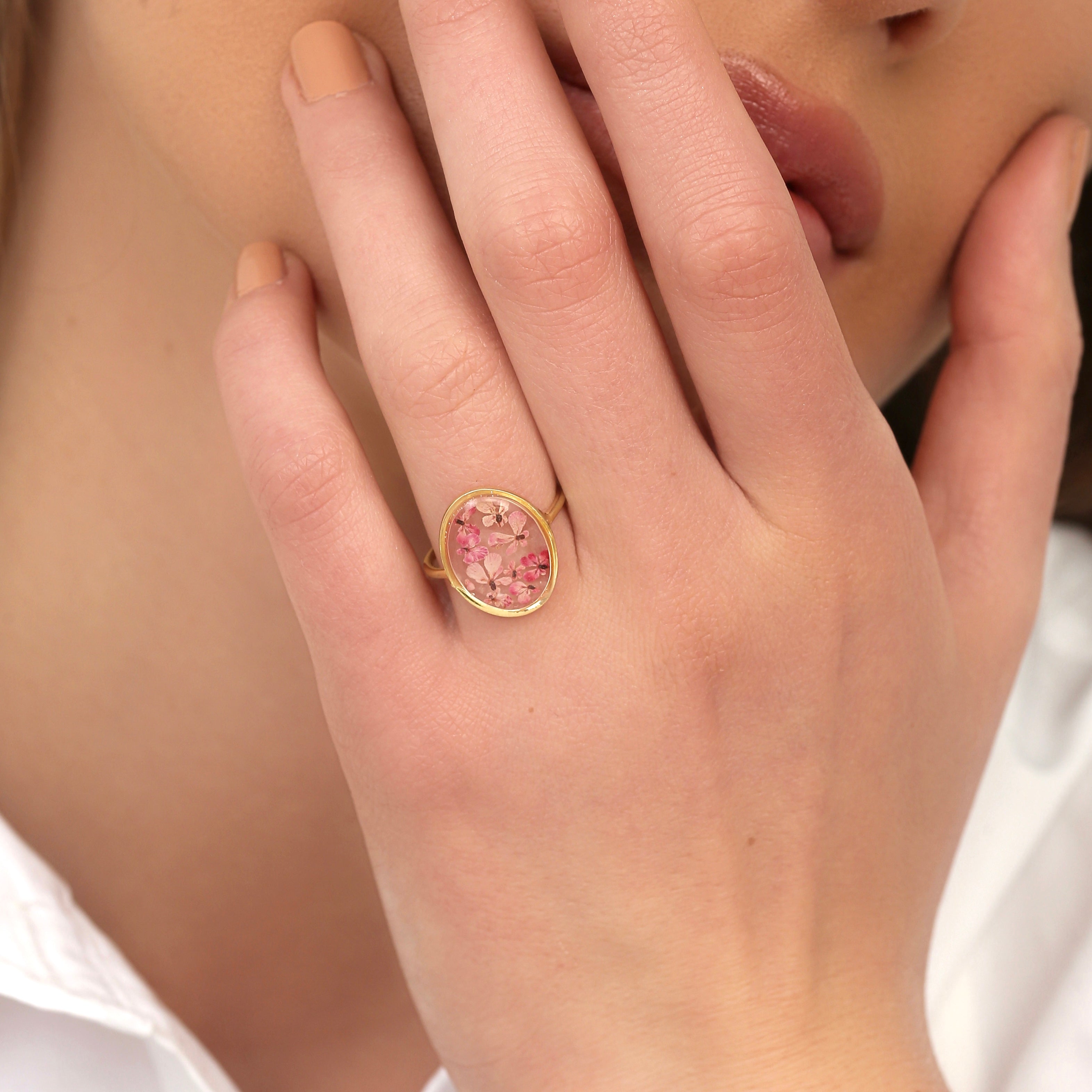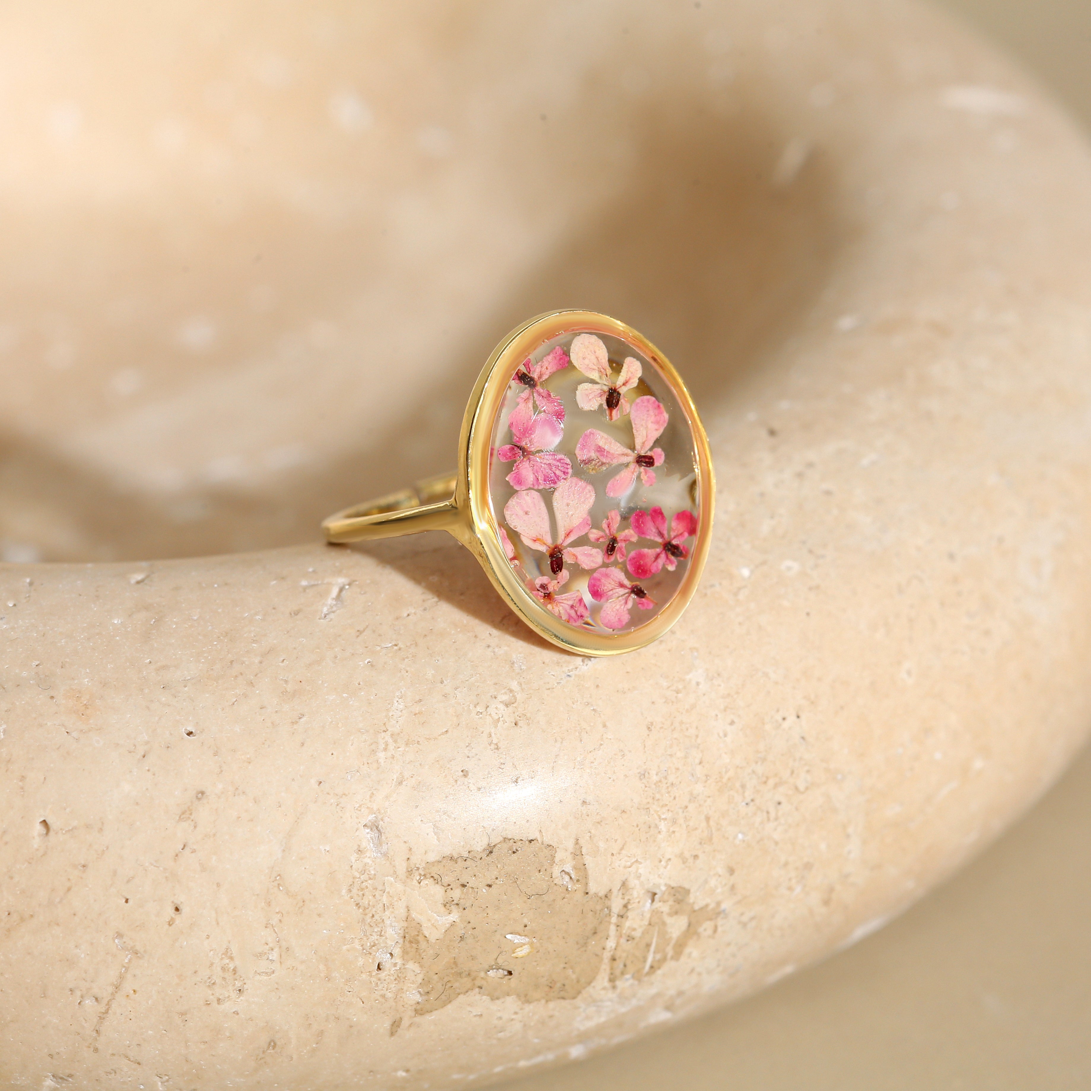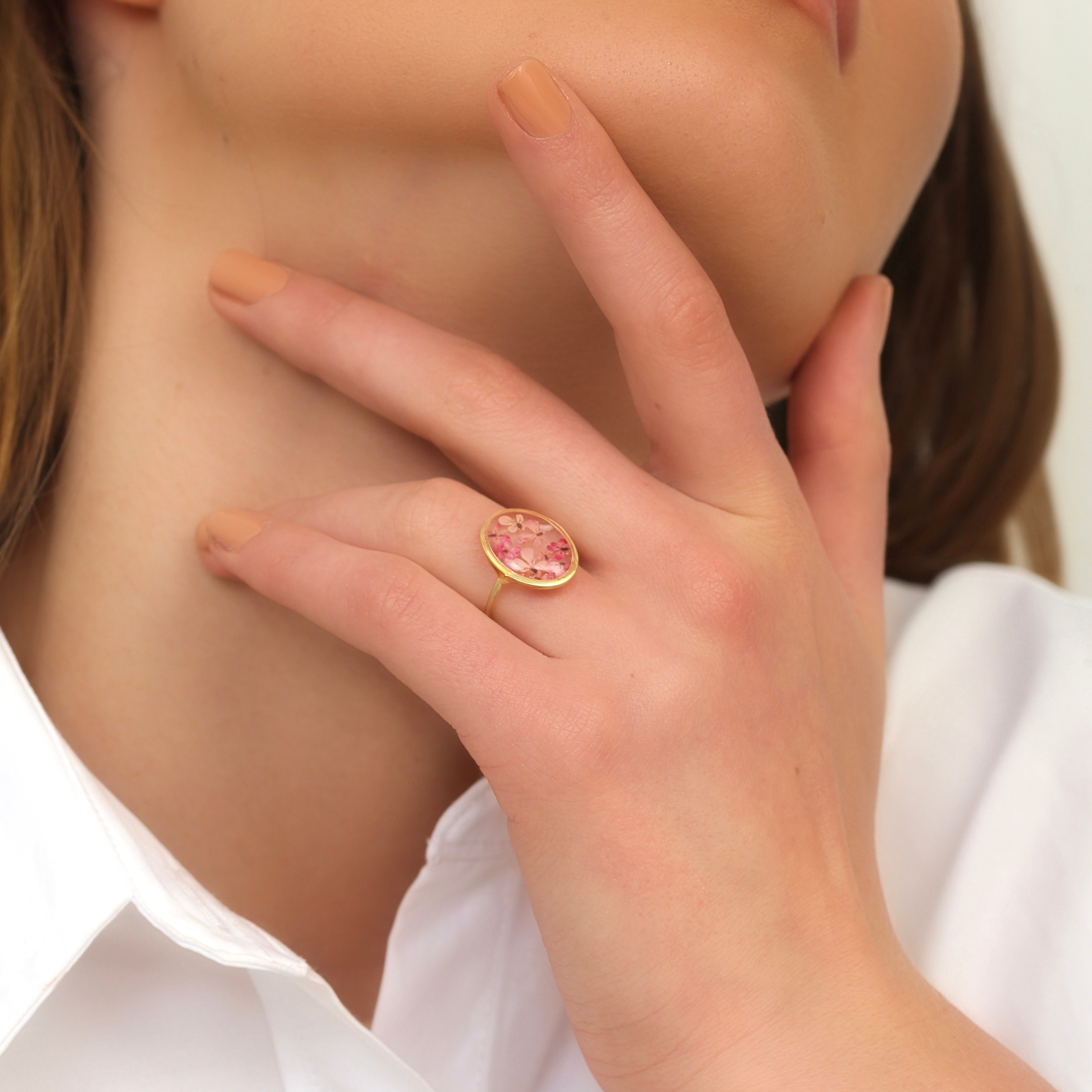 Çiçekler kuruma sürecini tamamladıktan sonra, her biri özenle minik parçalara ayrılır. Her bir çiçek parçası, reçine ile sabitlenerek koruma altına alınır. Bu sayede doğanın zarif dokusu uzun süre bozulmadan korunur ve takıların içinde ölümsüzleşir. Her detay, titizlikle işlenir ve takıya hayat verir.