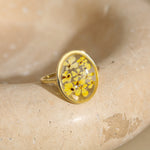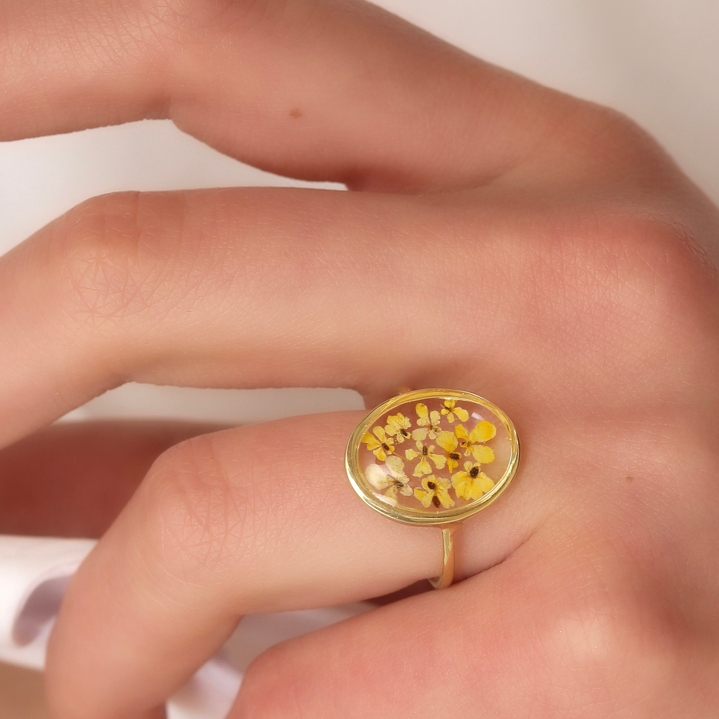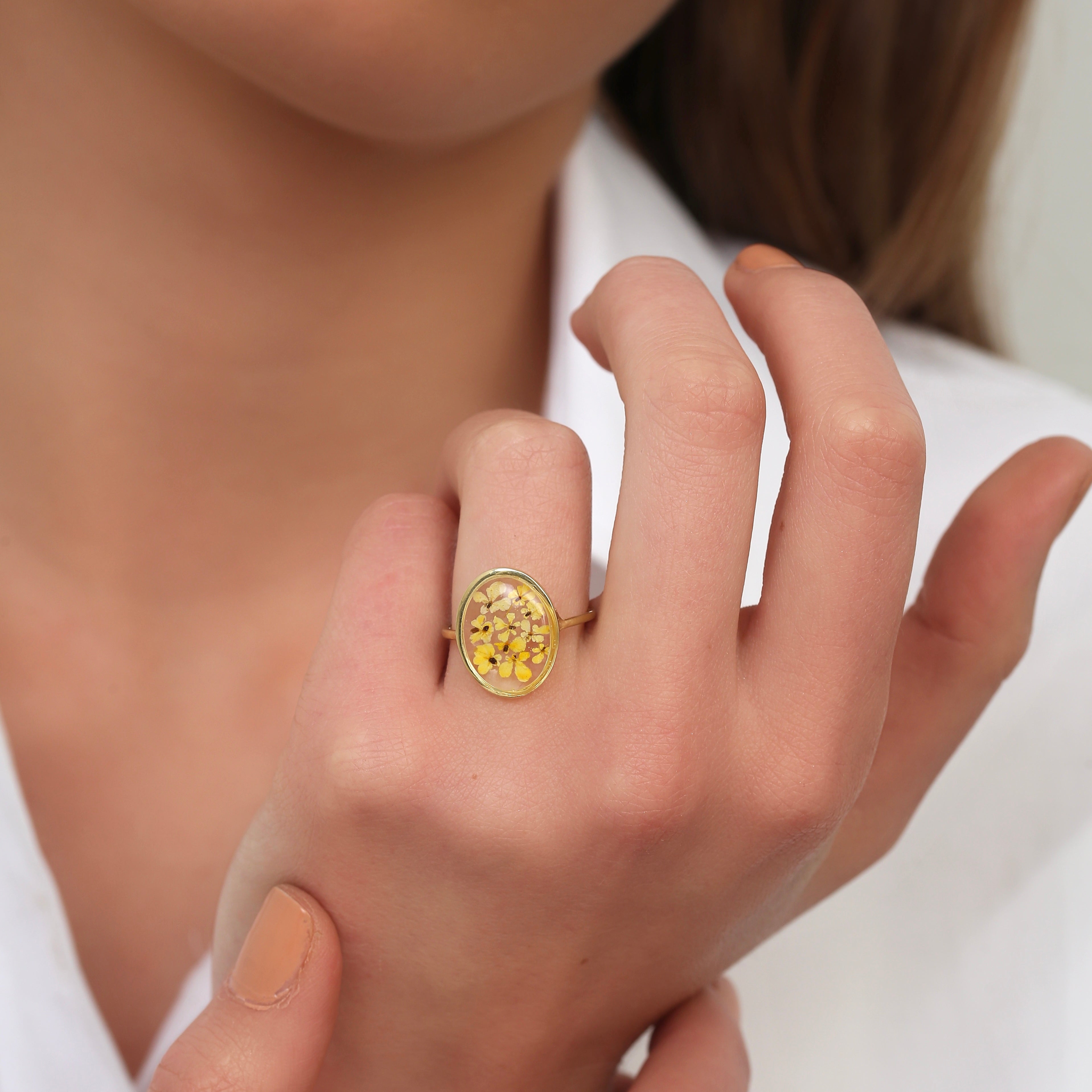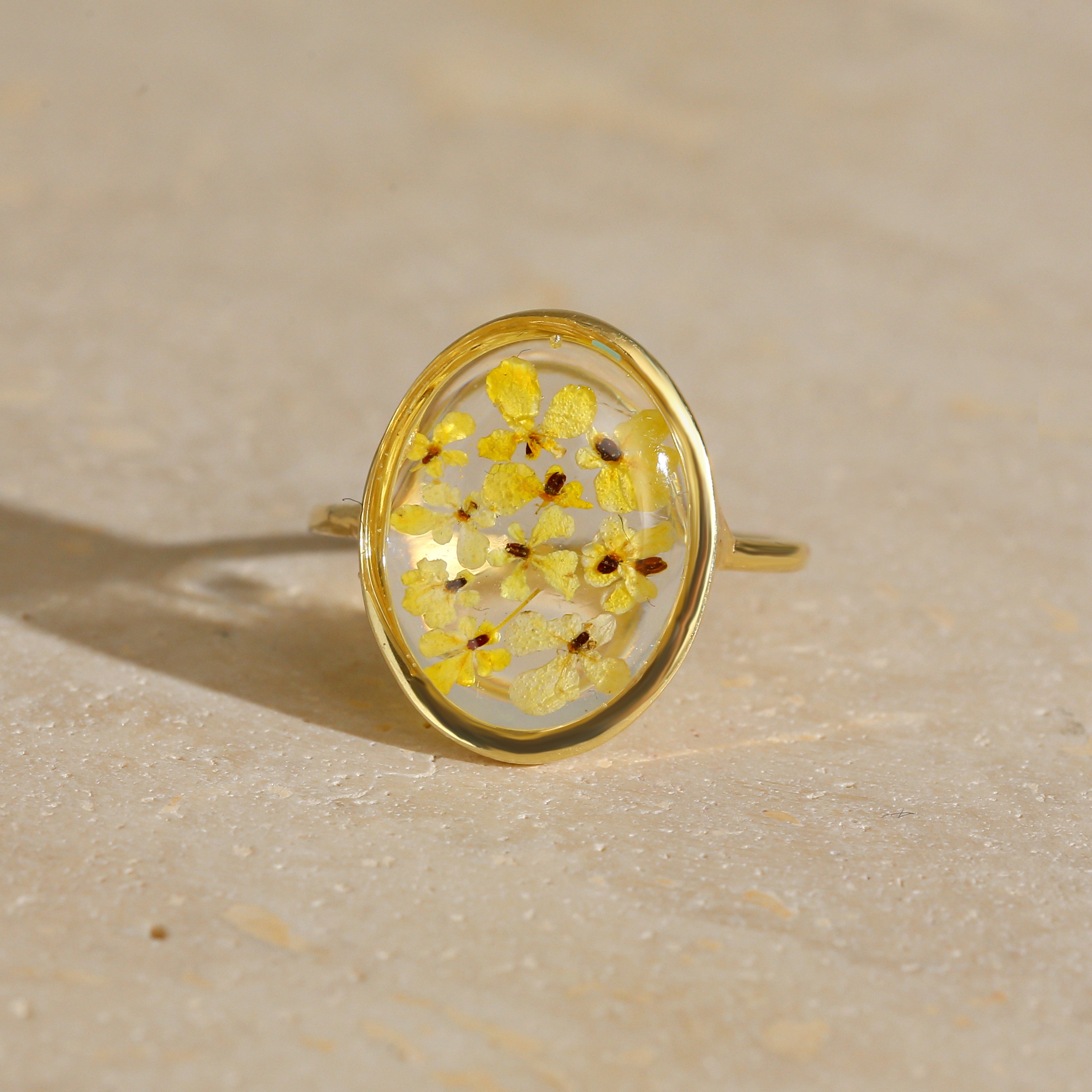 Çiçekler kuruma sürecini tamamladıktan sonra, her biri özenle minik parçalara ayrılır. Her bir çiçek parçası, reçine ile sabitlenerek koruma altına alınır. Bu sayede doğanın zarif dokusu uzun süre bozulmadan korunur ve takıların içinde ölümsüzleşir. Her detay, titizlikle işlenir ve takıya hayat verir.