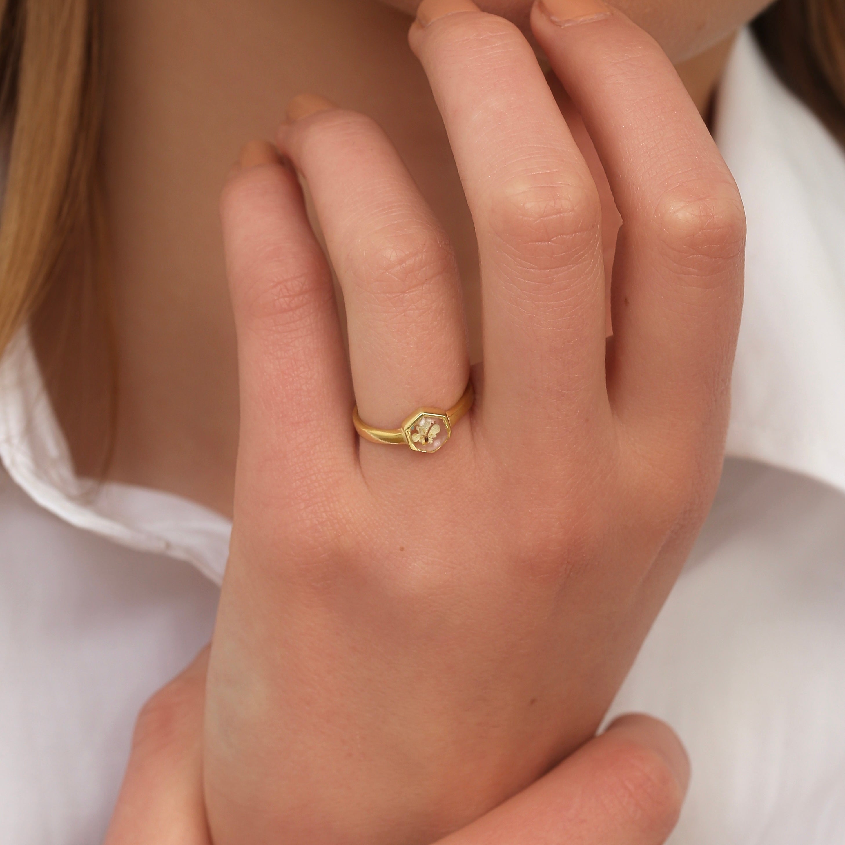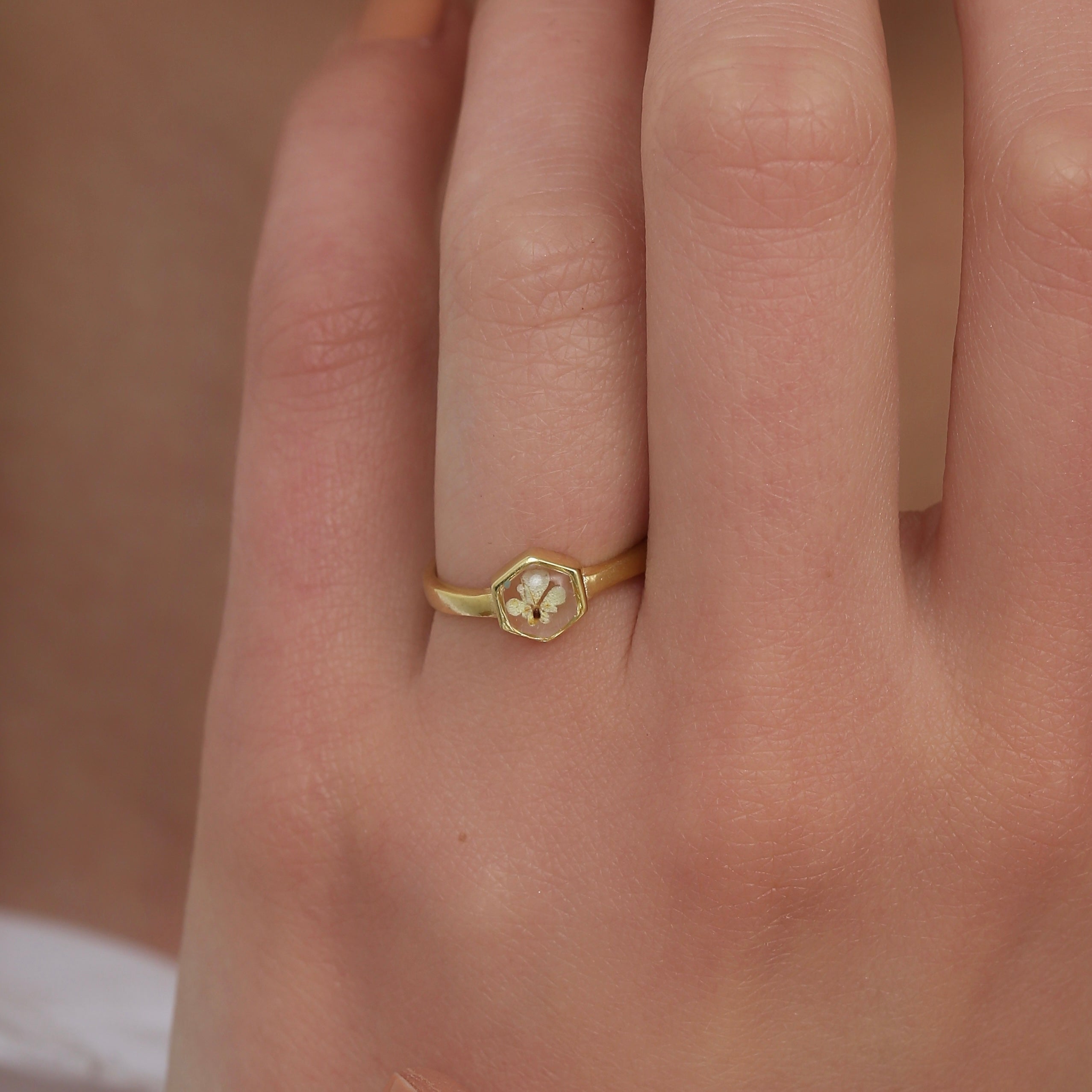 Çiçekler kuruma sürecini tamamladıktan sonra, her biri özenle minik parçalara ayrılır. Her bir çiçek parçası, reçine ile sabitlenerek koruma altına alınır. Bu sayede doğanın zarif dokusu uzun süre bozulmadan korunur ve takıların içinde ölümsüzleşir. Her detay, titizlikle işlenir ve takıya hayat verir.
