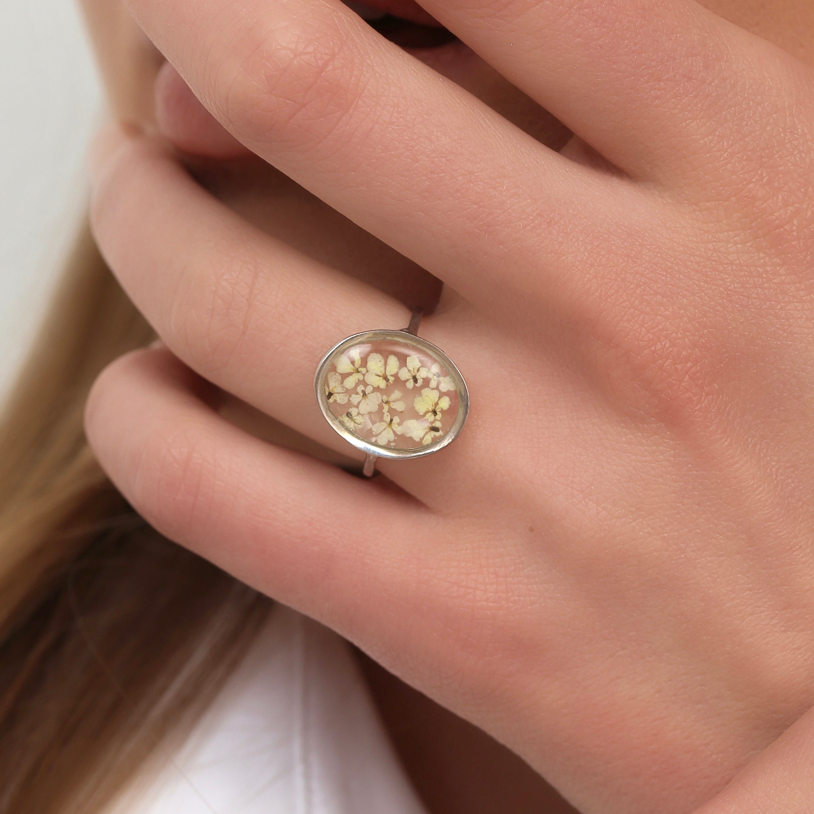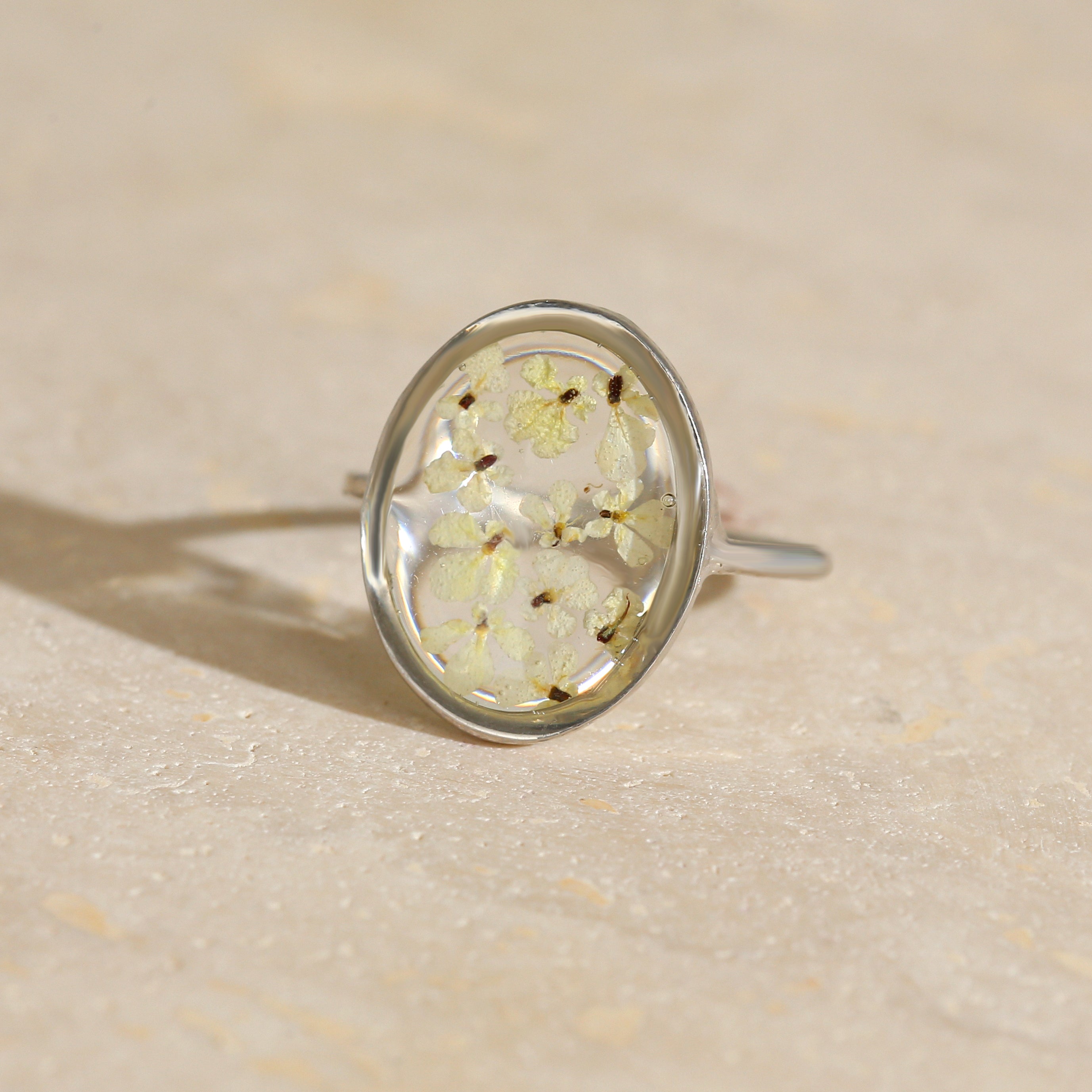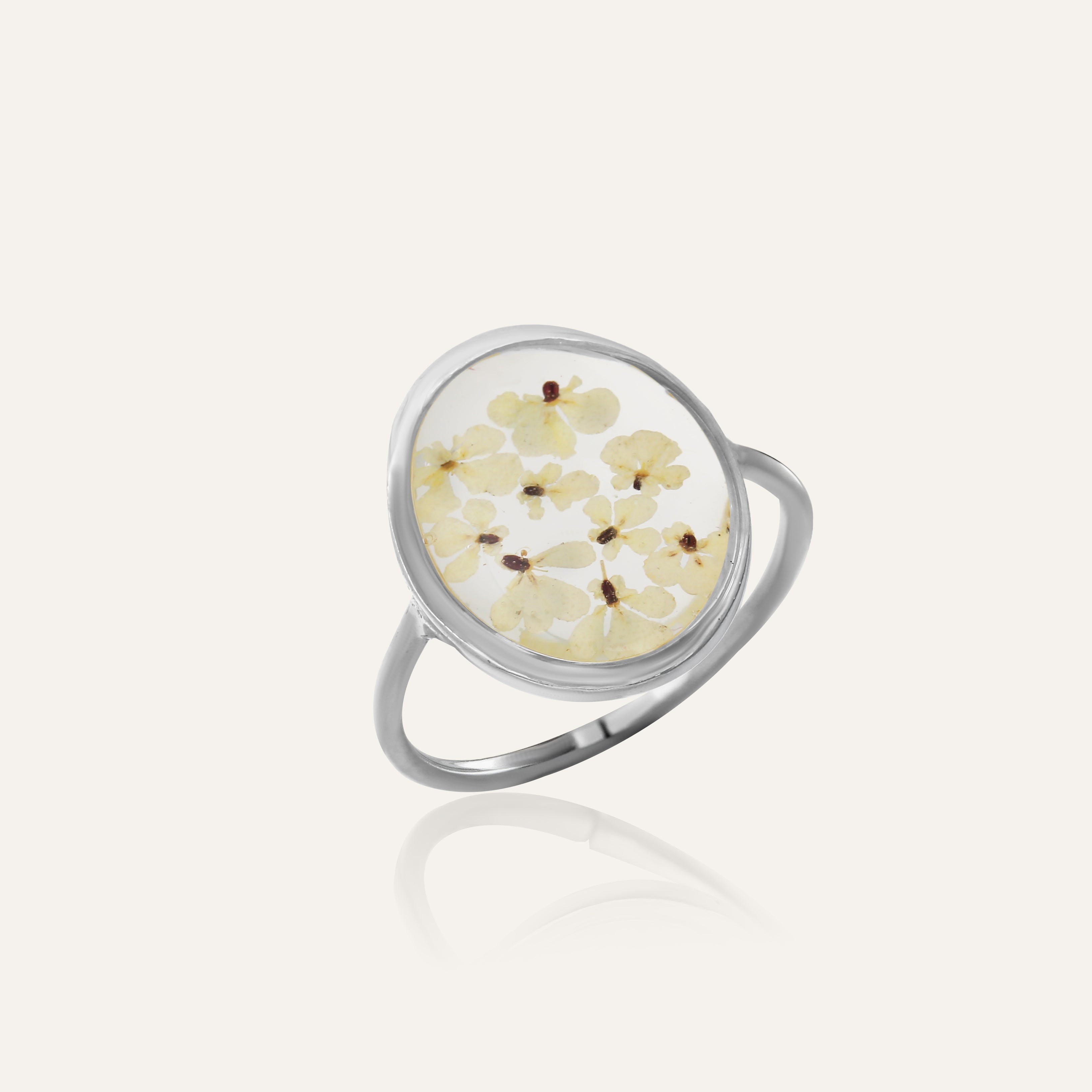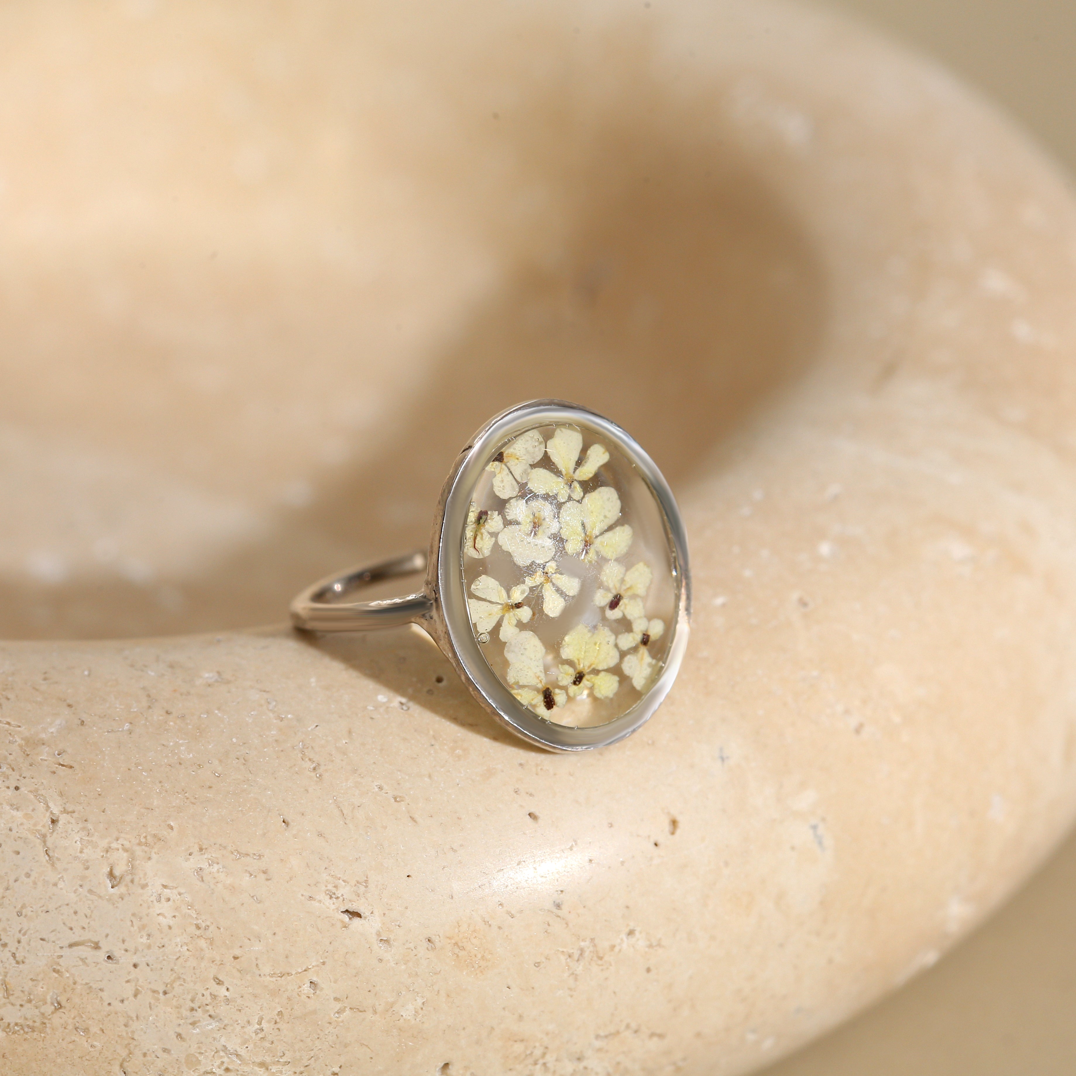 Çiçekler kuruma sürecini tamamladıktan sonra, her biri özenle minik parçalara ayrılır. Her bir çiçek parçası, reçine ile sabitlenerek koruma altına alınır. Bu sayede doğanın zarif dokusu uzun süre bozulmadan korunur ve takıların içinde ölümsüzleşir. Her detay, titizlikle işlenir ve takıya hayat verir.