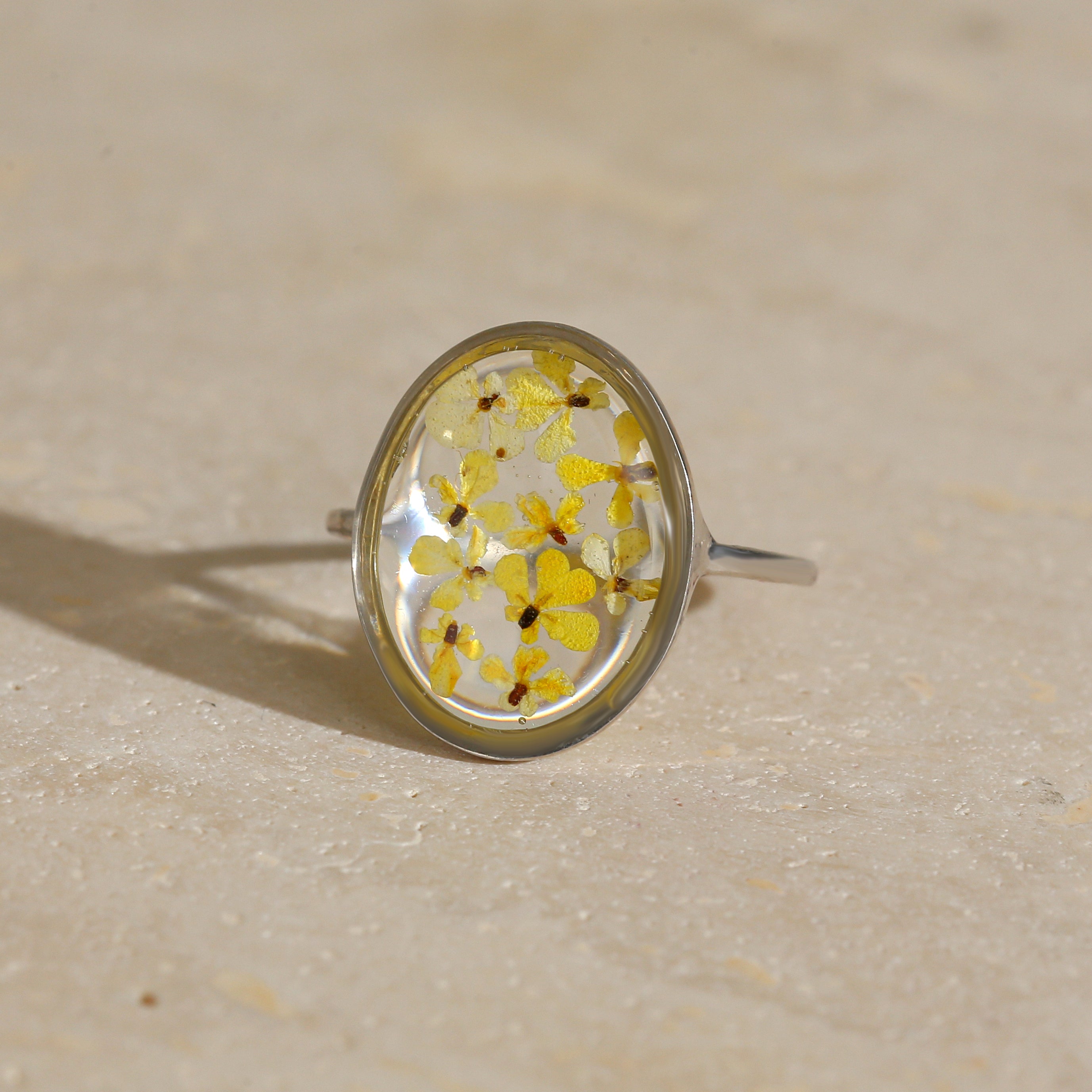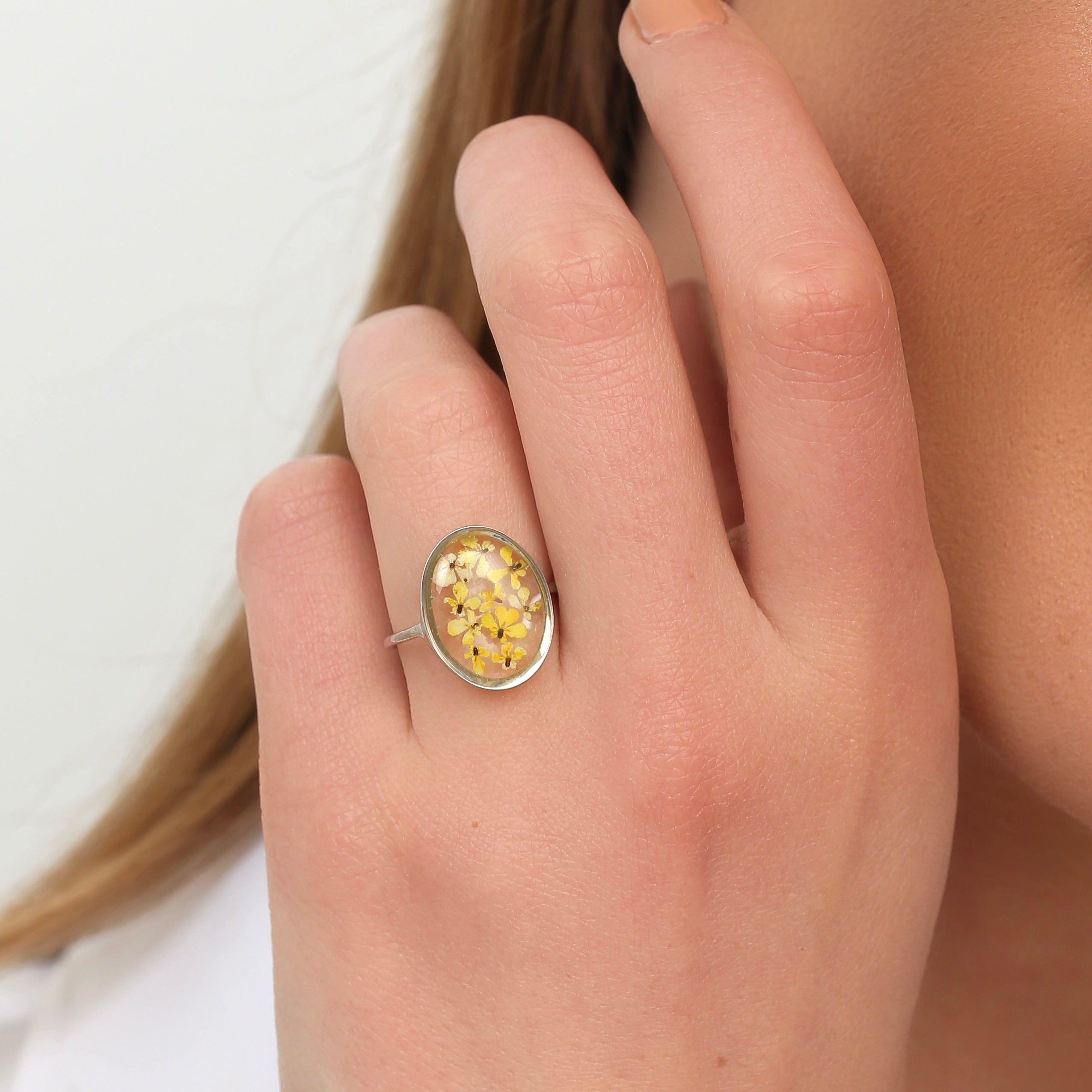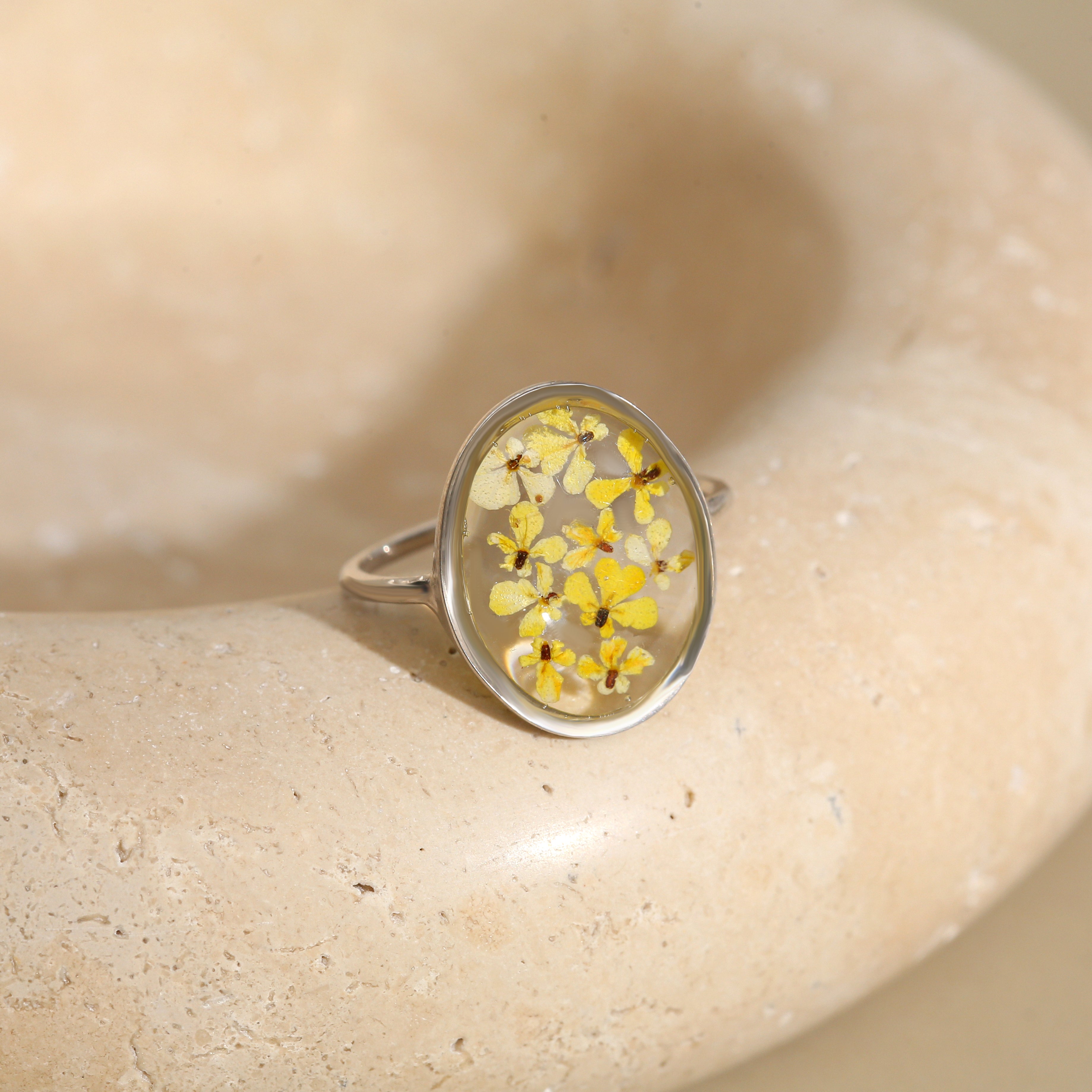 Çiçekler kuruma sürecini tamamladıktan sonra, her biri özenle minik parçalara ayrılır. Her bir çiçek parçası, reçine ile sabitlenerek koruma altına alınır. Bu sayede doğanın zarif dokusu uzun süre bozulmadan korunur ve takıların içinde ölümsüzleşir. Her detay, titizlikle işlenir ve takıya hayat verir.