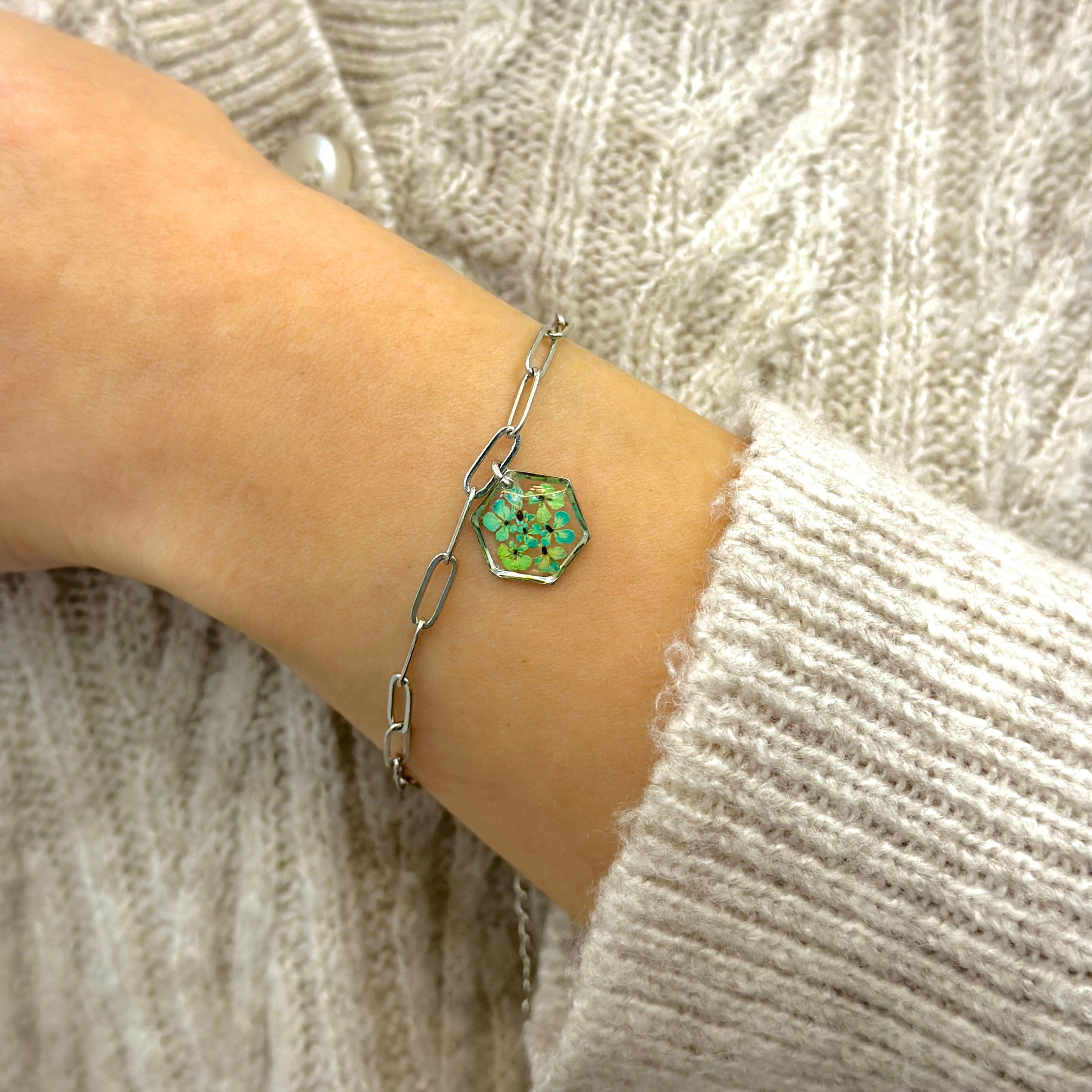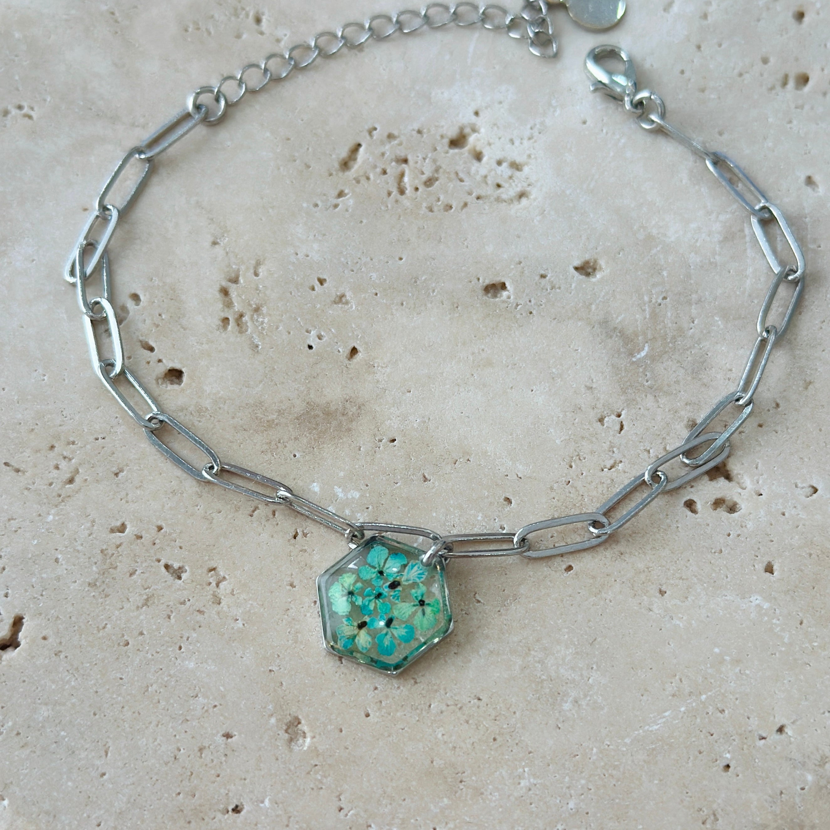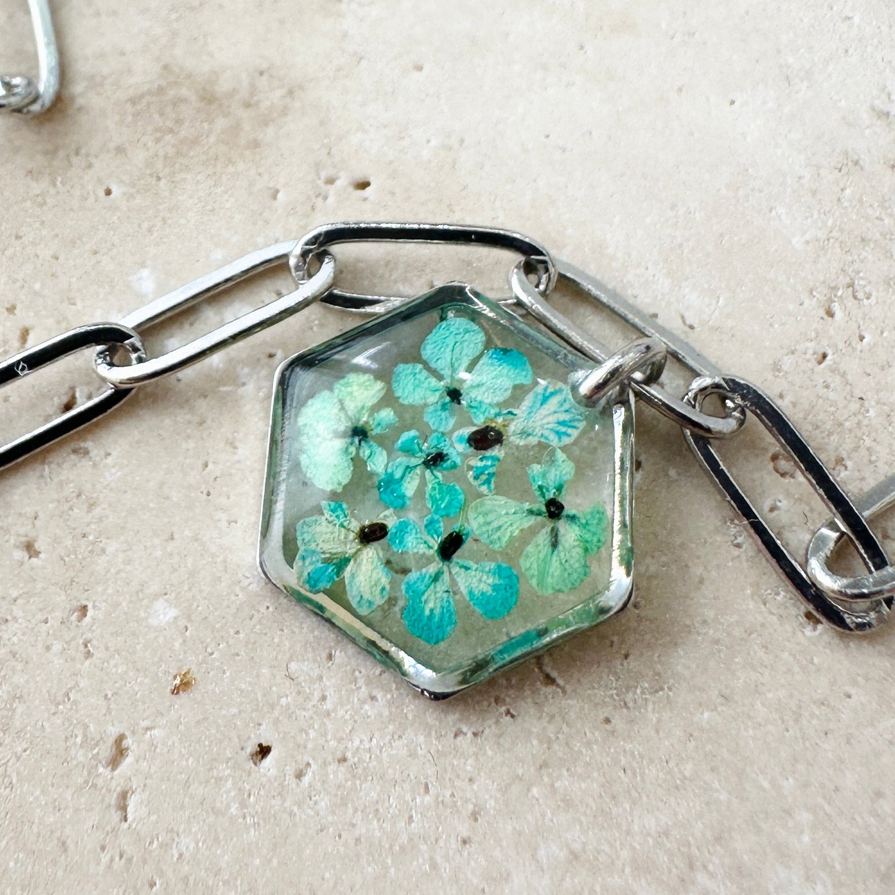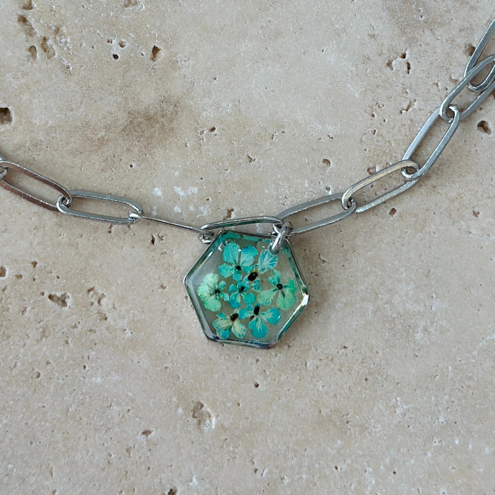 After the flowers have completed the drying process, each one is carefully cut into tiny pieces. Each flower piece is fixed with resin and protected. In this way, the elegant texture of nature is preserved for a long time and becomes immortal in the jewelry. Every detail is meticulously processed and gives life to the jewelry.