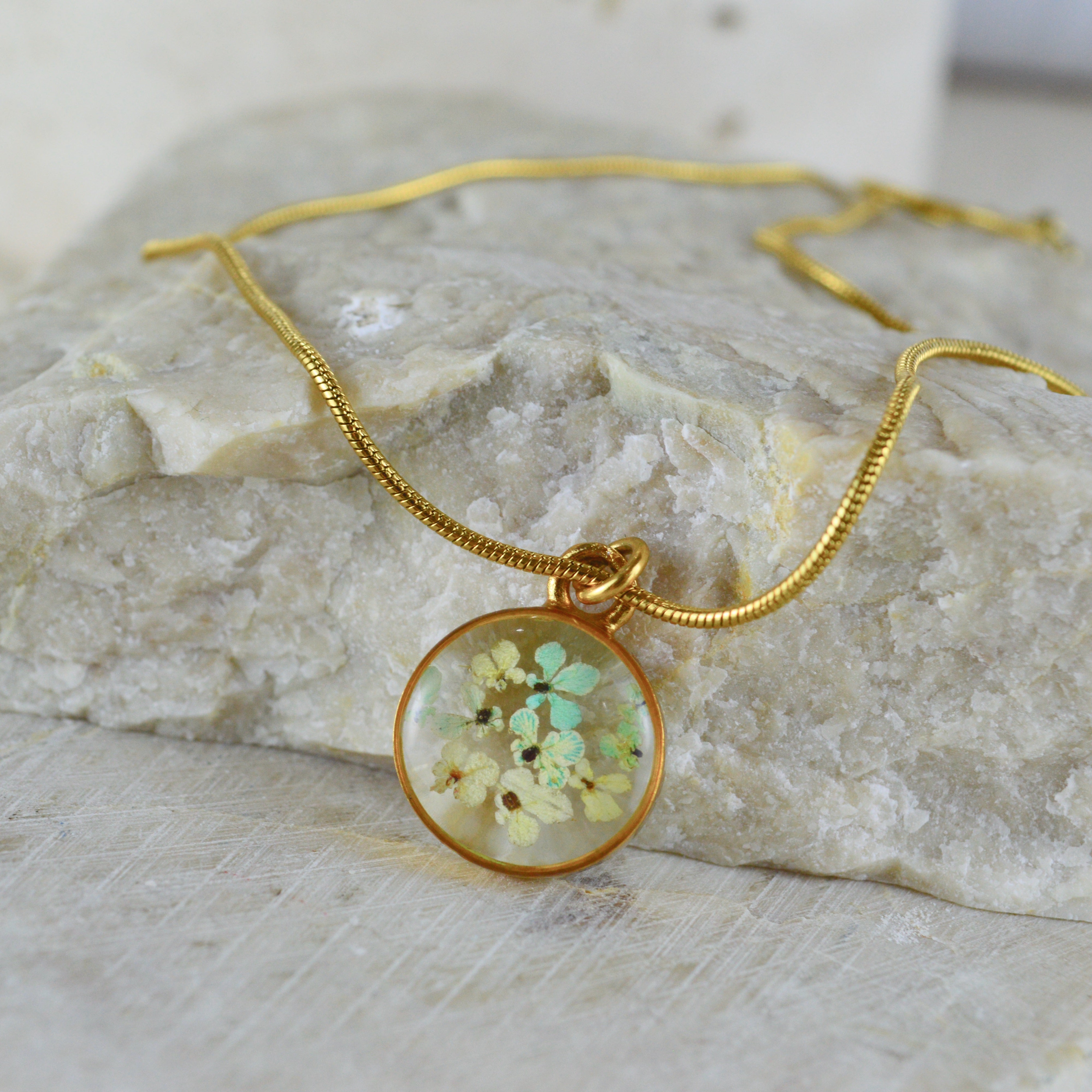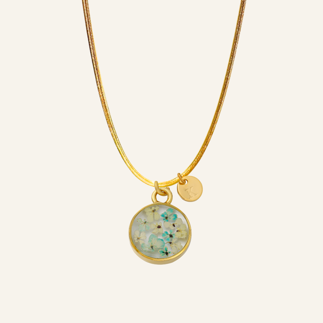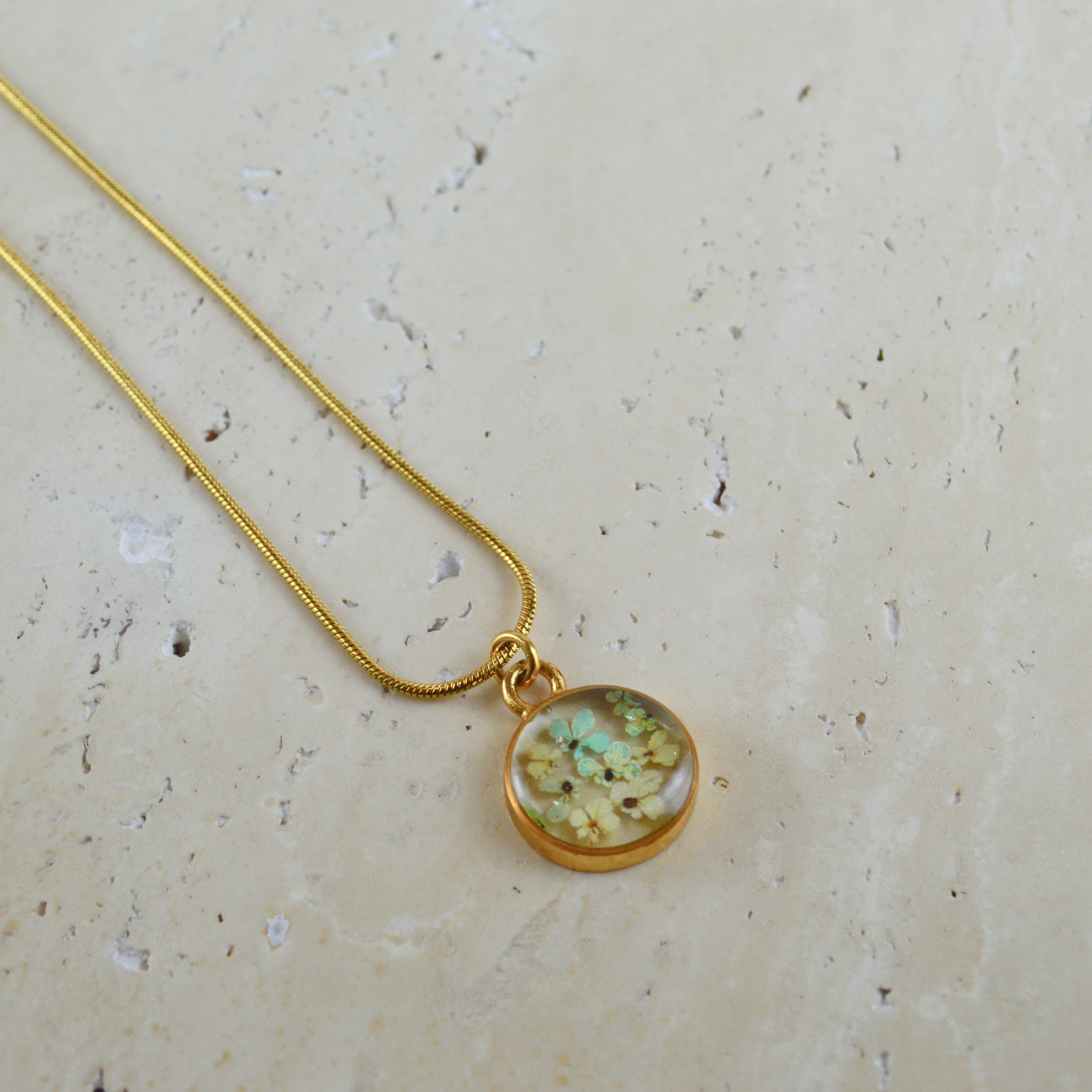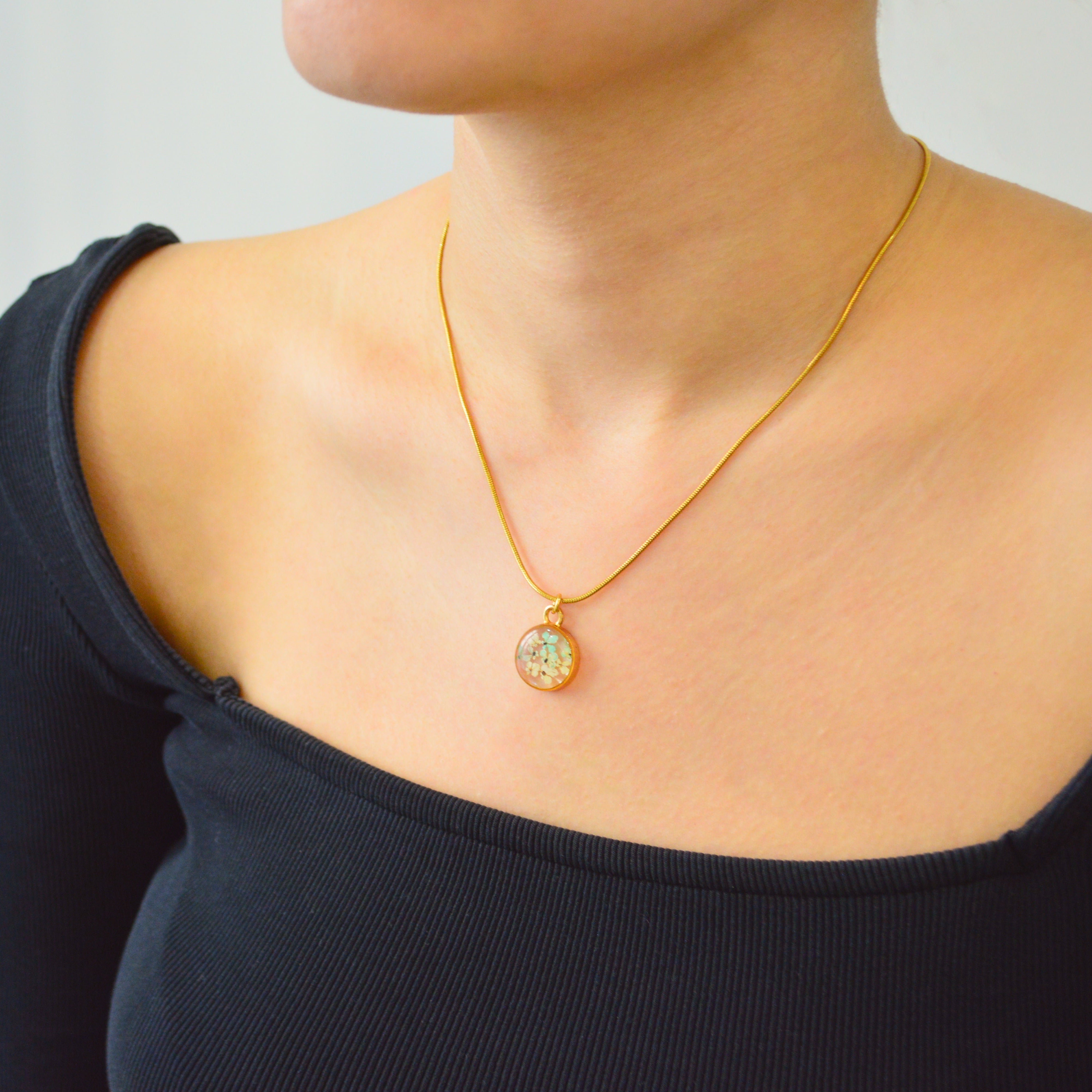 After the flowers have completed the drying process, each one is carefully cut into tiny pieces. Each flower piece is fixed with resin and protected. In this way, the elegant texture of nature is preserved for a long time and becomes immortal in the jewelry. Every detail is meticulously processed and gives life to the jewelry.