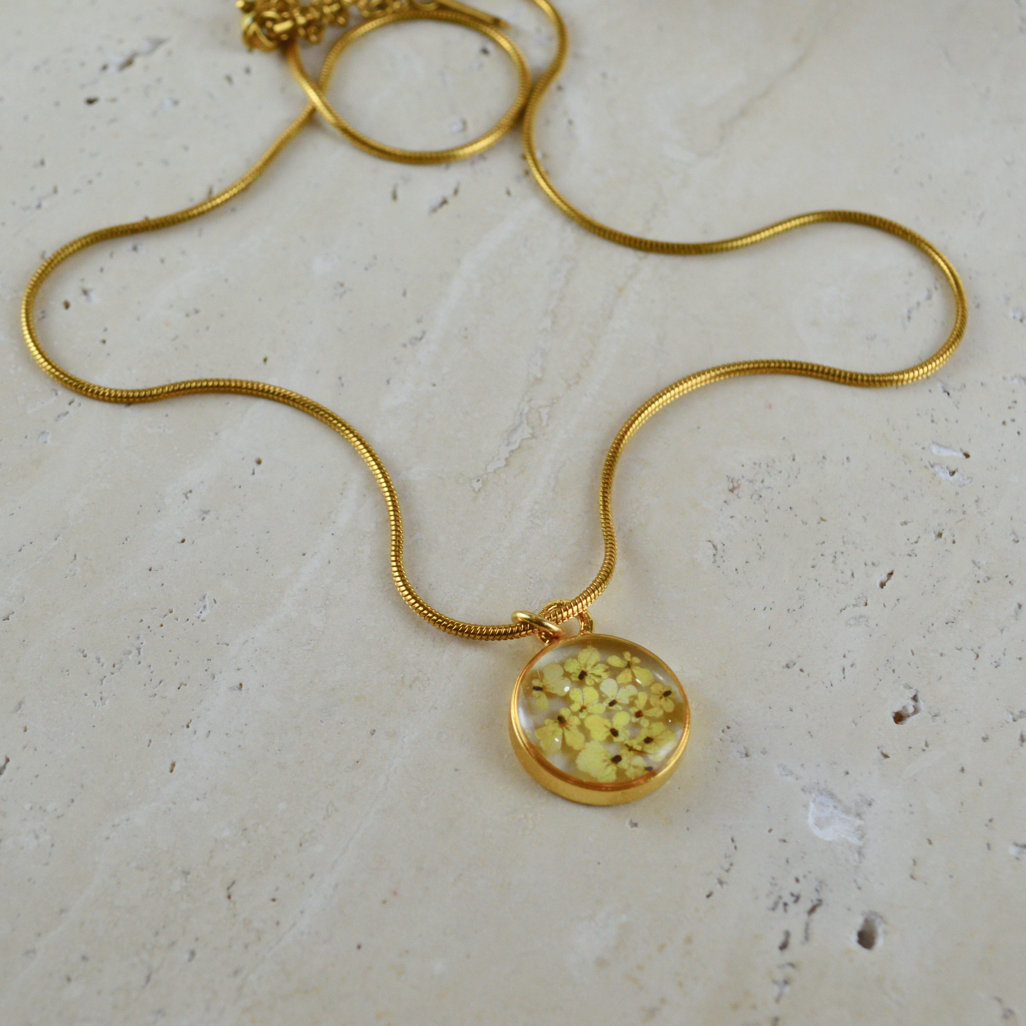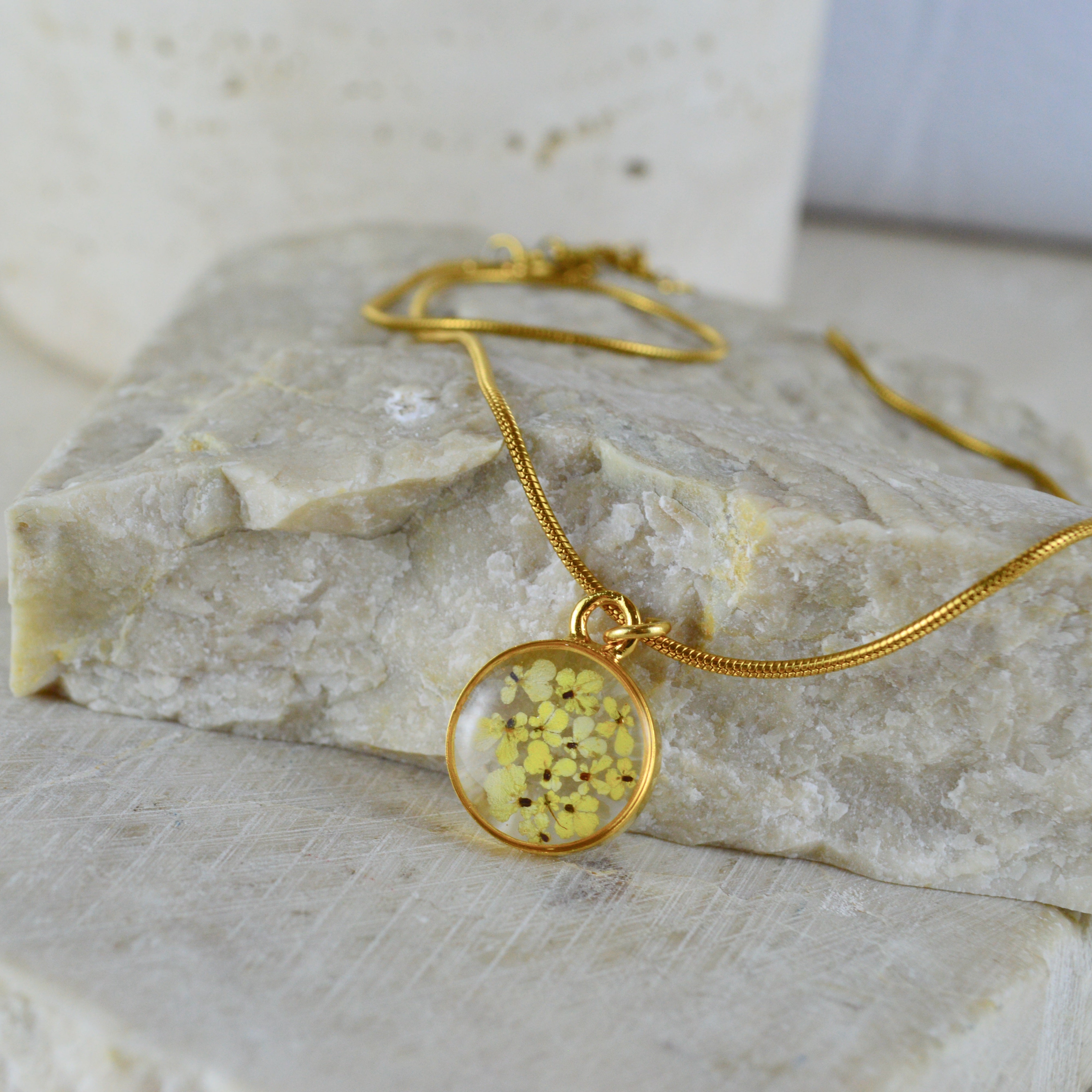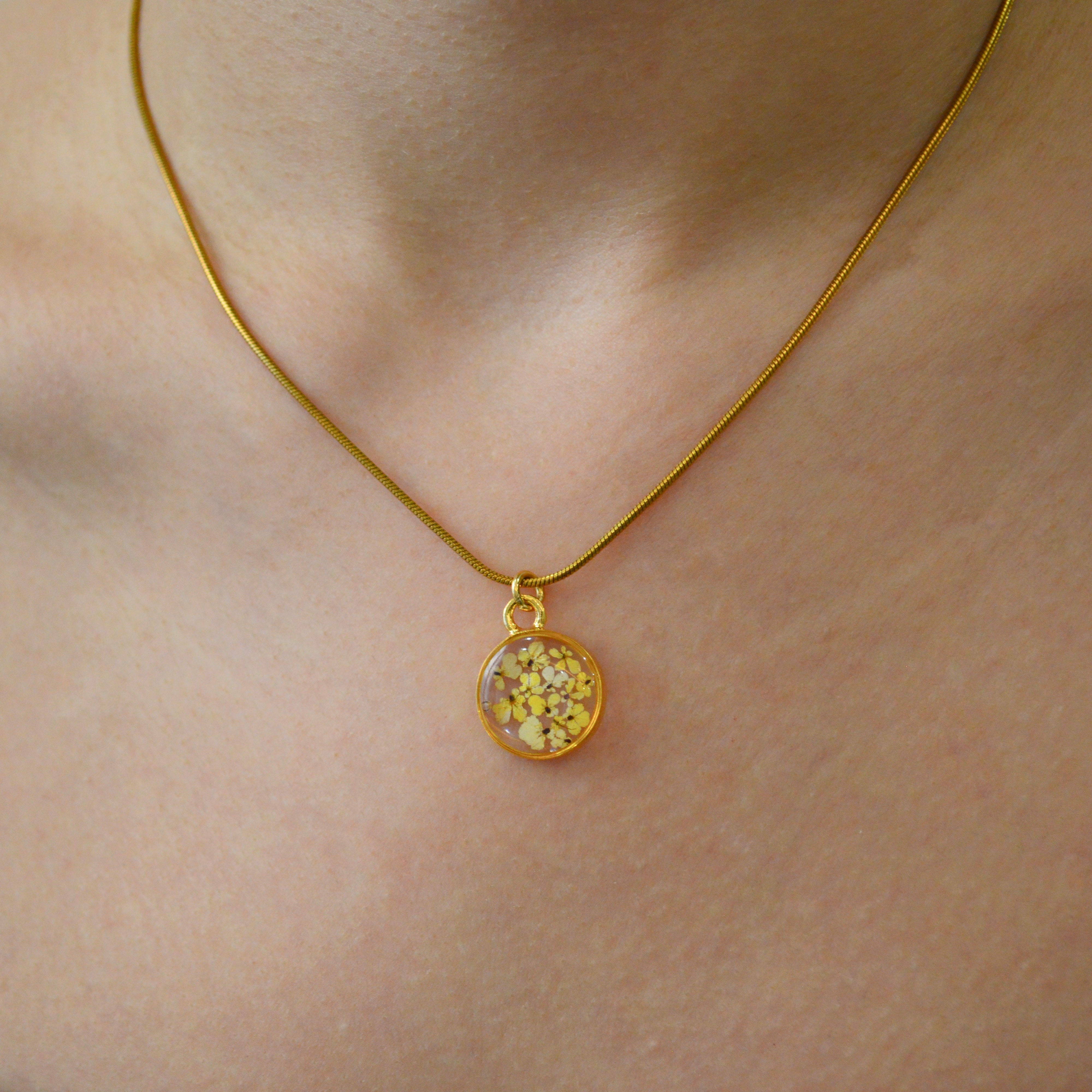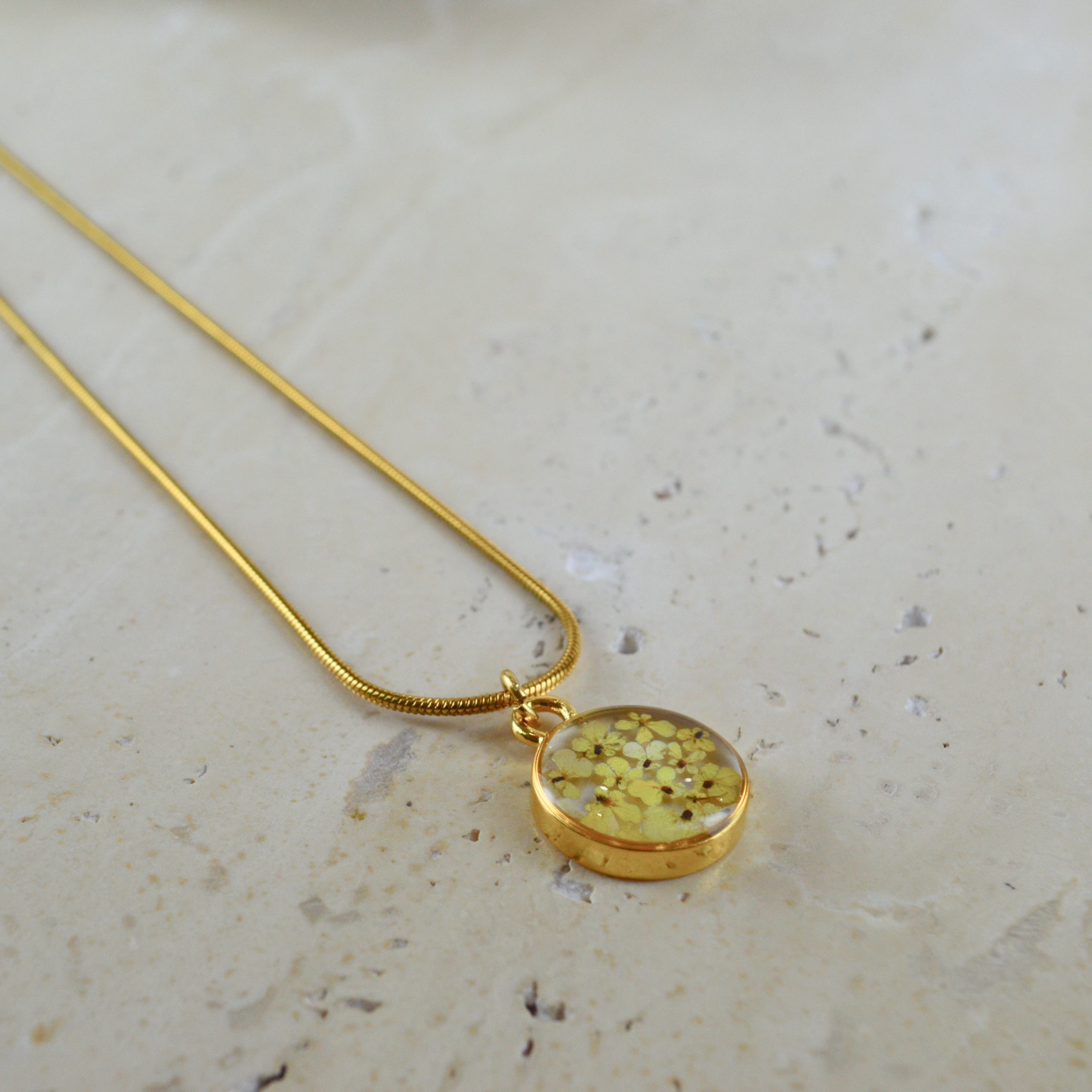After the flowers have completed the drying process, each one is carefully cut into tiny pieces. Each flower piece is fixed with resin and protected. In this way, the elegant texture of nature is preserved for a long time and becomes immortal in the jewelry. Every detail is meticulously processed and gives life to the jewelry.