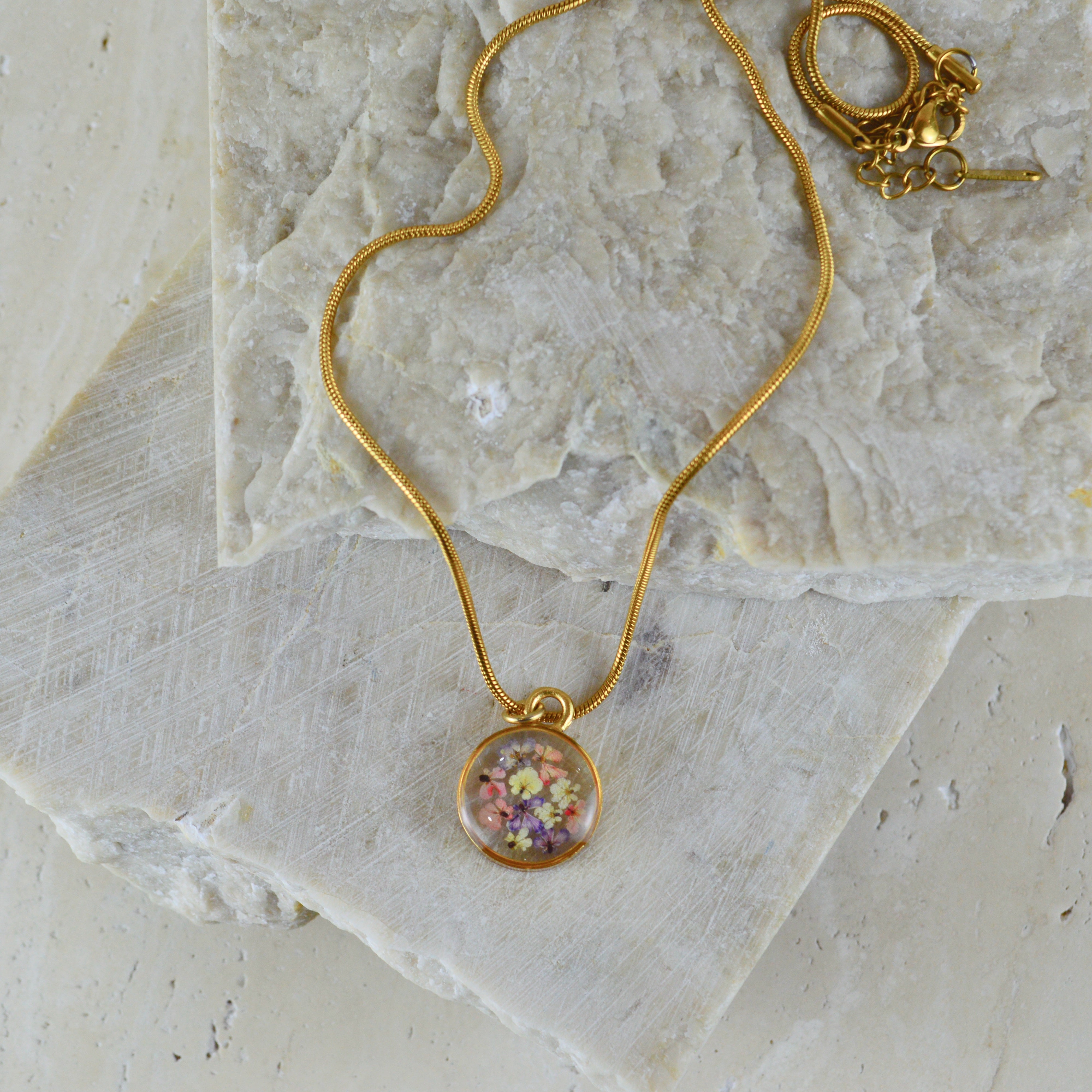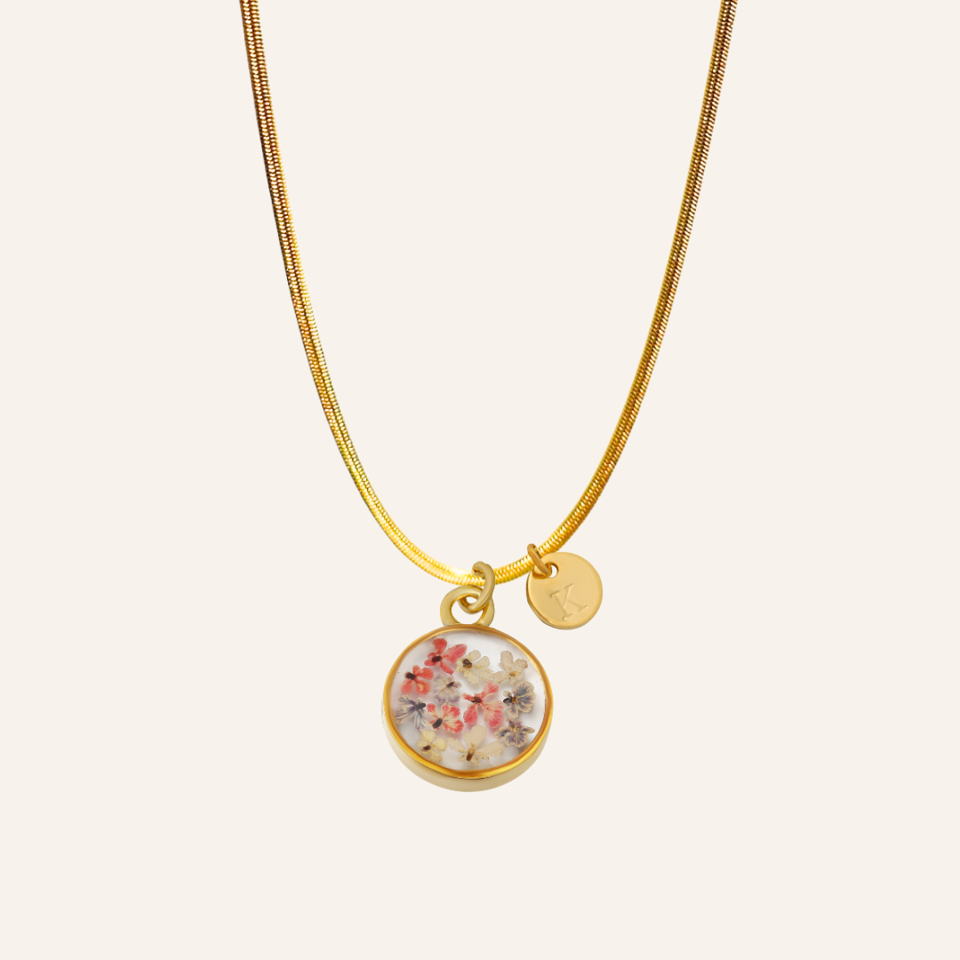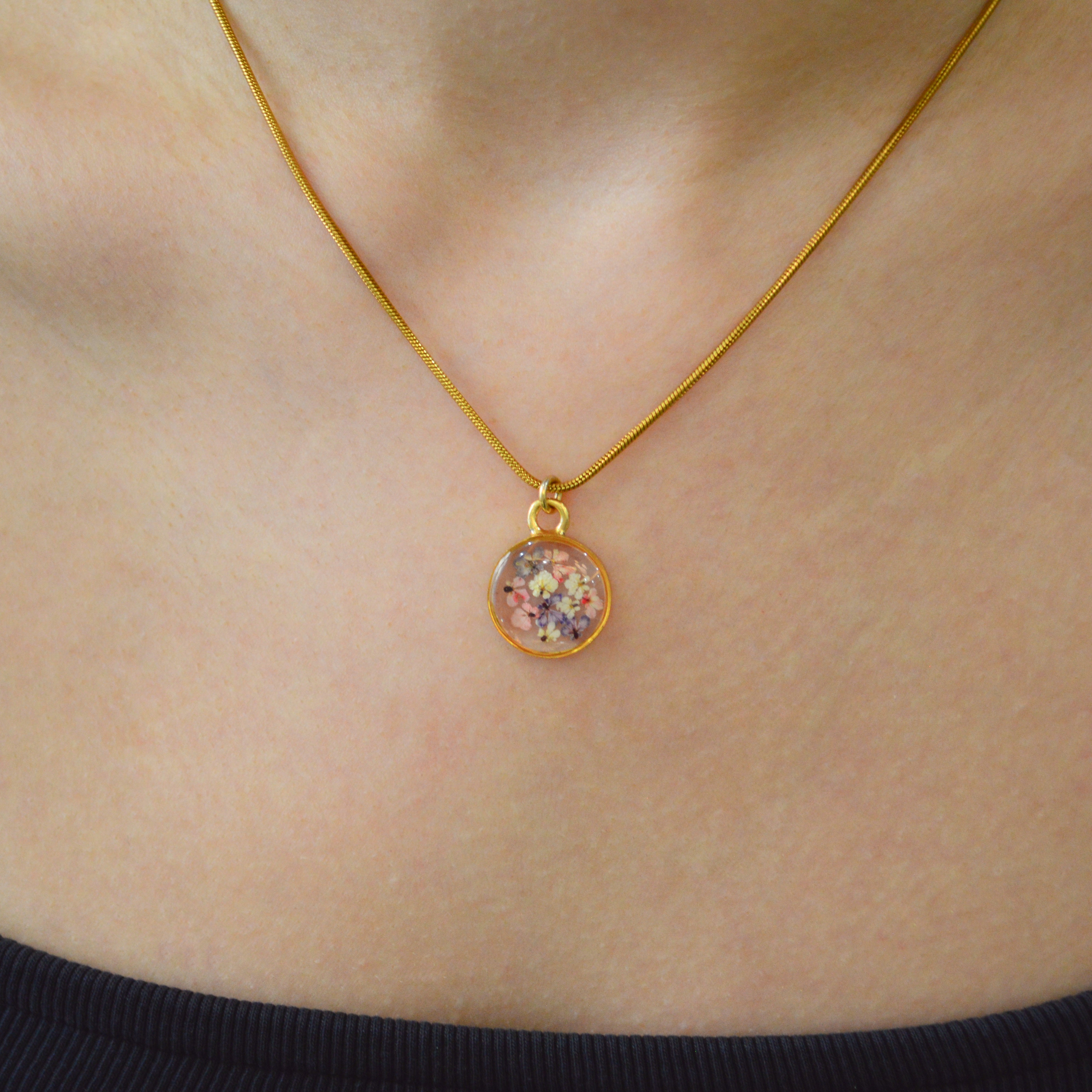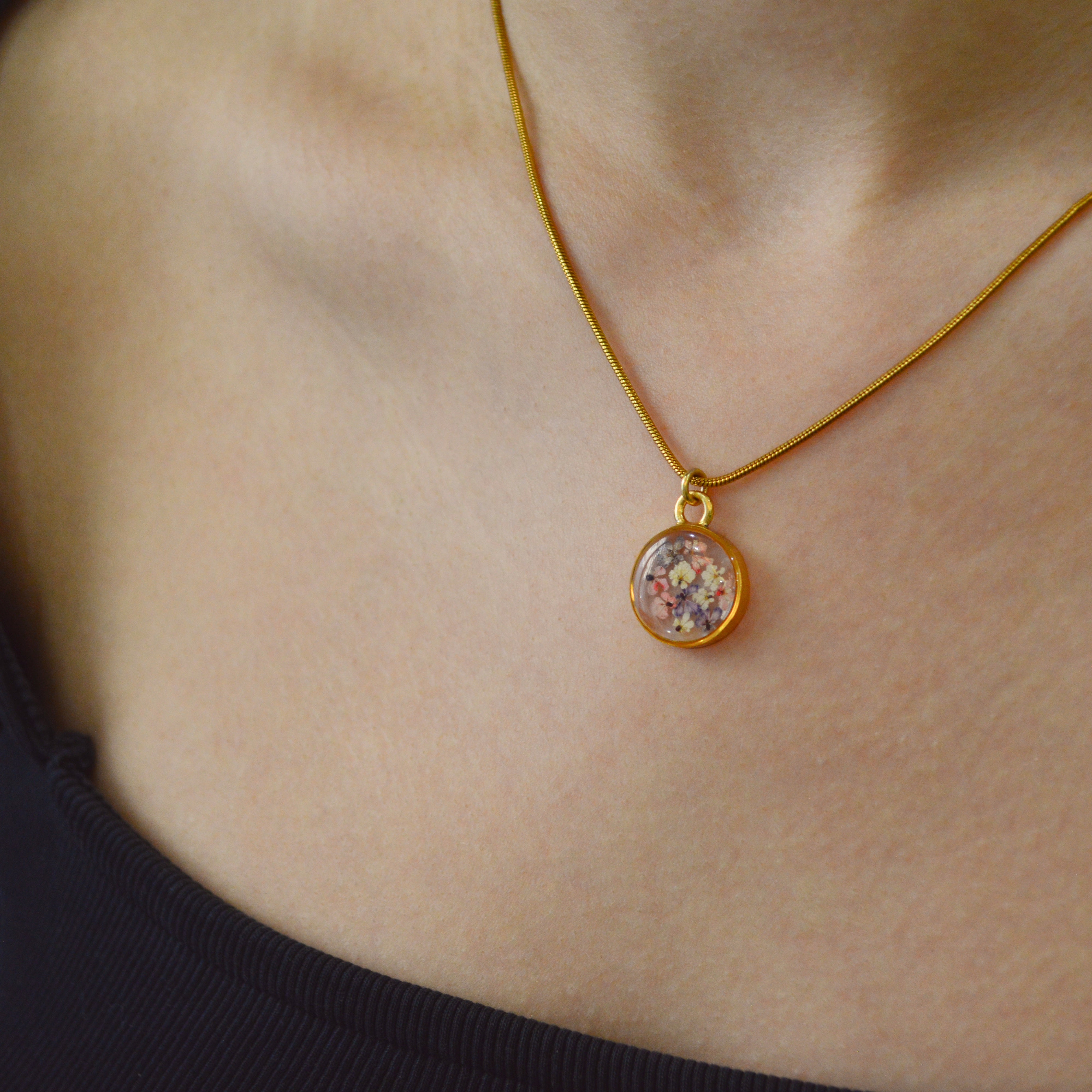 After the flowers have completed the drying process, each one is carefully cut into tiny pieces. Each flower piece is fixed with resin and protected. In this way, the elegant texture of nature is preserved for a long time and becomes immortal in the jewelry. Every detail is meticulously processed and gives life to the jewelry.