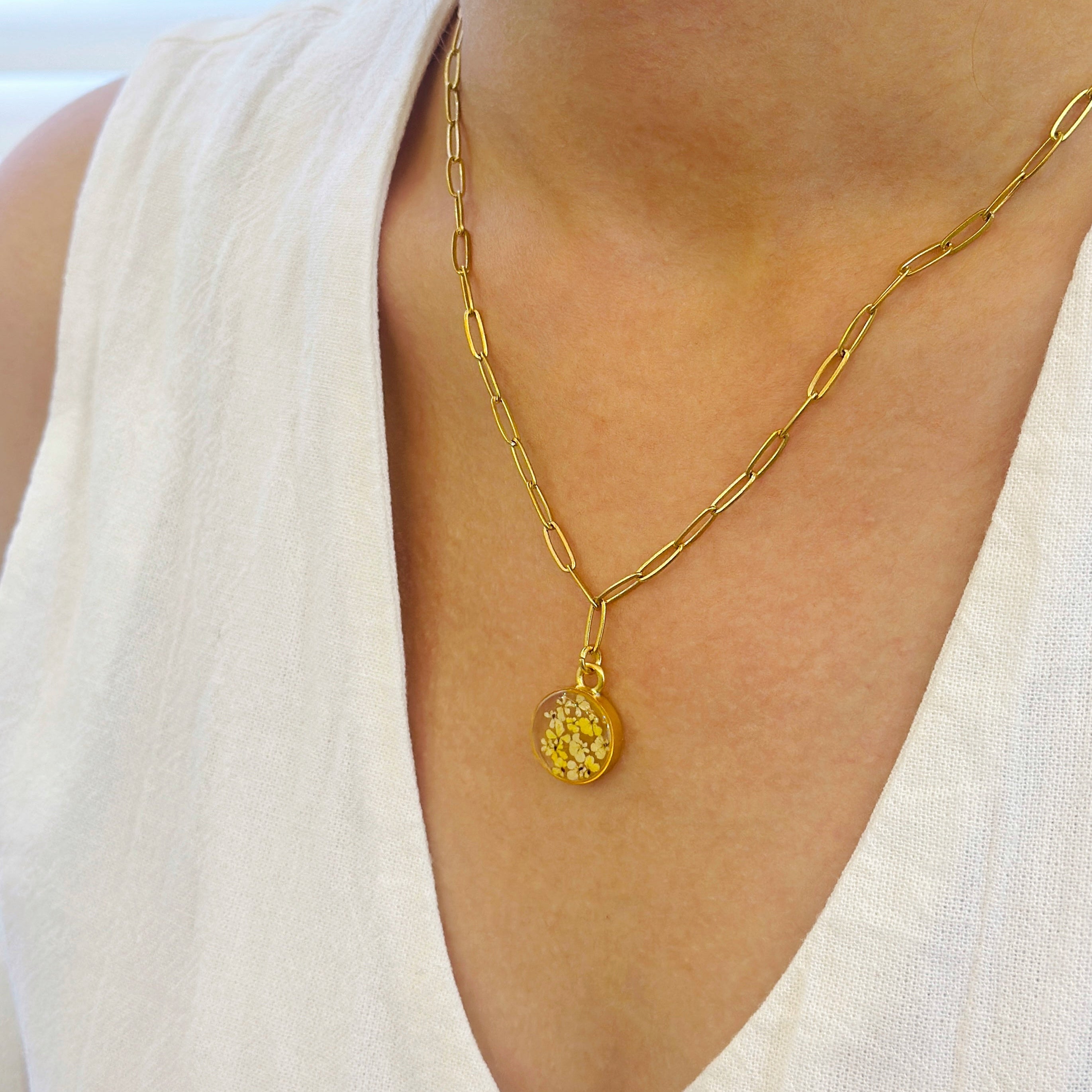 After the flowers have completed the drying process, each one is carefully cut into tiny pieces. Each flower piece is fixed with resin and protected. In this way, the elegant texture of nature is preserved for a long time and becomes immortal in the jewelry. Every detail is meticulously processed and gives life to the jewelry.
