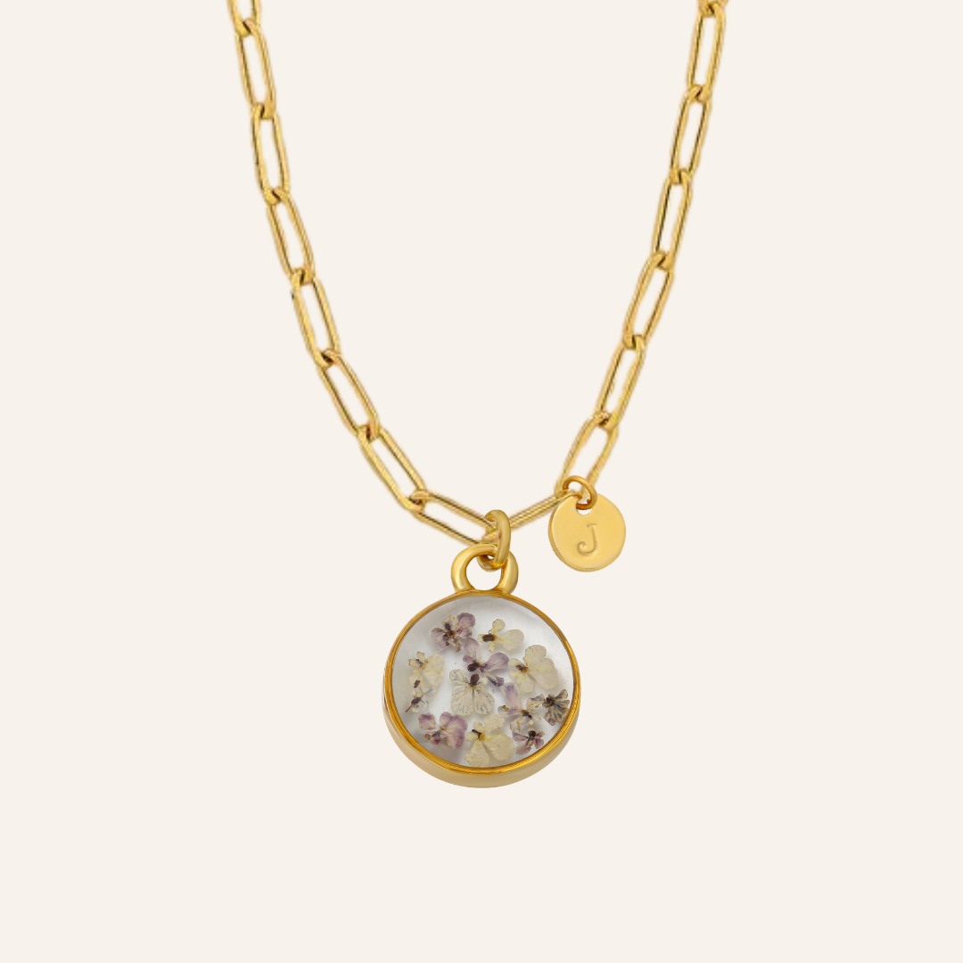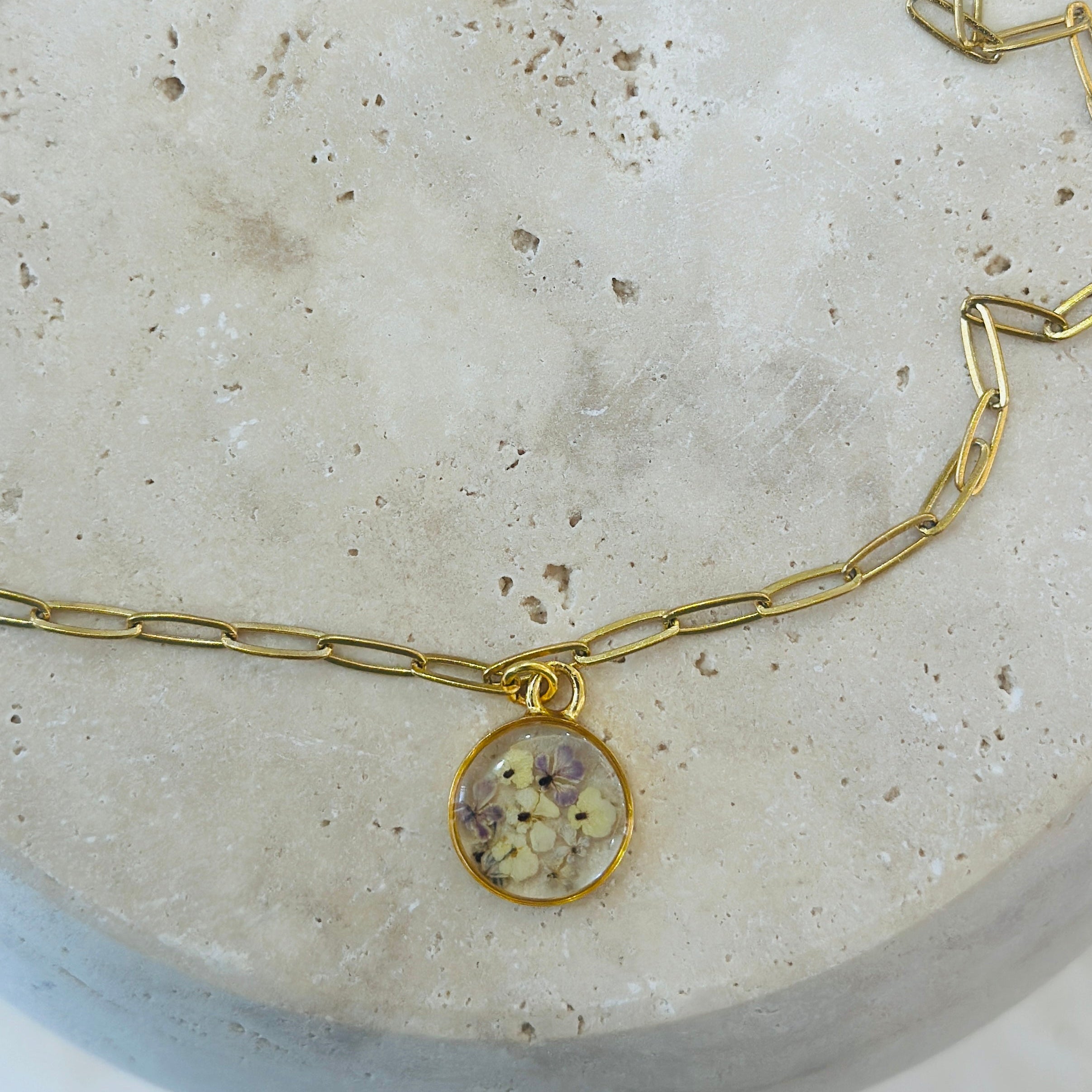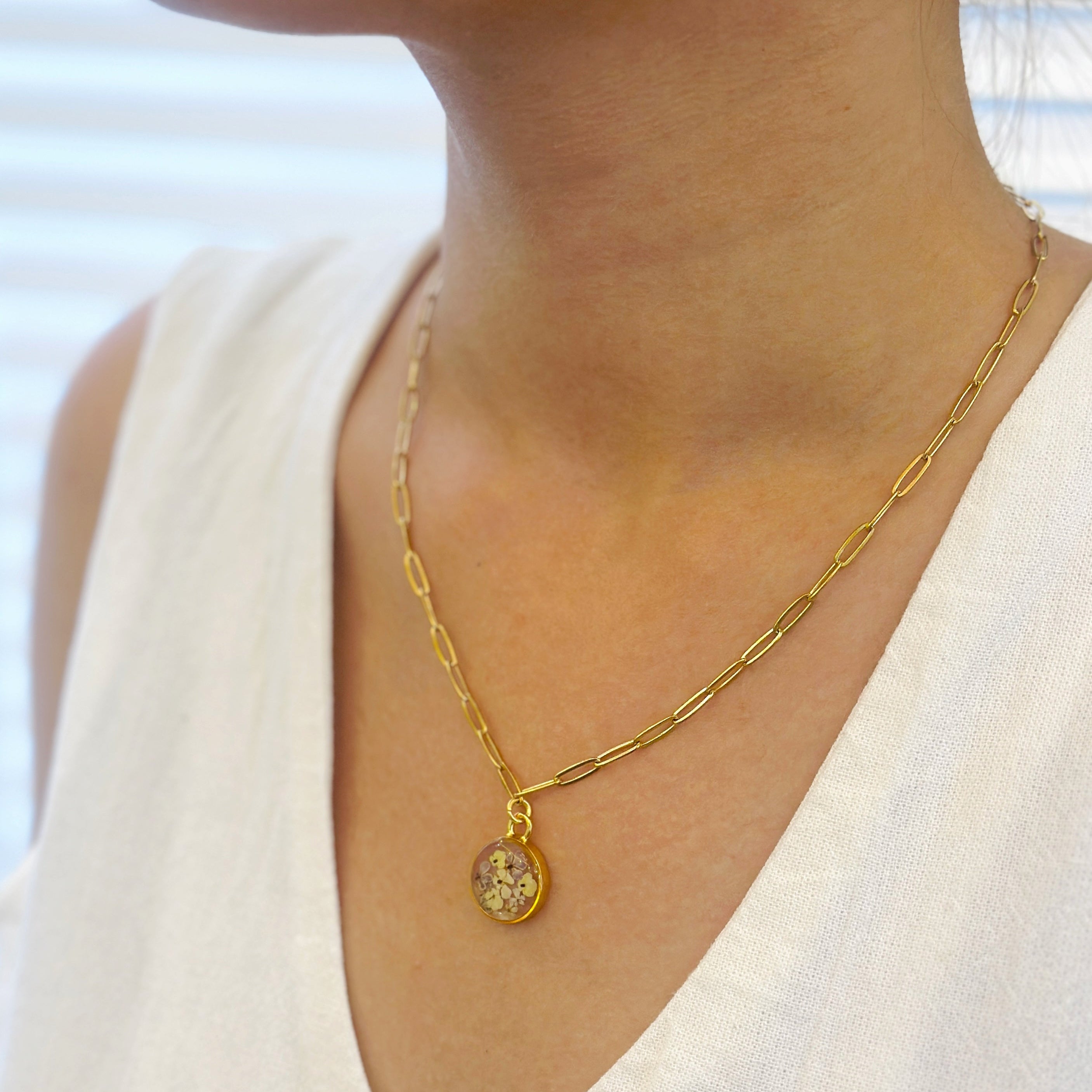 After the flowers have completed the drying process, each one is carefully cut into tiny pieces. Each flower piece is fixed with resin and protected. In this way, the elegant texture of nature is preserved for a long time and becomes immortal in the jewelry. Every detail is meticulously processed and gives life to the jewelry.