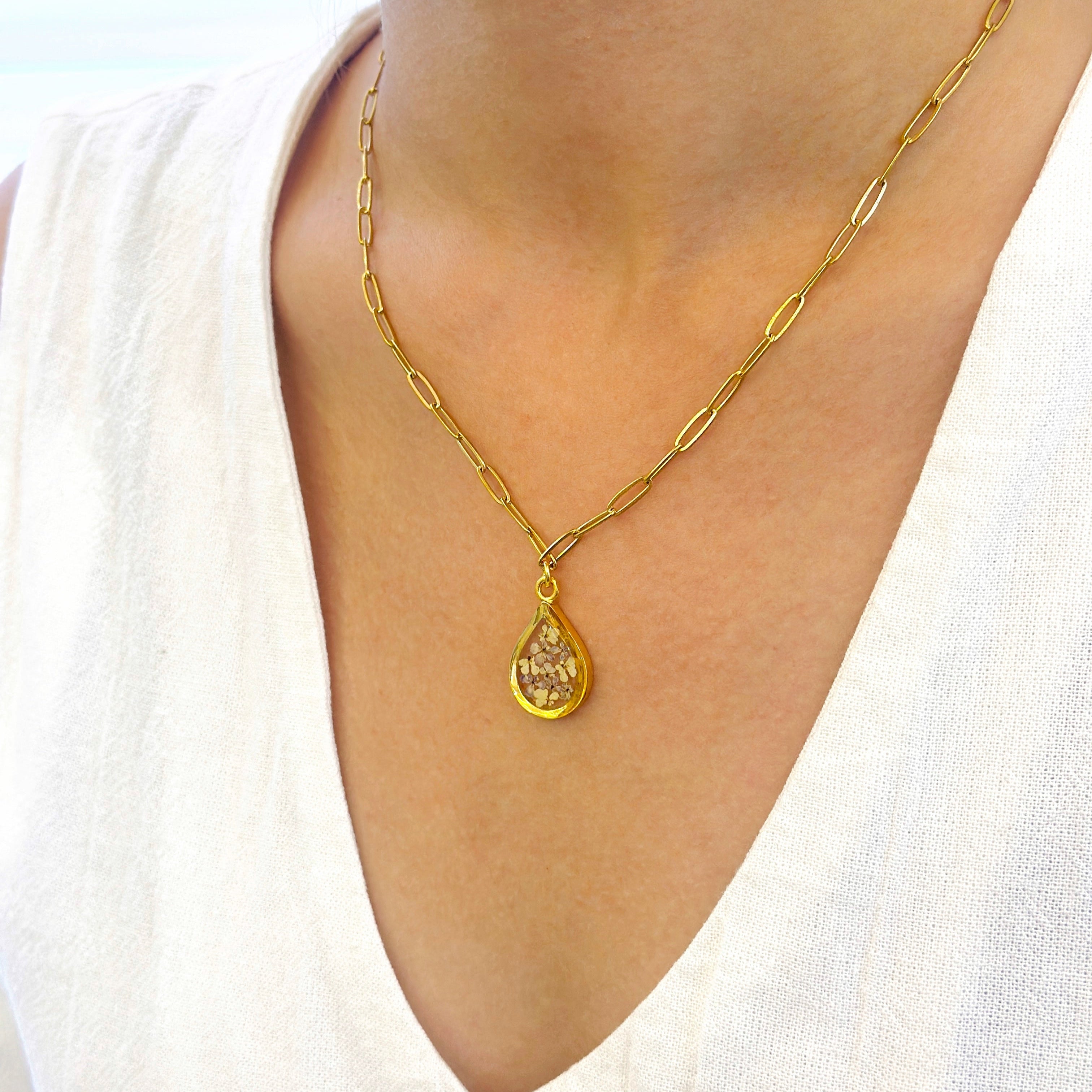 After the flowers have completed the drying process, each one is carefully cut into tiny pieces. Each flower piece is fixed with resin and protected. In this way, the elegant texture of nature is preserved for a long time and becomes immortal in the jewelry. Every detail is meticulously processed and gives life to the jewelry.