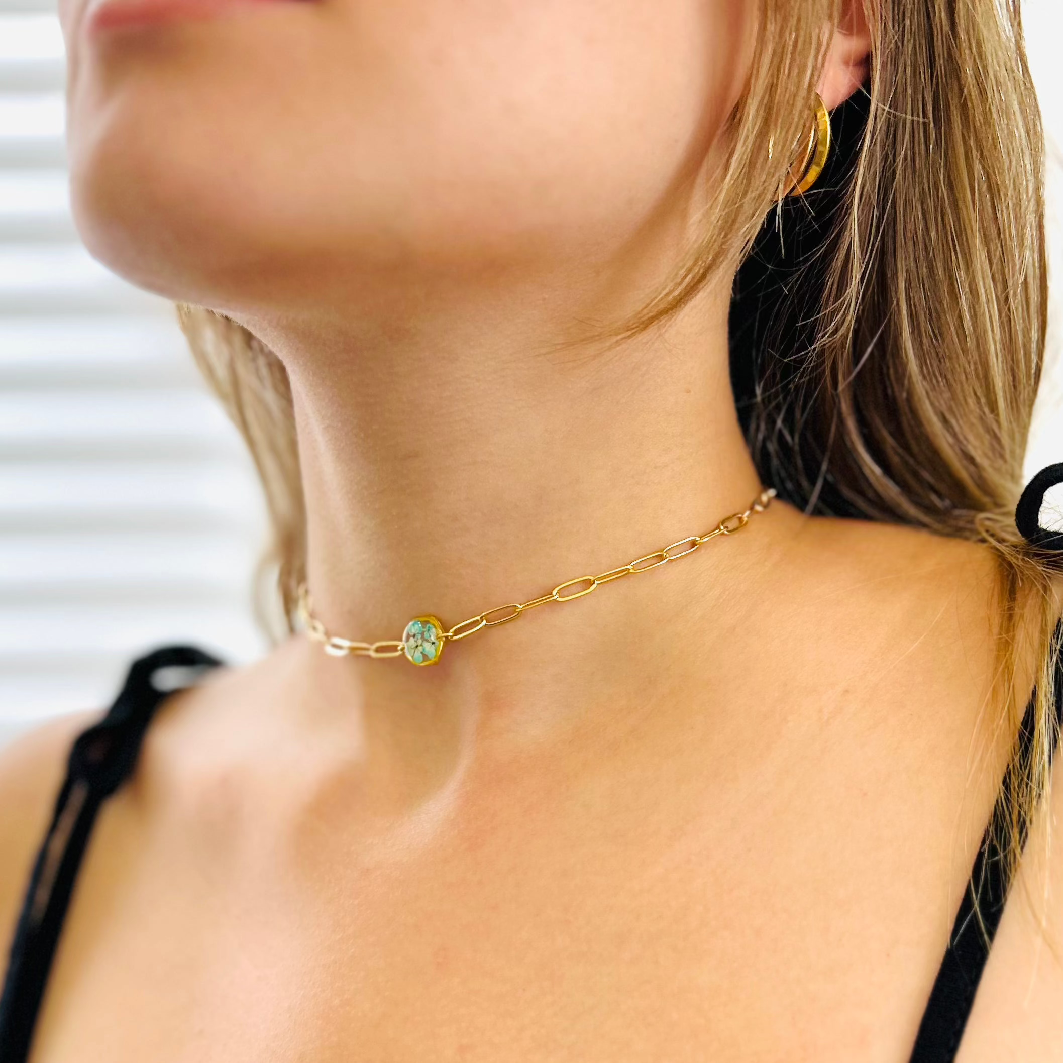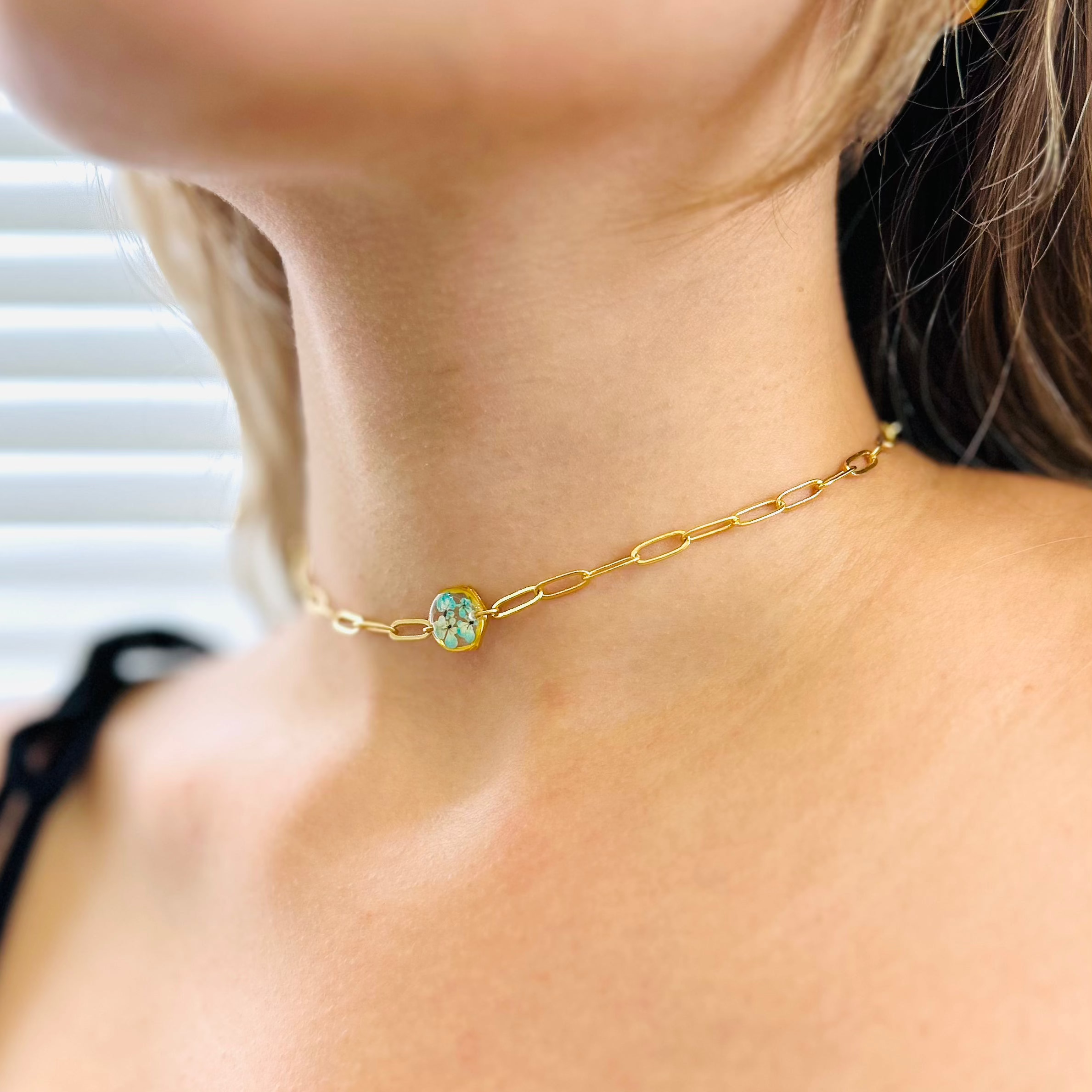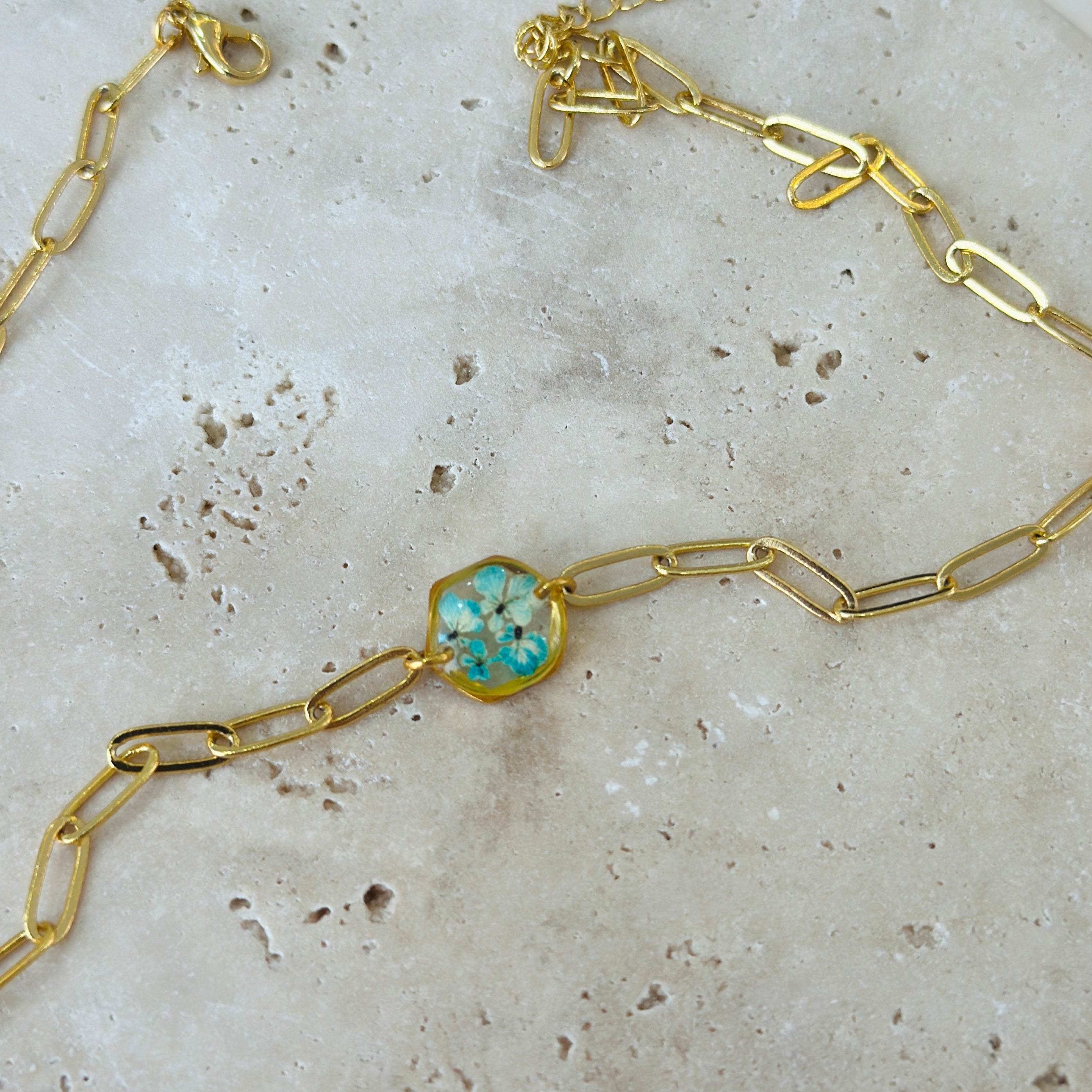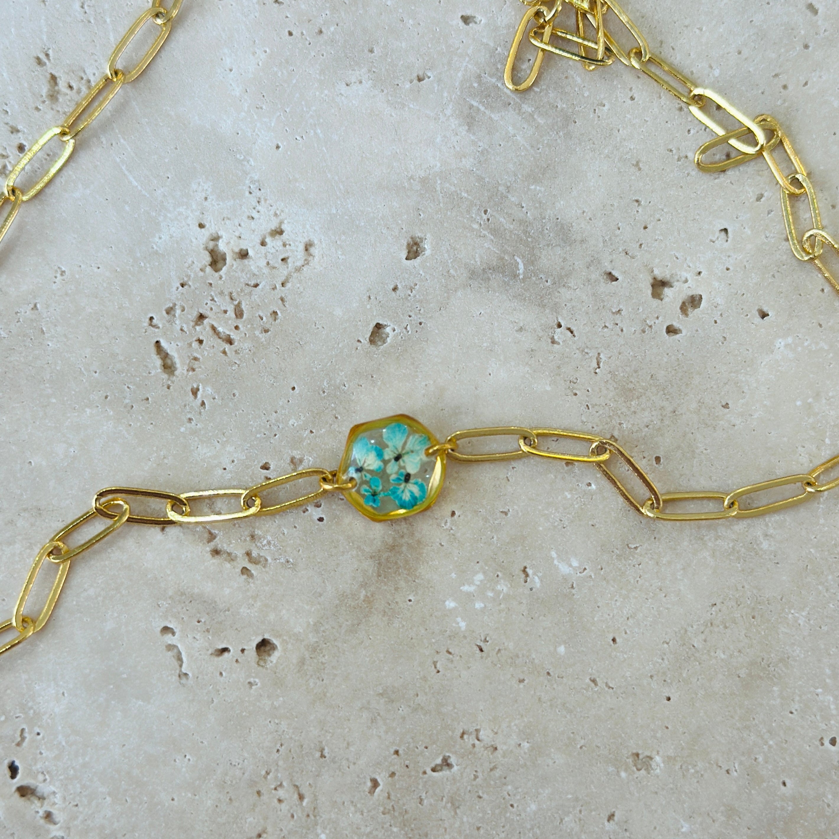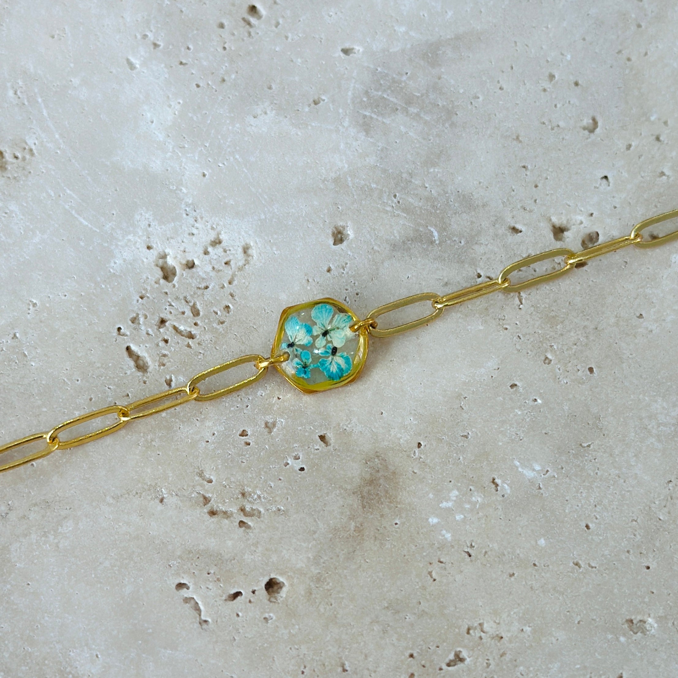 After the flowers have completed the drying process, each one is carefully cut into tiny pieces. Each flower piece is fixed with resin and protected. In this way, the elegant texture of nature is preserved for a long time and becomes immortal in the jewelry. Every detail is meticulously processed and gives life to the jewelry.