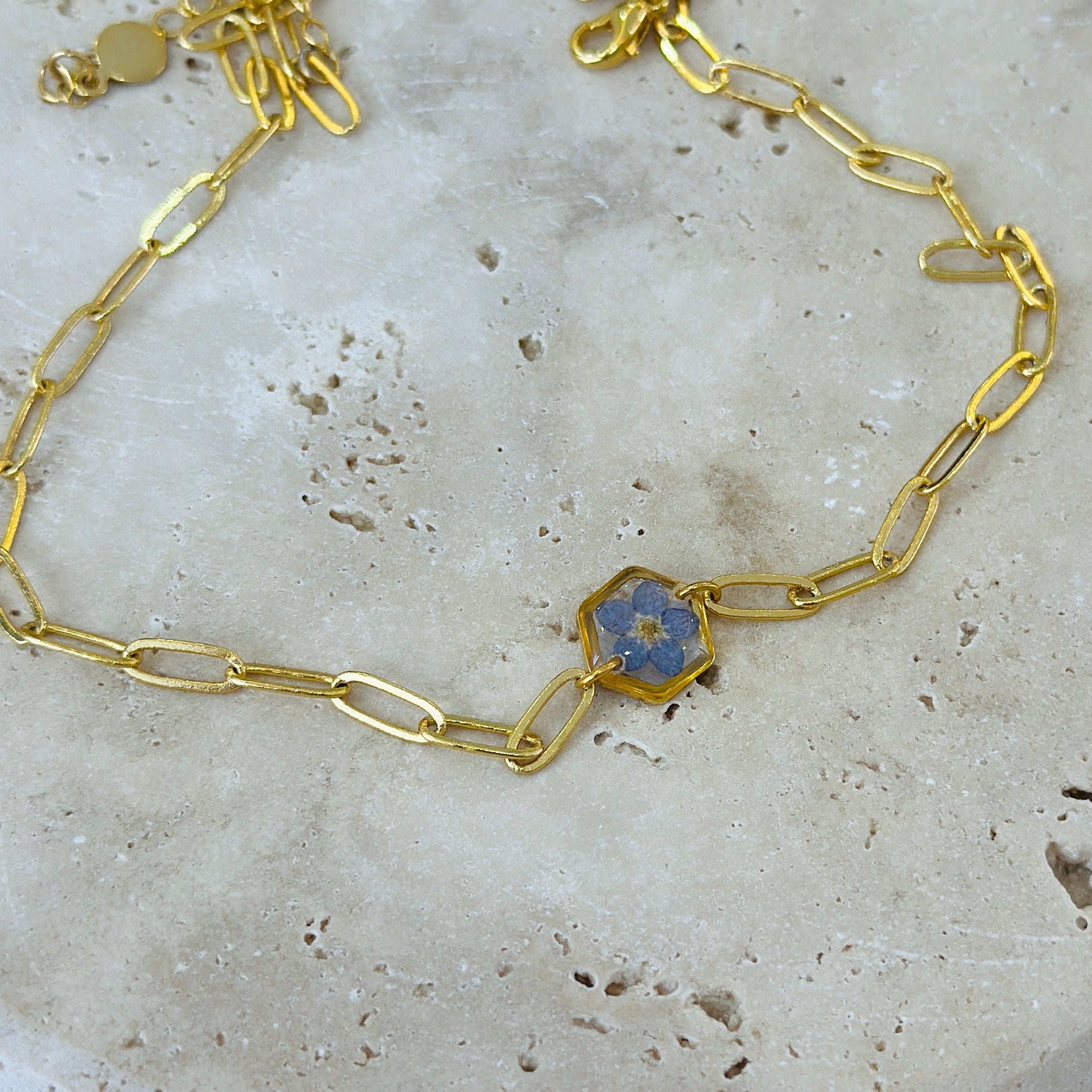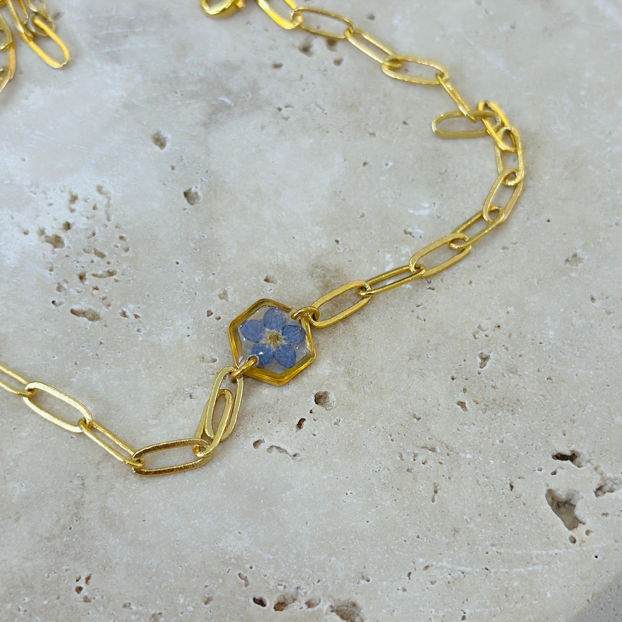 Forget-me-not flowers are individually hand-picked, then carefully plucked from the stem, pressed and dried.