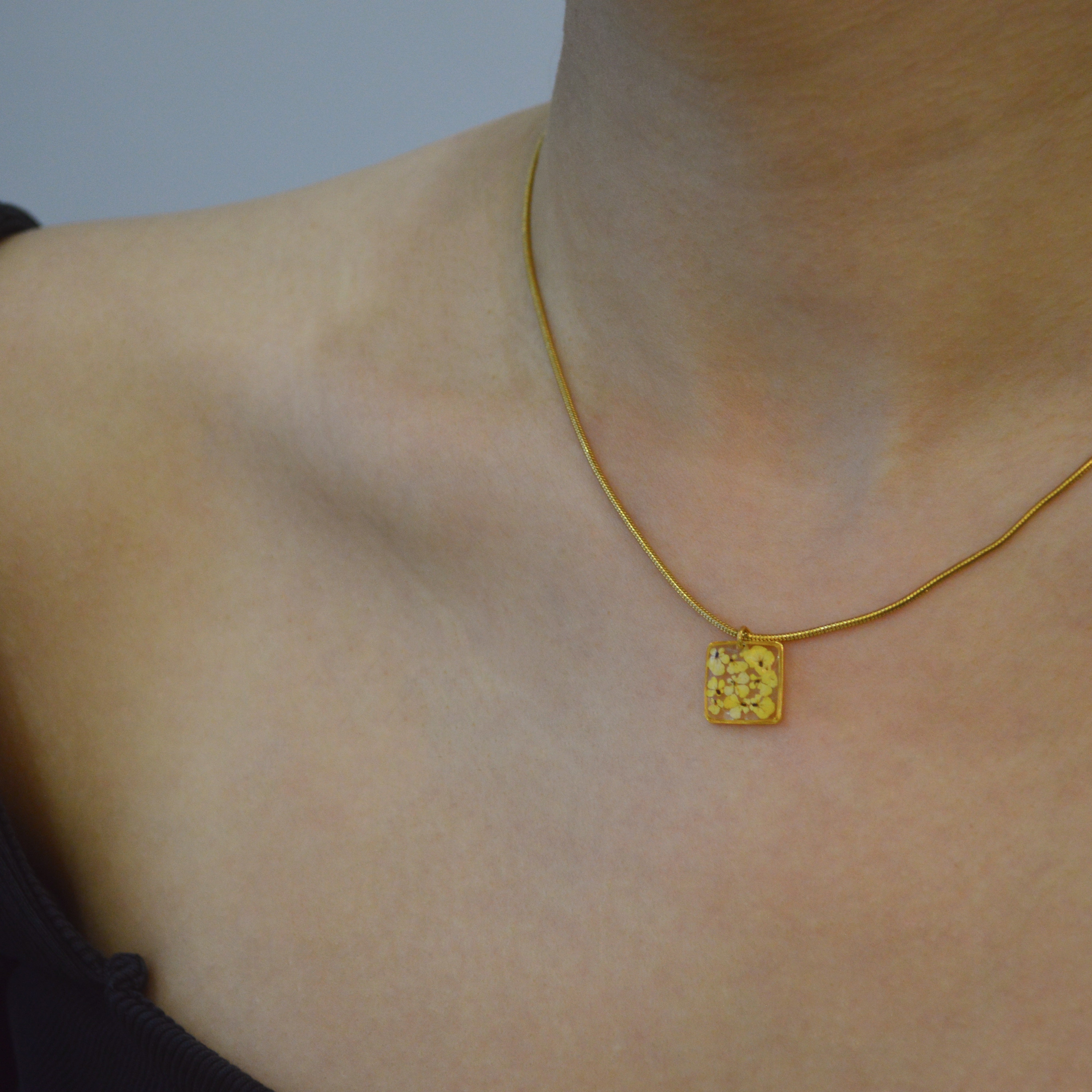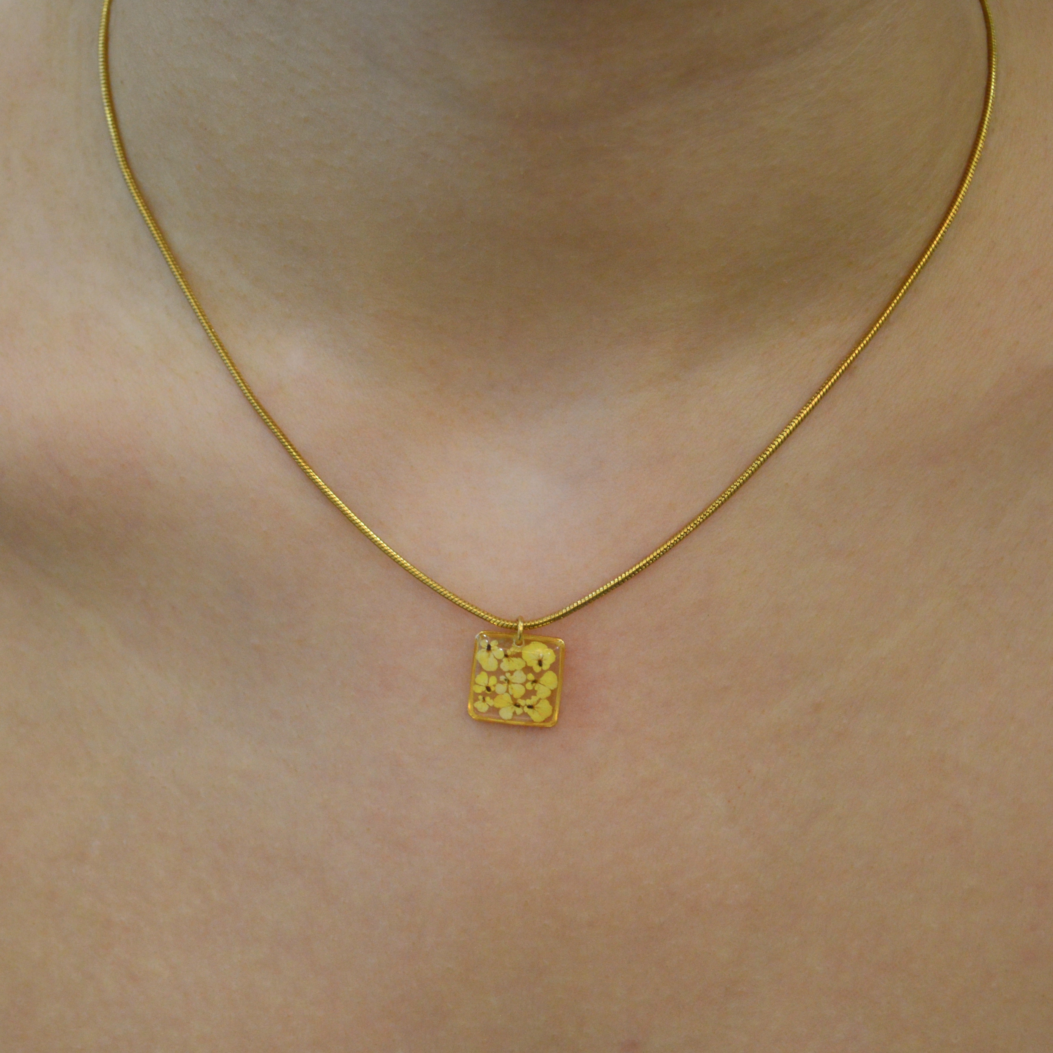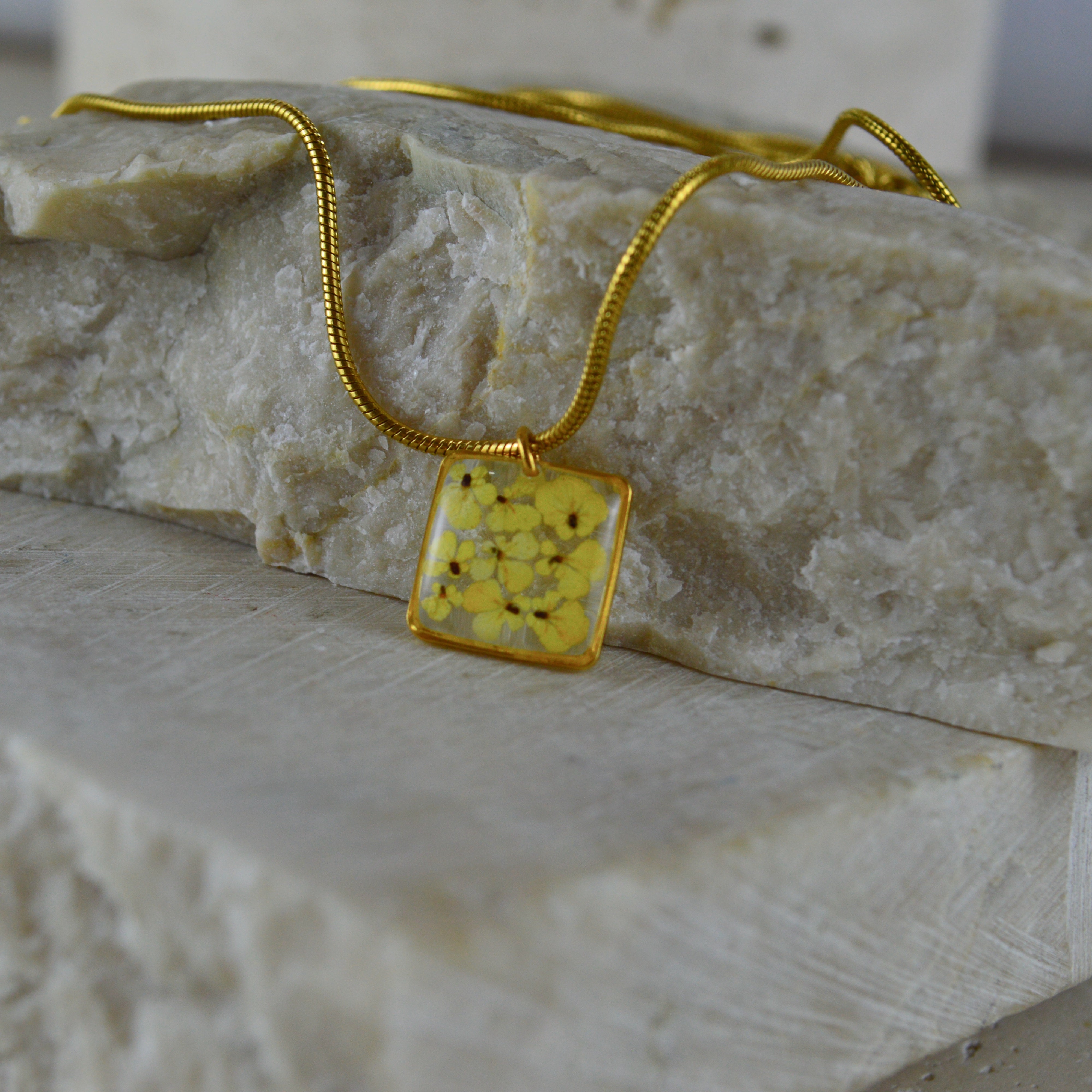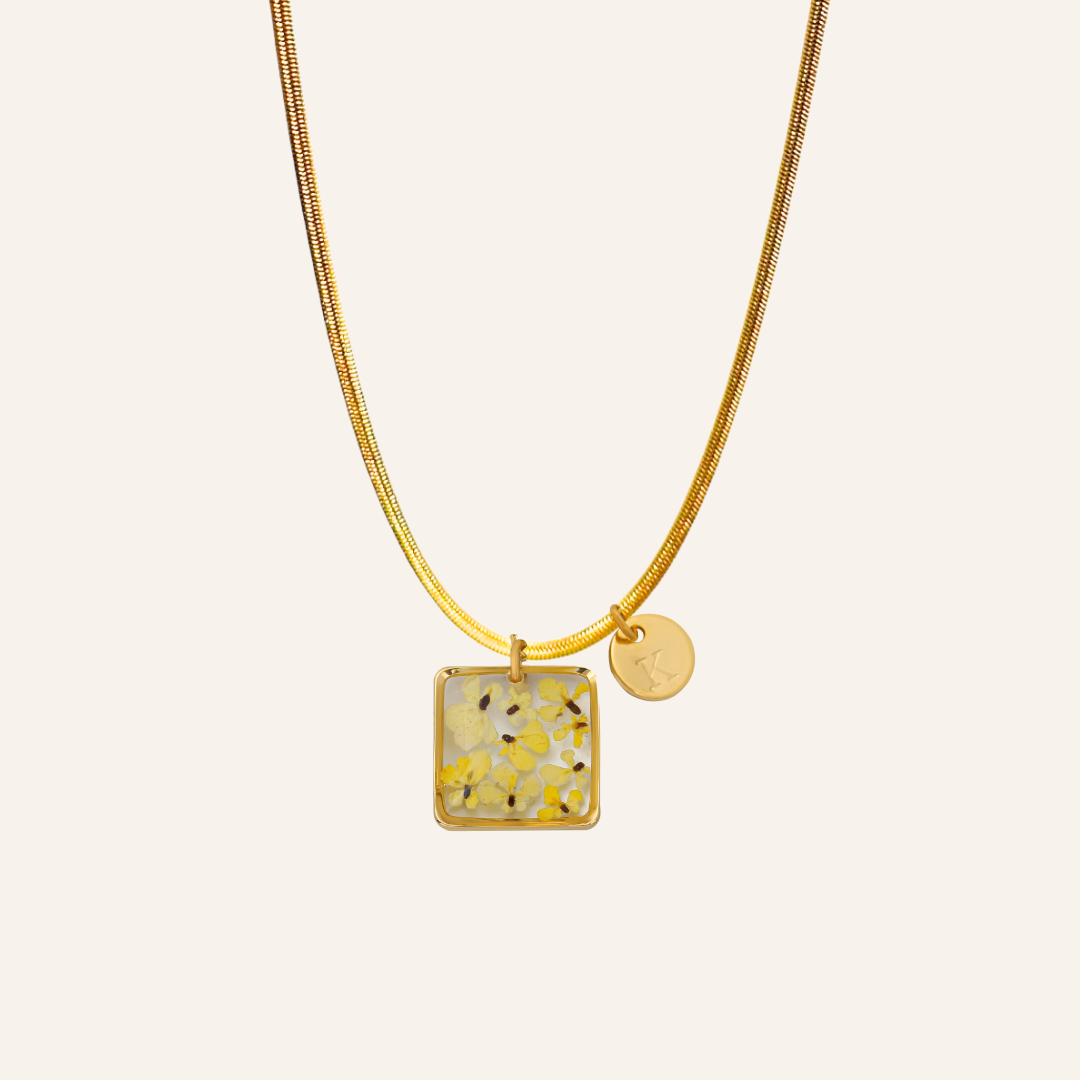 After the flowers have completed the drying process, each one is carefully cut into tiny pieces. Each flower piece is fixed with resin and protected. In this way, the elegant texture of nature is preserved for a long time and becomes immortal in the jewelry. Every detail is meticulously processed and gives life to the jewelry.