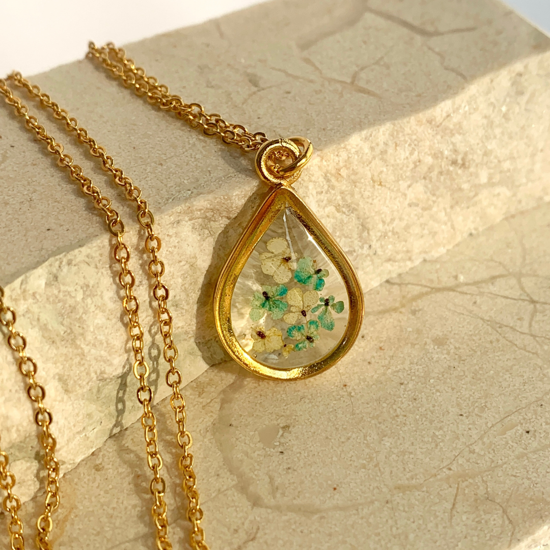 After the flowers have completed the drying process, each one is carefully cut into tiny pieces. Each flower piece is fixed with resin and protected. In this way, the elegant texture of nature is preserved for a long time and becomes immortal in the jewelry. Every detail is meticulously processed and gives life to the jewelry.