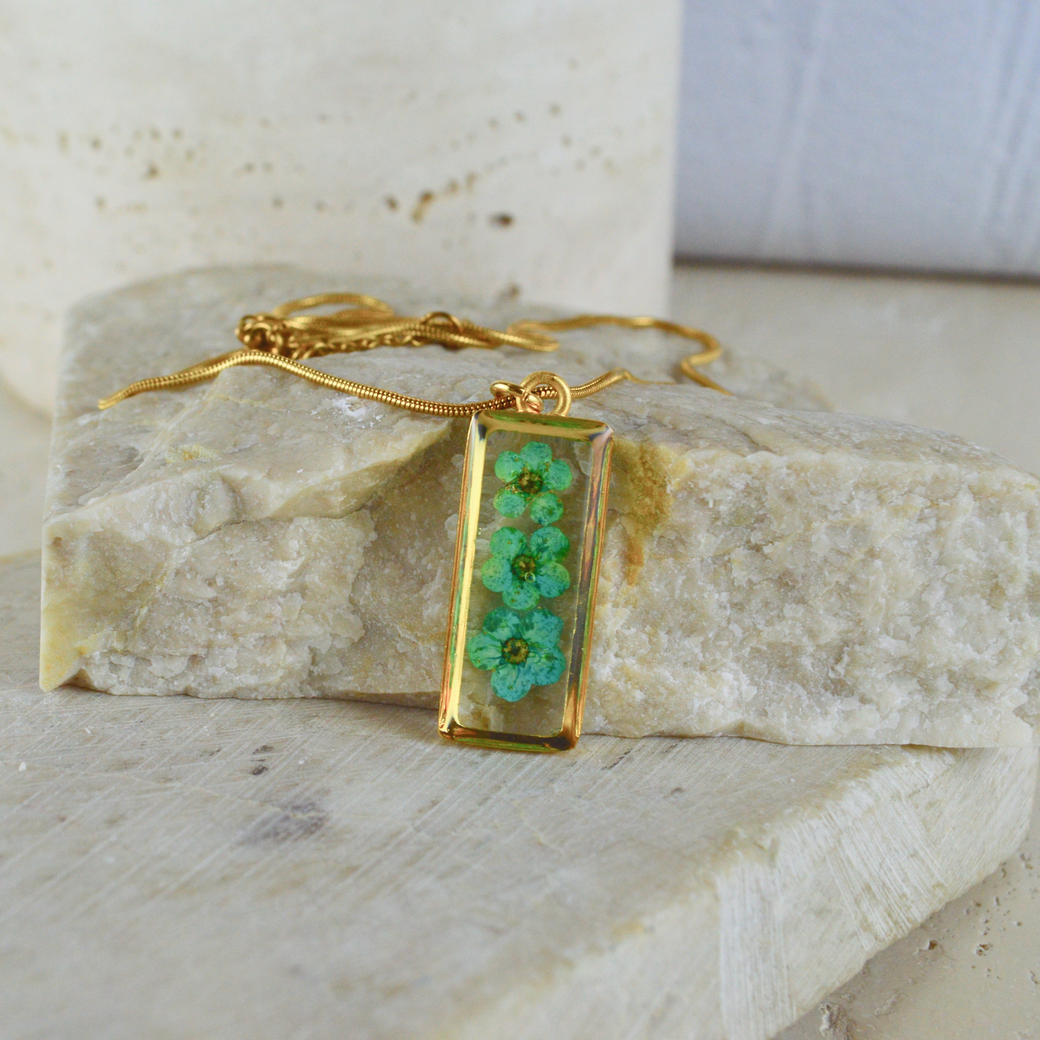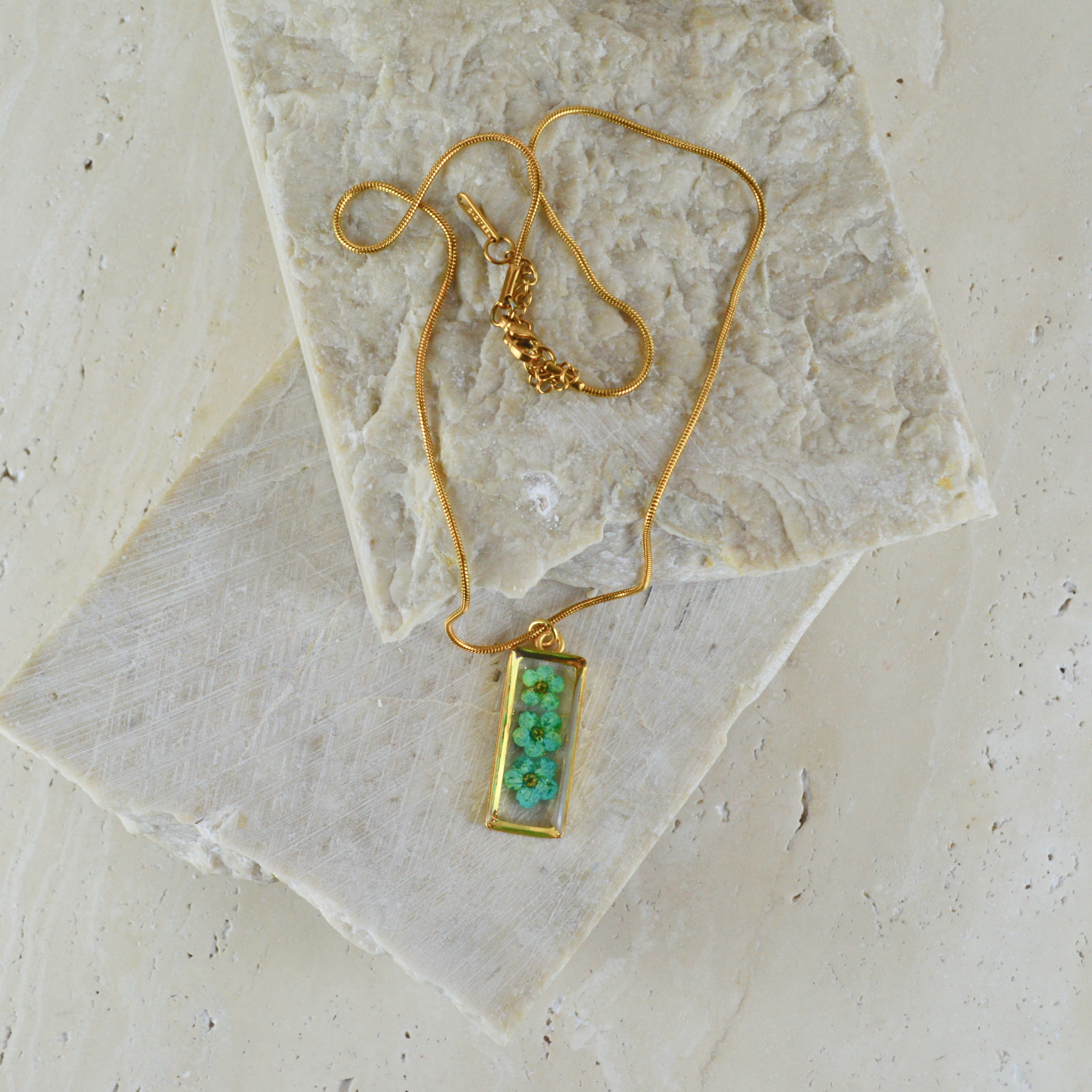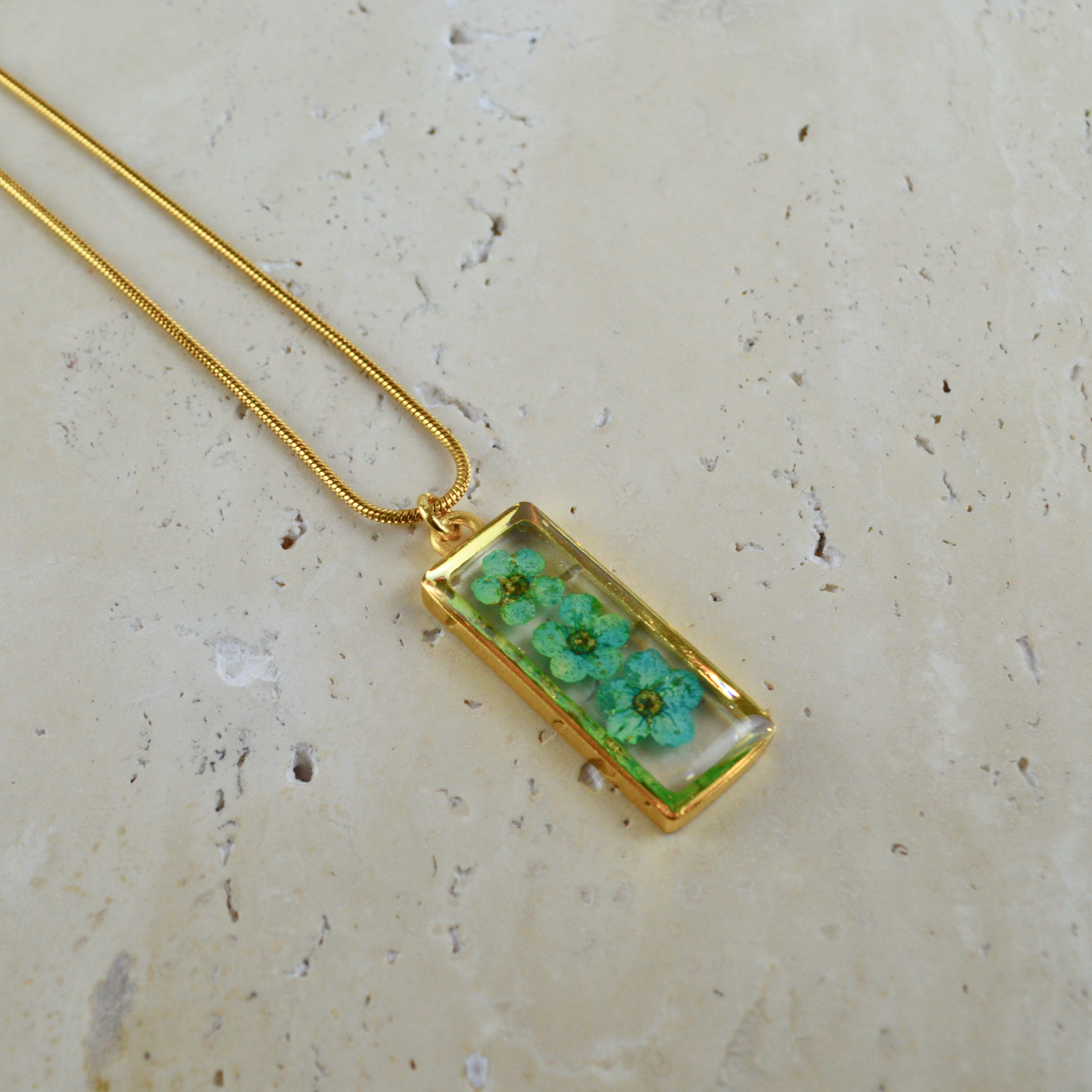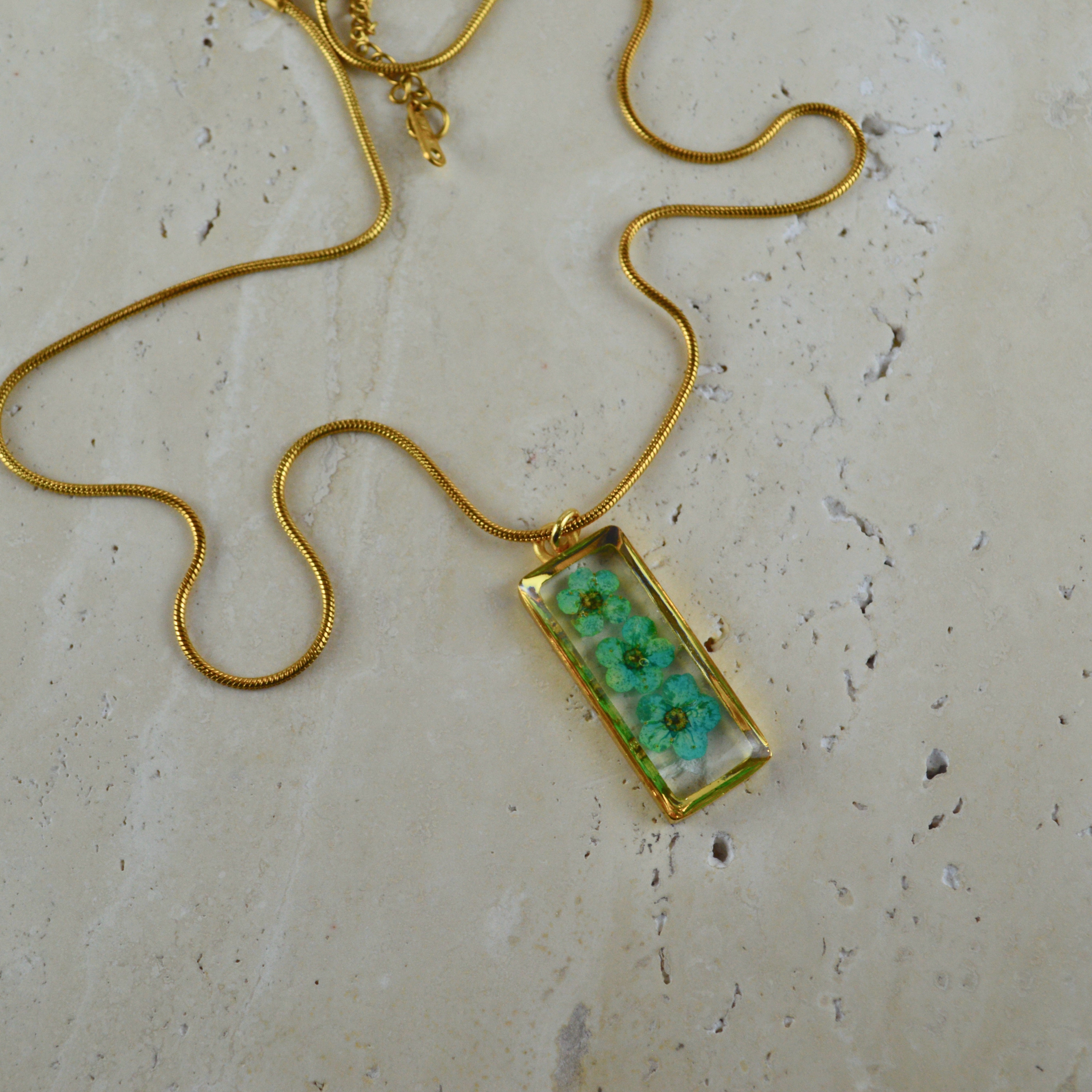 Çiçekler kuruma sürecini tamamladıktan sonra, her biri özenle minik parçalara ayrılır. Her bir çiçek parçası, reçine ile sabitlenerek koruma altına alınır. Bu sayede doğanın zarif dokusu uzun süre bozulmadan korunur ve takıların içinde ölümsüzleşir. Her detay, titizlikle işlenir ve takıya hayat verir.